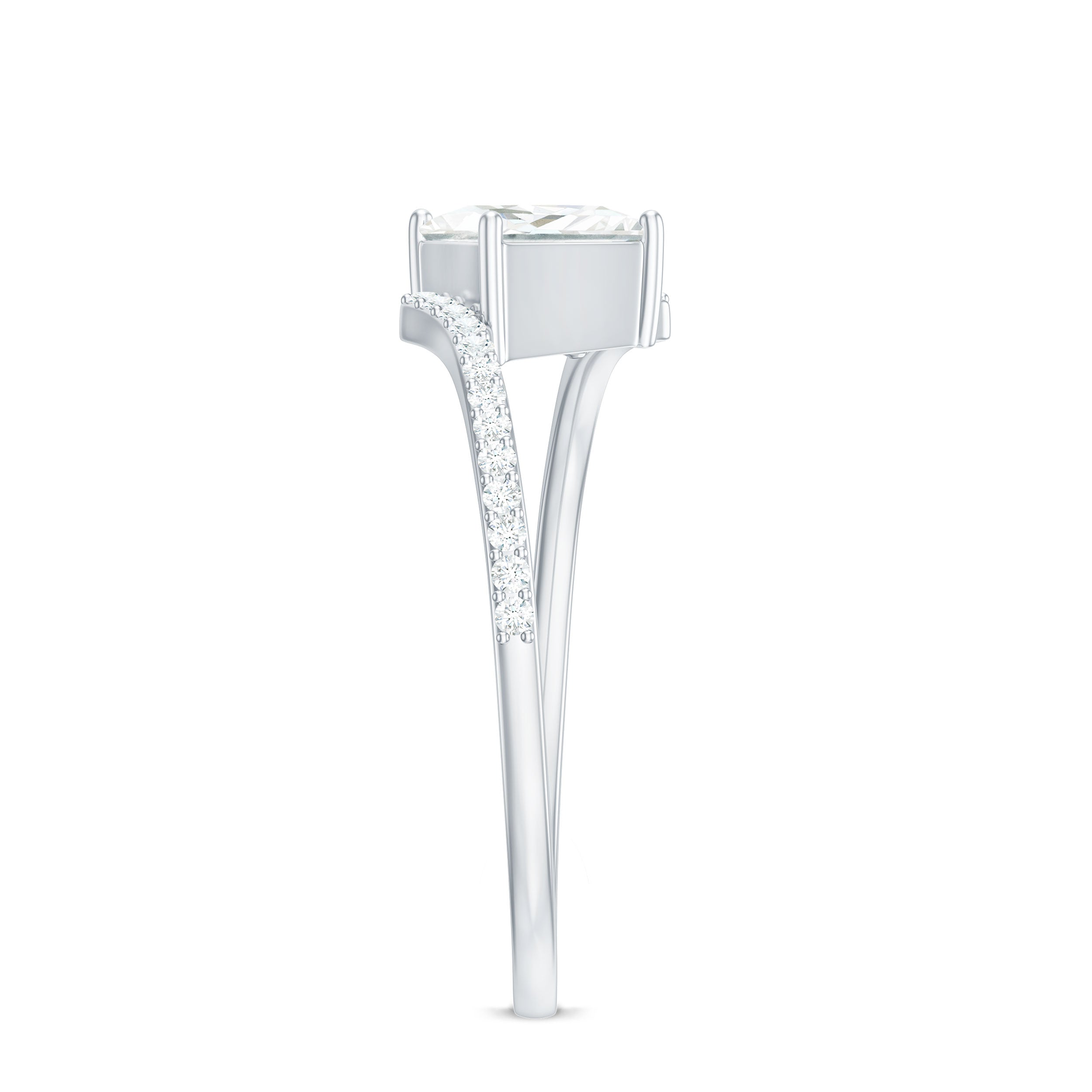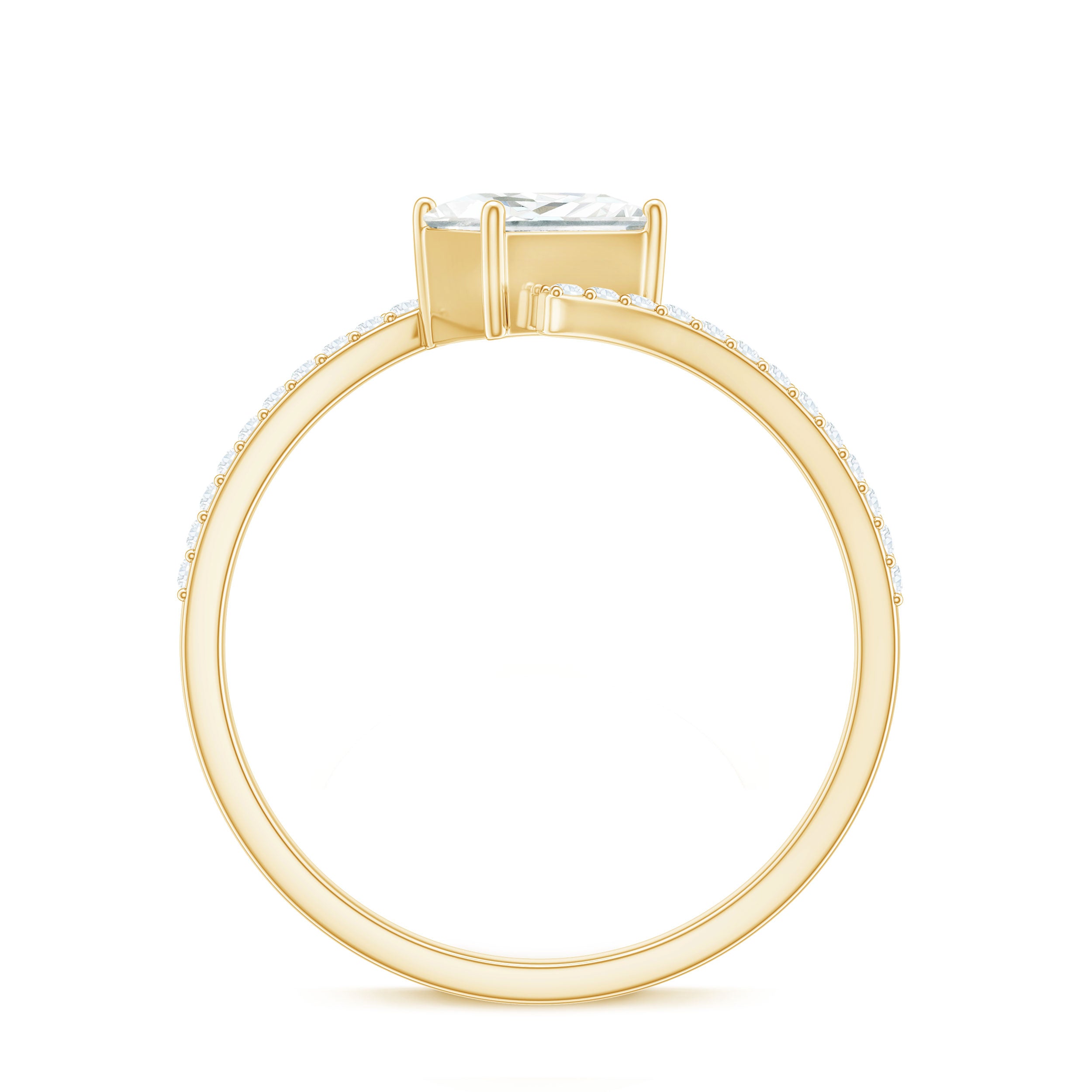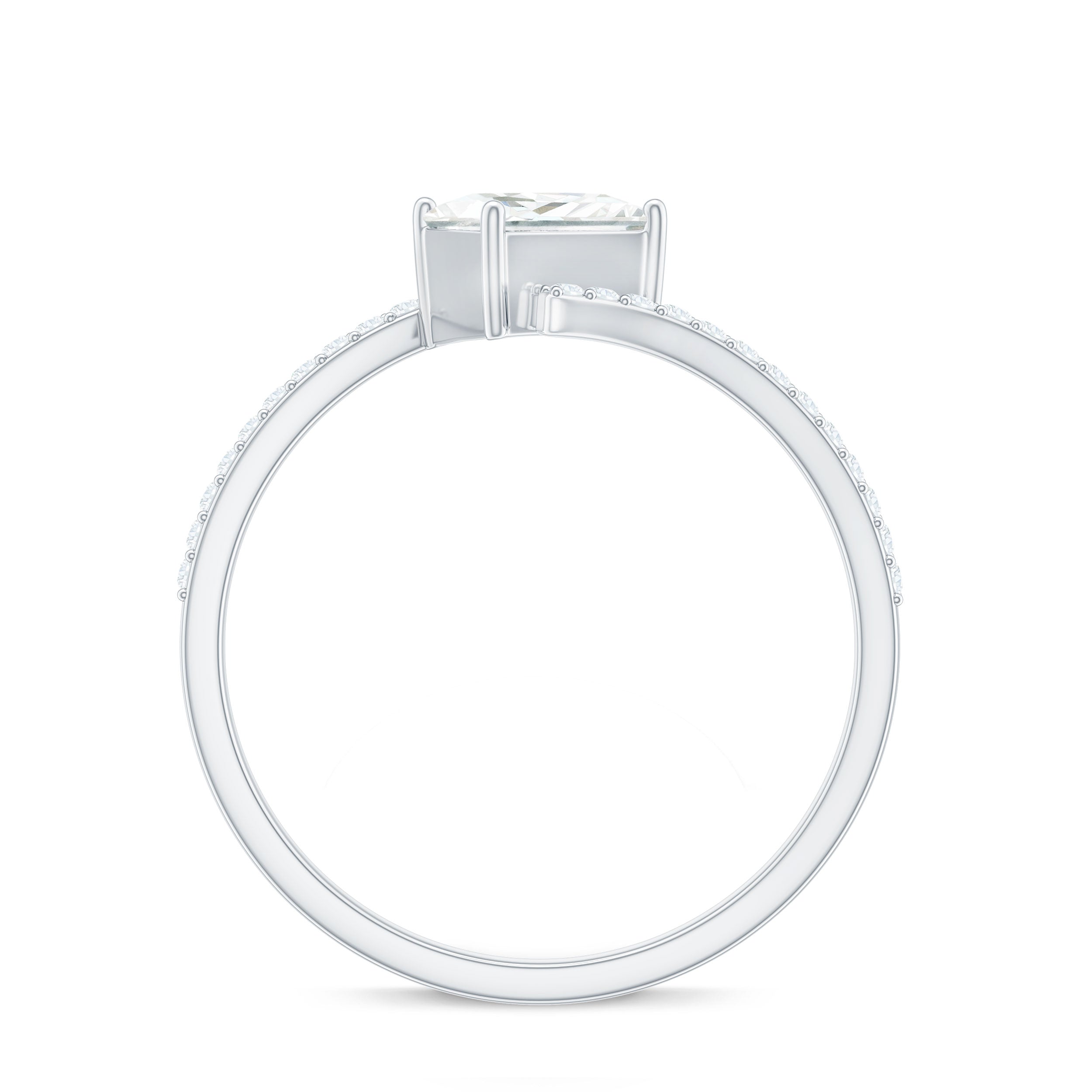 Designed with elegance and charm, and cherished by everyone who gazes upon it, this opulent enchanted Engagement Ring boasts a radiant sparkle that may surpass even a true loves kiss. This Solitaire Bypass Ring showcases a 5 mm princess cut Moissanite prominently set in a prong setting in a tilted style. What makes this Square Engagement Ring more special is, its bypass shank which is embellished with tiny round shape moissanite stones. A ring of such exquisite design and truly dazzling brilliance is sure to make your princess heart flutter. The elegant and minimalist bypass shank gracefully curves to embrace the shimmering heart, merging traditional allure with a contemporary form that not only provides a modern look but also safeguards the stone, making this 1 Carat Moissanite Ring ideal for regular wear with all necessary precautions. Meticulously handcrafted, this Princess Cut Moissanite Ring is available in various high-quality metal purity options and colors. Moreover, it comes in US standard sizes ranging from 3 to 13, ensuring a perfect fit for every hand. Whether it is for a proposal, an anniversary, or a special moment shared between the two of you, this Solitaire Moissanite Ring is a timeless treasure that she will cherish for a lifetime. A classic design intended to evoke feelings — just as yours did when you found your soulmate.