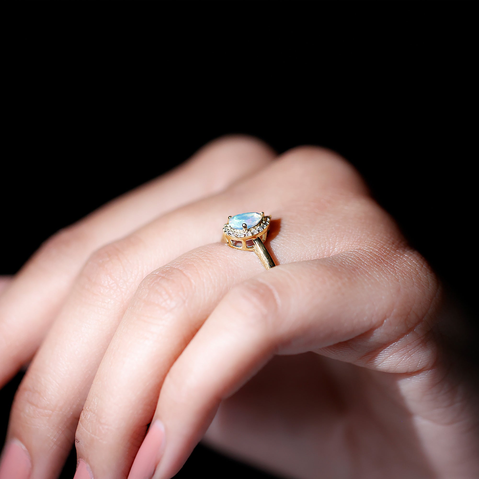 Radiate elegance and emotion with this mesmerizing Teardrop Engagement Ring, a breathtaking piece that captures the magic of your love story. At the center sits a mesmerizing 5X7 mm Pear Shape Ethiopian Opal, glowing with dreamy hues that dance with the light. Its teardrop symbolizes both joy and the depth of emotion, making it a truly meaningful centerpiece. Surrounding the Opal is a dazzling halo of Diamond stones, adding brilliance, contrast and timeless glamour. The delicate Halo enhances the natural glow of Opal, creating a luminous effect that draws all eyes to the center. Perfect for anyone who embraces individuality, this Opal Diamond Engagement Ring blends modern sophistication with celestial charm. Every detail, from the graceful curve of pear shape to the sparkle-studded halo, is designed to make the moment unforgettable. Packaged in a beautiful jewelry box and available in various ring sizes, this Halo Engagement Ring with Opal is ready for your once-in-a-lifetime moment. Say yes to a ring that is as unique, radiant and full of soul as your love itself.