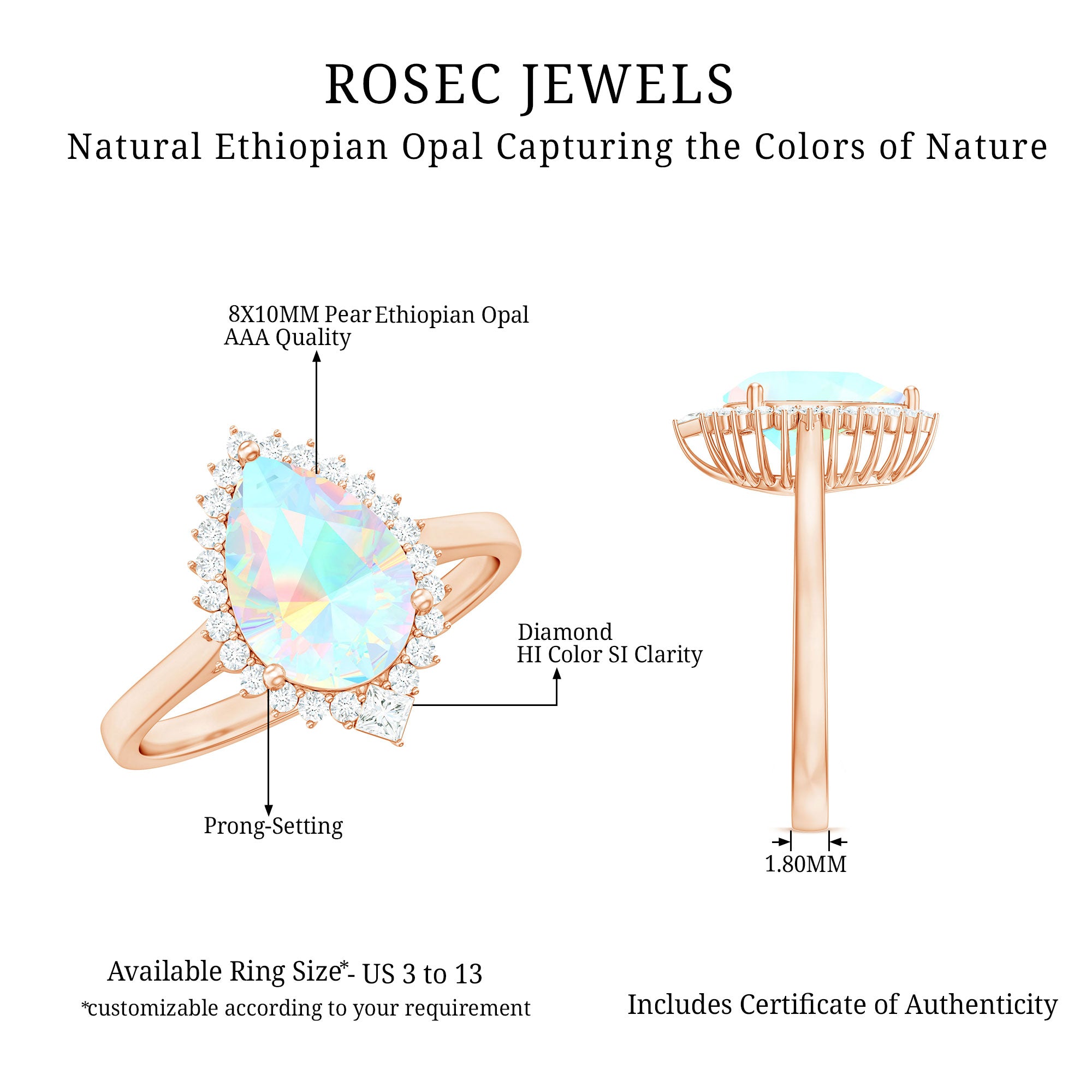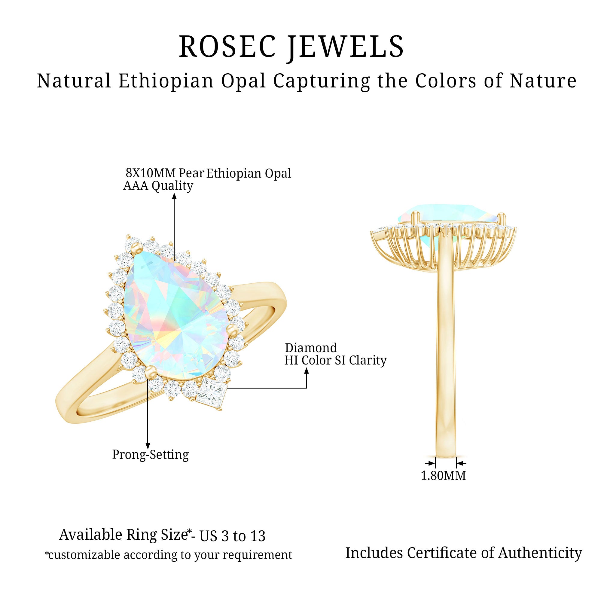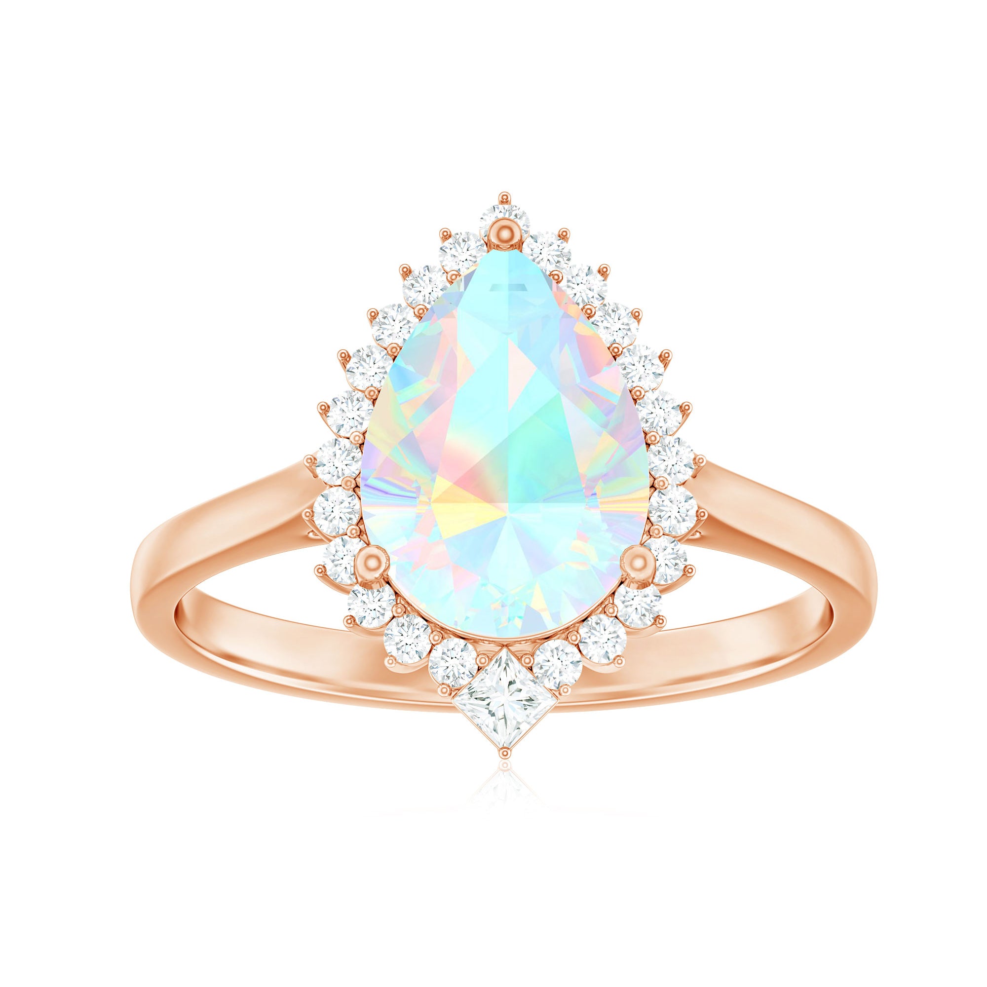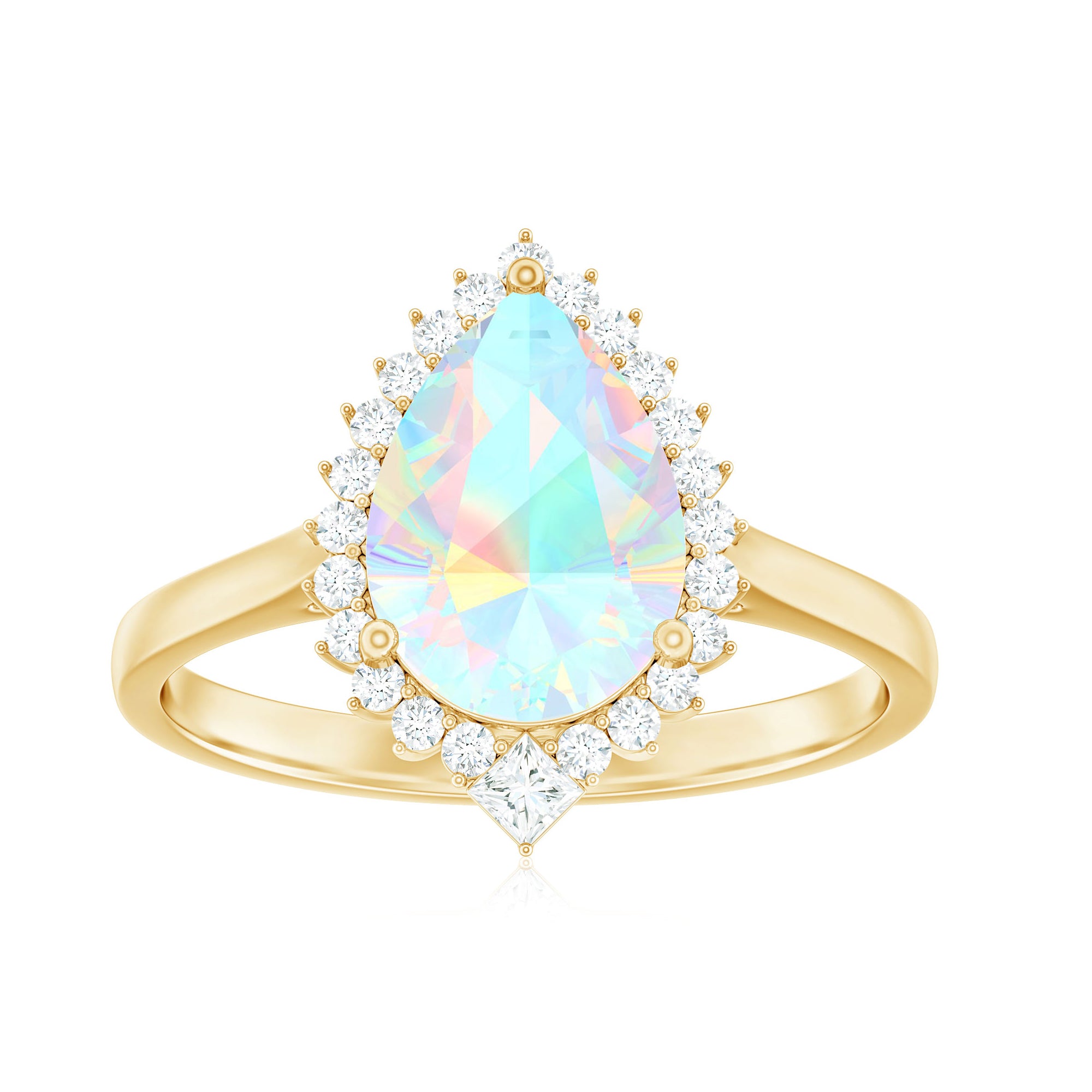 Let your forever begin with a ring as magical as your love. This Teardrop Engagement Ring is pure enchantment, ready to impress and make a statement. The centerpiece is a big 8X10 mm Pear Shape Ethiopian Opal set in Prong Setting, glowing with a dreamy play of colors that shift and shimmer like a rainbow. Encircling the AAA Quality Opal is a shimmering Halo of Round Shape Diamond stones, adding sparkle to every glance. Placed diagonally at the curve of the Teardrop is a Princess Cut Diamond, a unique and thoughtful detail that adds a touch of regal charm to this already breathtaking piece. Perfect for a romantic proposal or a surprise, this Opal Diamond Engagement Ring is crafted with care and offered in various ring sizes to ensure the perfect fit. Arriving in an elegant jewelry box, this Pear Shaped Engagement Ring is ready for that unforgettable yes moment. Ethereal and elegant, this Halo Engagement Ring with Opal is a celebration of love that is meant to last forever.
