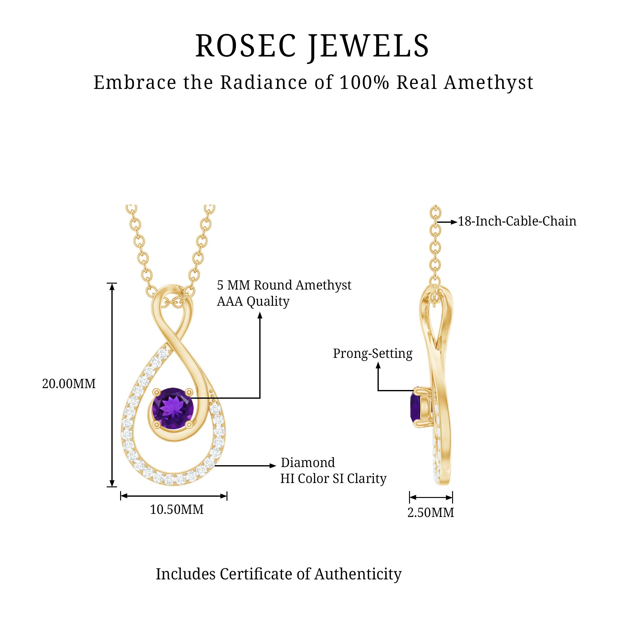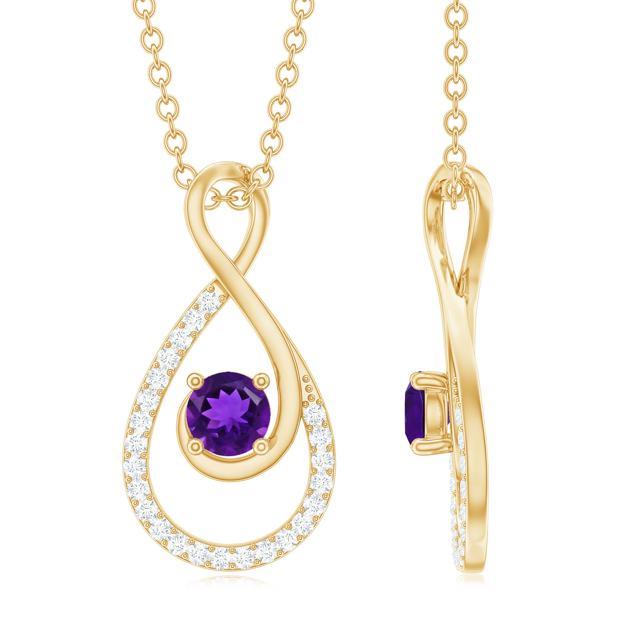 This Amethyst Love Knot Pendant exudes a bright hue that can be paired with any outfit to complete the look. It features 5 MM Round Shape Amethyst nested in a glittering infinity frame, held firmly in a 4 Prong Setting in this pendant necklace. A shimmery round Diamond adorns the twisted metal strips that form an ornate infinity. The additional metal detailing adds a fresh aesthetic to this Infinity Pendant Necklace.
