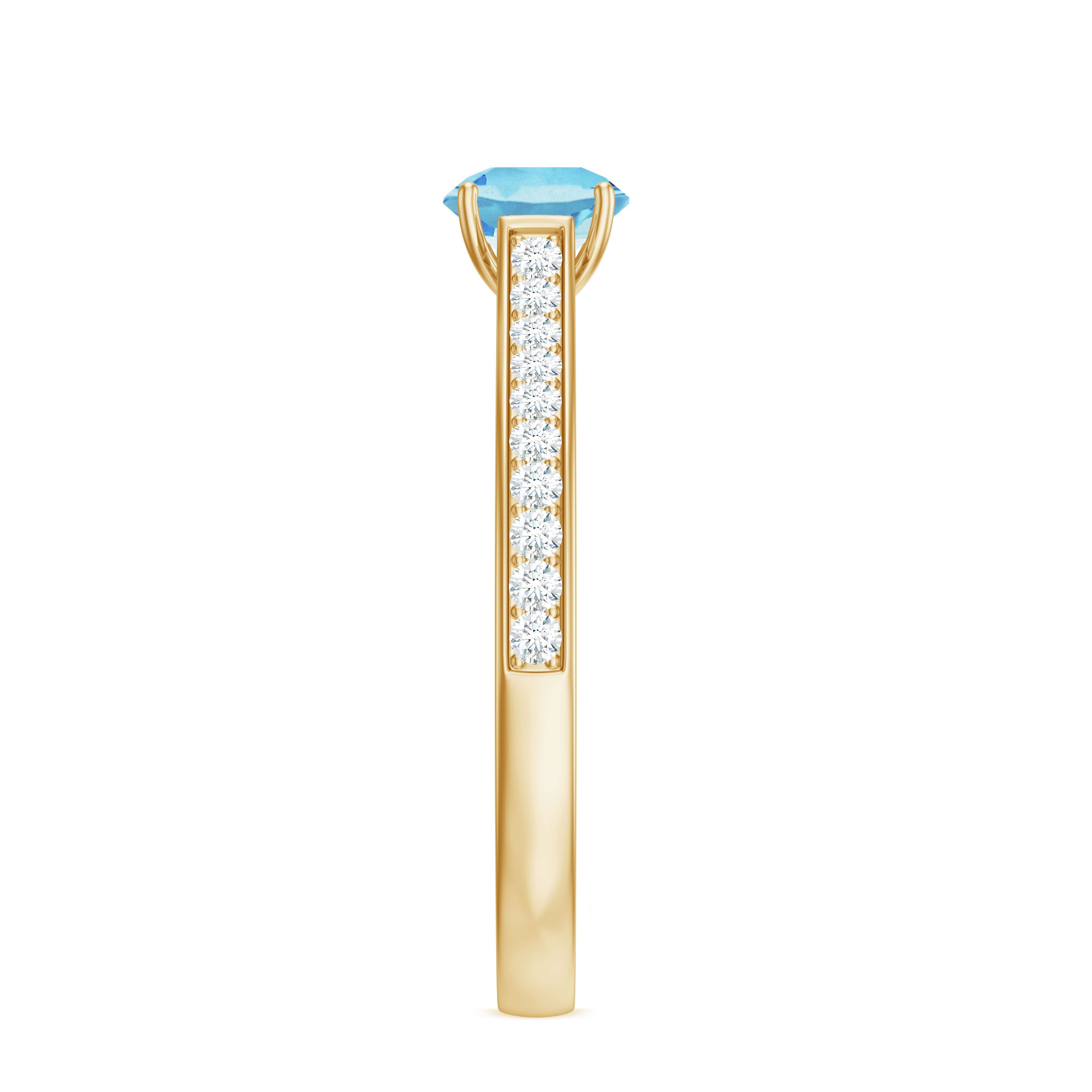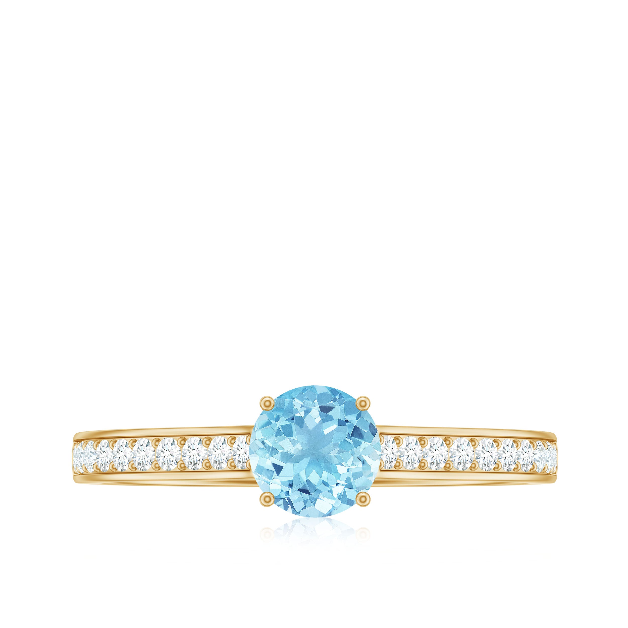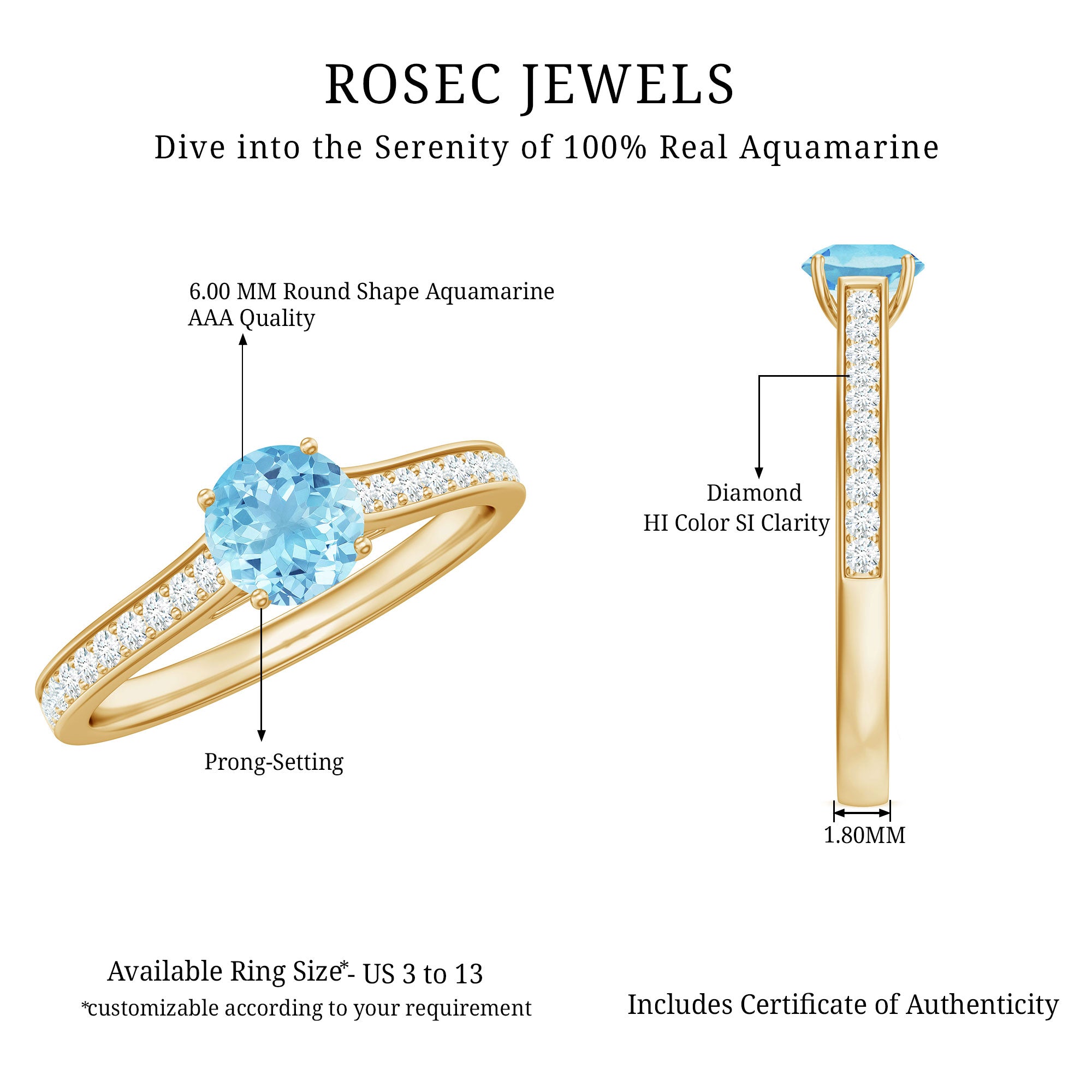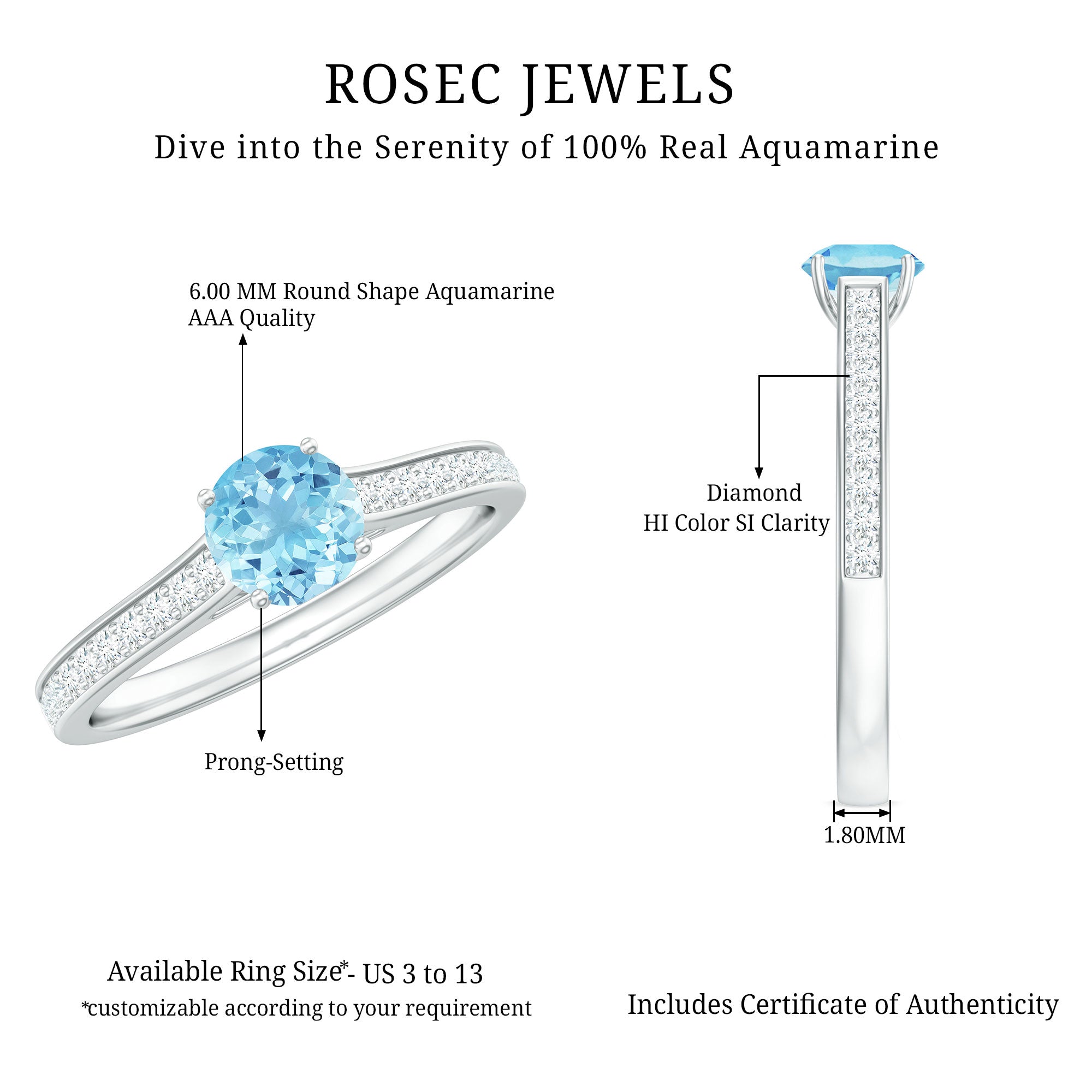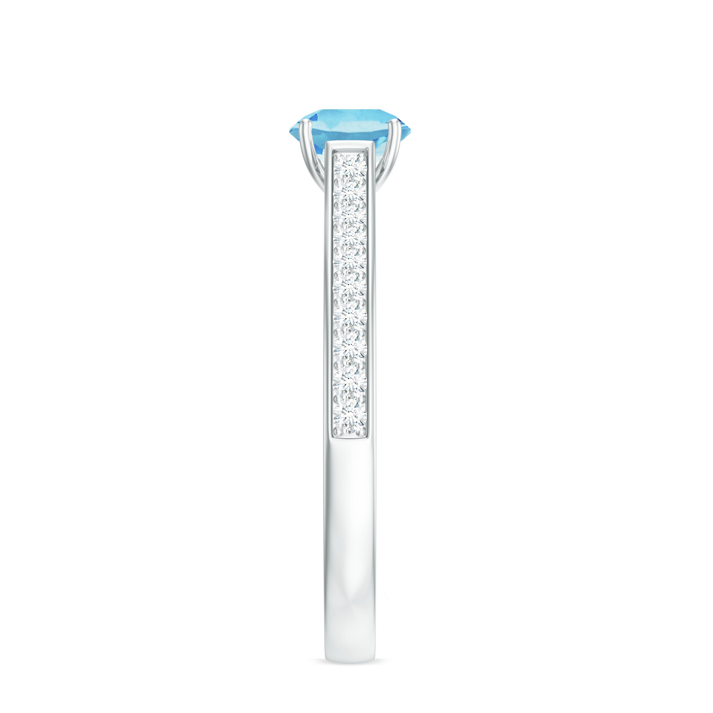 Indulge in the serene beauty of everlasting love with this Aquamarine Solitaire Ring, a piece designed to celebrate both elegance and devotion. At its center, a stunning 6 mm Round Shape Aquamarine gemstone radiates a soft blue hue, symbolizing clarity, loyalty and the enduring nature of true love. Flanking the center stone, dazzling Diamond Side Stones catch the light from every angle, enhancing the brilliance of AAA Quality Aquamarine while adding a subtle touch of sparkle and sophistication. Available in various ring sizes and presented in a signature jewelry box, this Aquamarine Diamond Ring is perfect for proposals, anniversaries or as a meaningful gift to mark a milestone in your love story. The graceful design allows it to shine alone or pair beautifully with other treasured pieces, making this Aquamarine Engagement Ring a versatile and cherished addition to any jewelry collection. Romantic and thoughtfully crafted, this Solitaire Engagement Ring with Aquamarine embodies the strength and enduring beauty of your commitment.