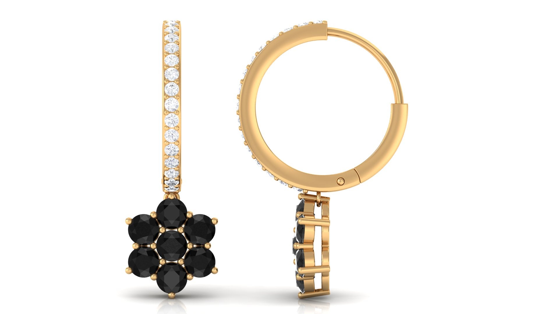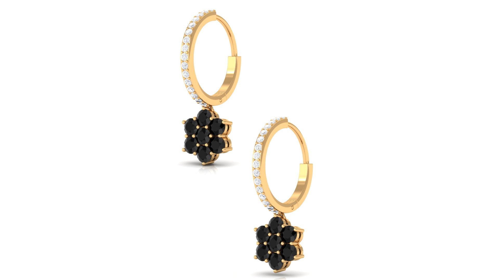 Bloom with confidence and charm wearing these exquisite Flower Drop Earrings, designed to capture the beauty of nature in every detail. Each earring features a delicate Flower crafted from lustrous 3 mm Round Shape Black Onyx gemstones set in Prong Setting, gracefully hanging from a Diamond studded Hinged Hoop that adds a brilliant touch of sparkle. The contrast between the deep Black hue of the AAA Quality Onyx and the radiant shimmer of the HI-SI Diamond stones creates a look that is both bold and feminine. Elegant and comfortable, these Black Onyx Drop Earrings move beautifully with you, adding a hint of sophistication to both casual and formal outfits. Whether you’re attending a romantic dinner or elevating your everyday style, they bring a sense of timeless elegance and grace to any occasion. Presented in a signature jewelry box, these Black Onyx Diamond Earrings arrive ready to gift, perfect for birthdays, anniversaries or simply to make someone’s day special. Romantic and effortlessly stunning, these Hinged Hoop Earrings are a celebration of beauty, confidence and everlasting style.