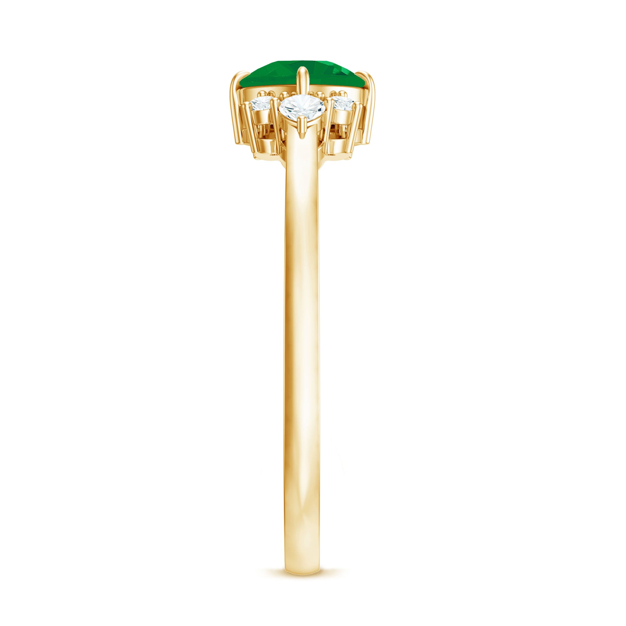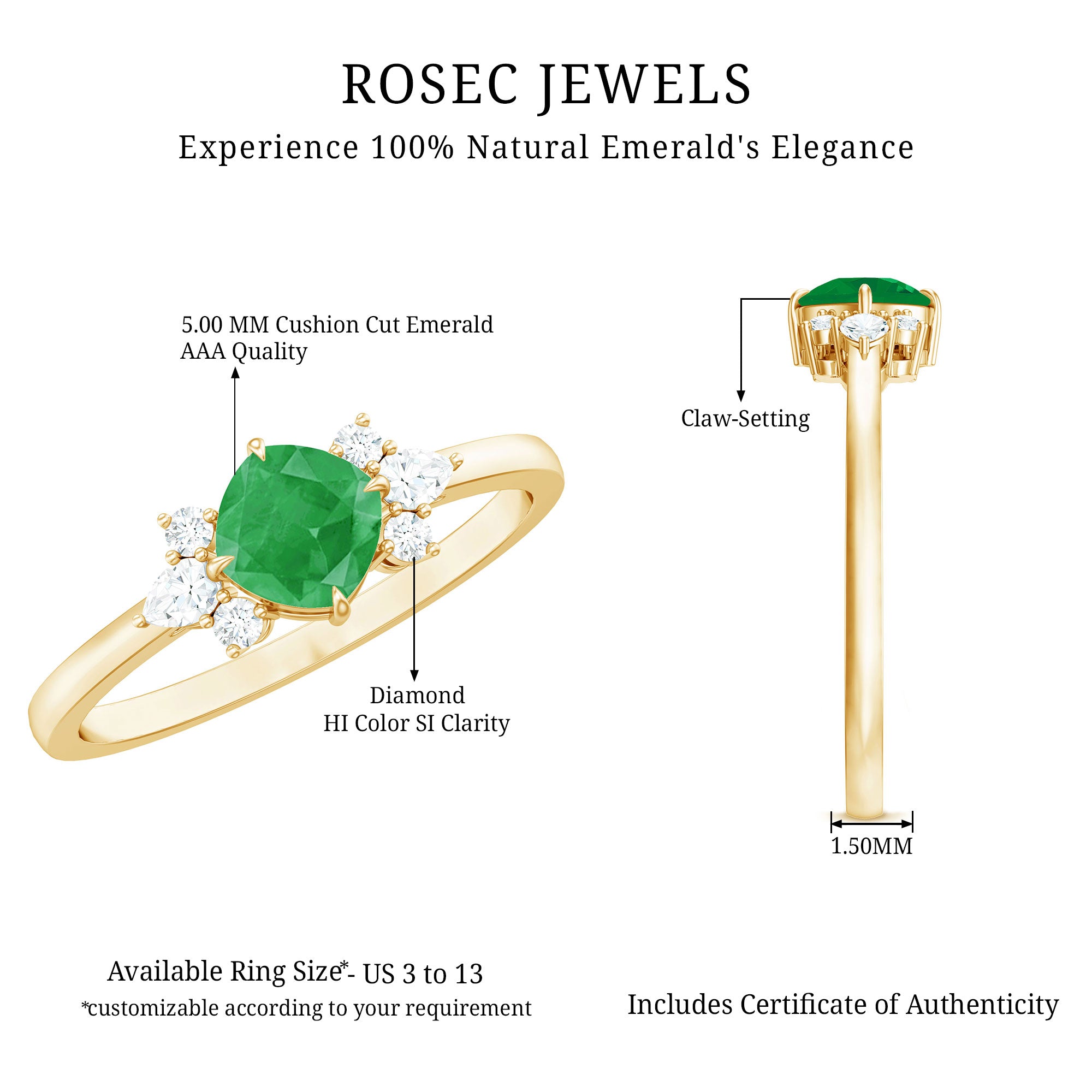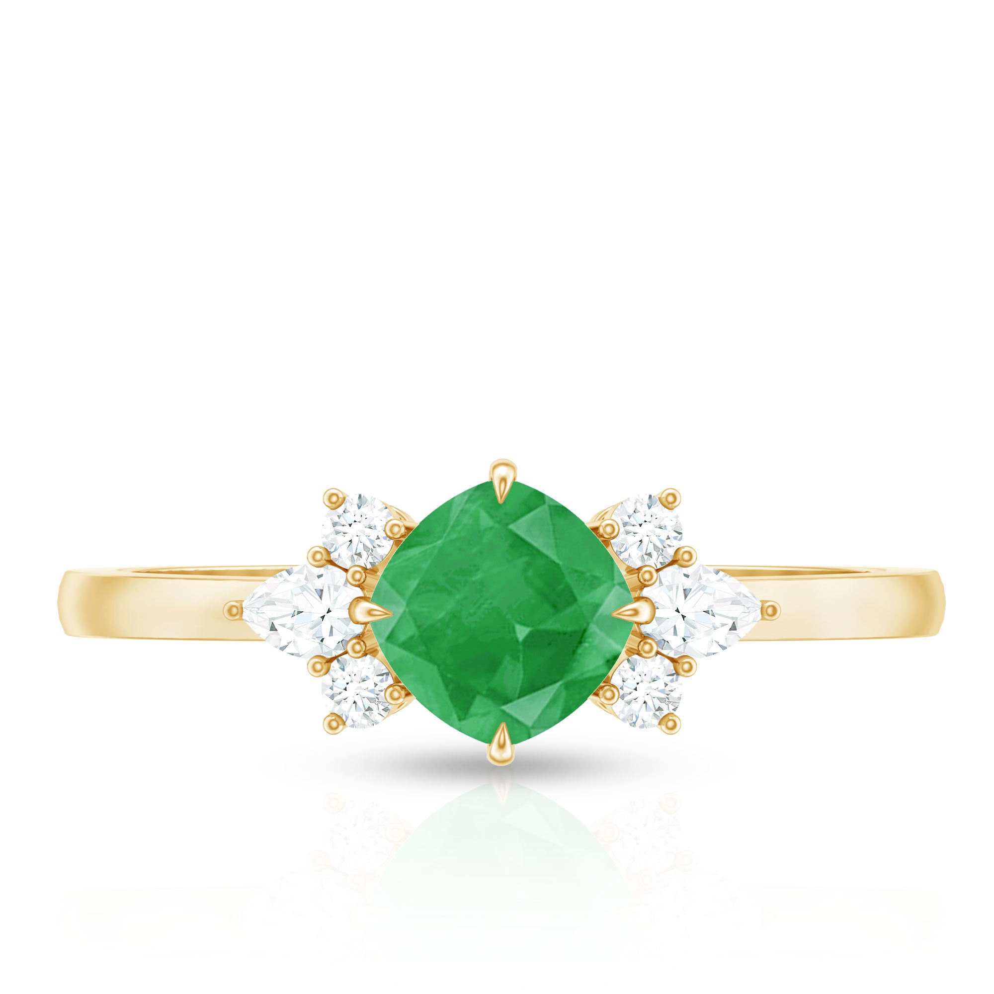Love begins with a promise and this Emerald Engagement Ring captures that moment in the most enchanting way. The center 5 mm Cushion Cut Emerald stone is diagonally placed in Claw Setting. Framing it on each side, a graceful trio of Pear and Round Shape Diamond stones adds a touch of radiance. Together, they form a symphony of light that celebrates the beauty of two souls becoming one. Designed to capture hearts, this Minimal Engagement Ring combines classic charm with modern artistry, creating a look that feels timeless yet irresistibly fresh. Presented in an elegant jewelry box and available in various sizes, this Emerald Diamond Ring is ready to become the centerpiece of a story written in forever. Whether given in a moment of quiet tenderness or as part of a grand gesture, this Emerald Ring for Women transforms a promise into something eternal. This Real Emerald Ring is a reflection of a love that is rare, radiant and beautifully real.