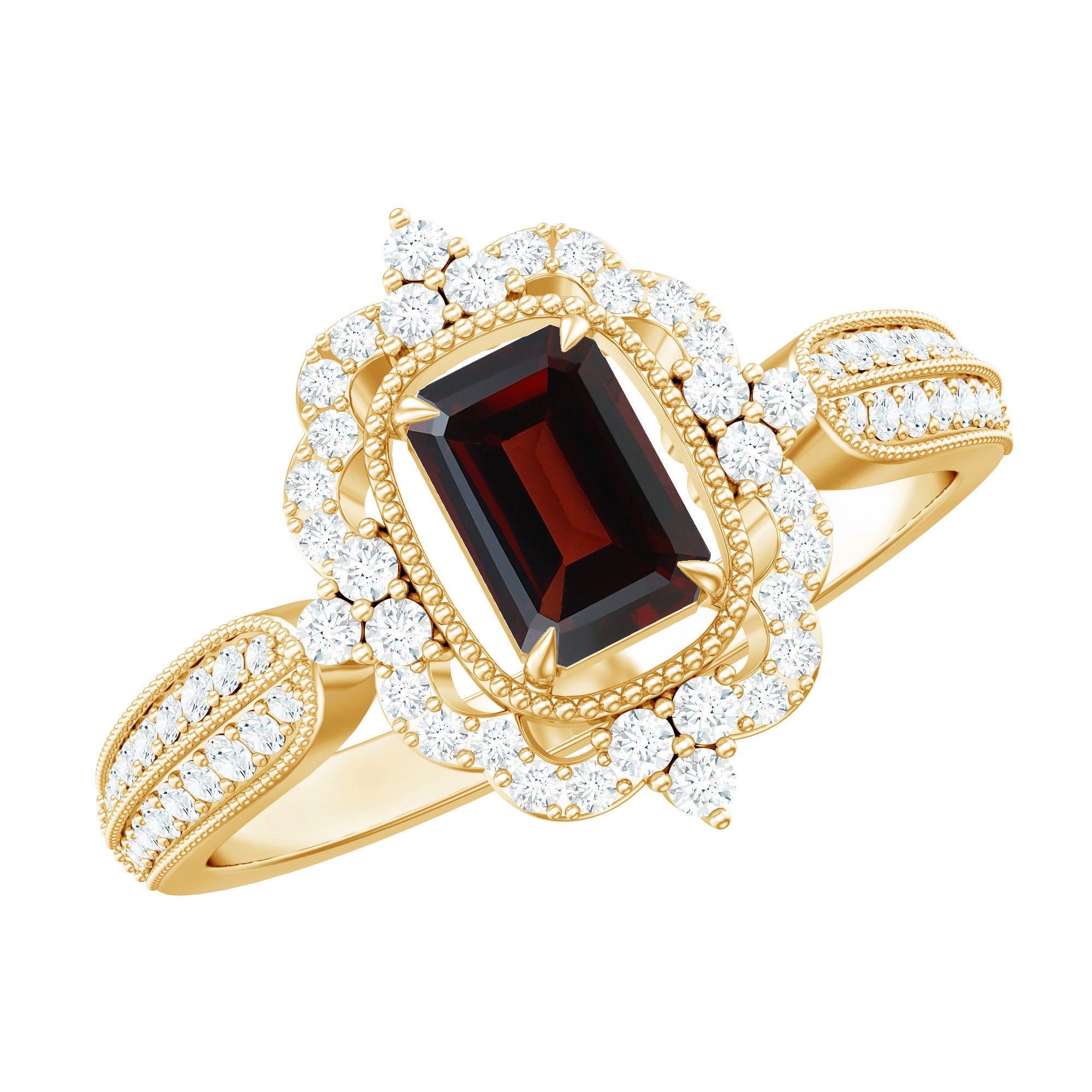 Timeless yet full of modern charm, this Vintage Looking Engagement Ring is the perfect symbol of eternal love. The deep, rich 4X6 mm Garnet at its center in Claw Setting radiates warmth and passion, beautifully framed by a sparkling Diamond Halo that catches the light from every angle. Intricate Side Stones and delicate Beaded Detailing add a touch of vintage elegance, creating a ring that feels both classic and uniquely personal. Crafted with care and available in various US sizes, this Emerald Cut Engagement Ring is designed to fit perfectly while celebrating the special bond between two hearts. Whether it is a proposal, anniversary or a meaningful gift, this Garnet Diamond Engagement Ring tells a story of love that lasts a lifetime. Delivered in a signature jewelry box, this Red Garnet Ring is ready to surprise and delight the one who holds your heart. Pair it with your favorite outfit or wear it as a statement piece. With every glance, this Halo Engagement Ring with Garnet captures the essence of romance, timeless elegance and commitment, making it a cherished promise you can wear every day.