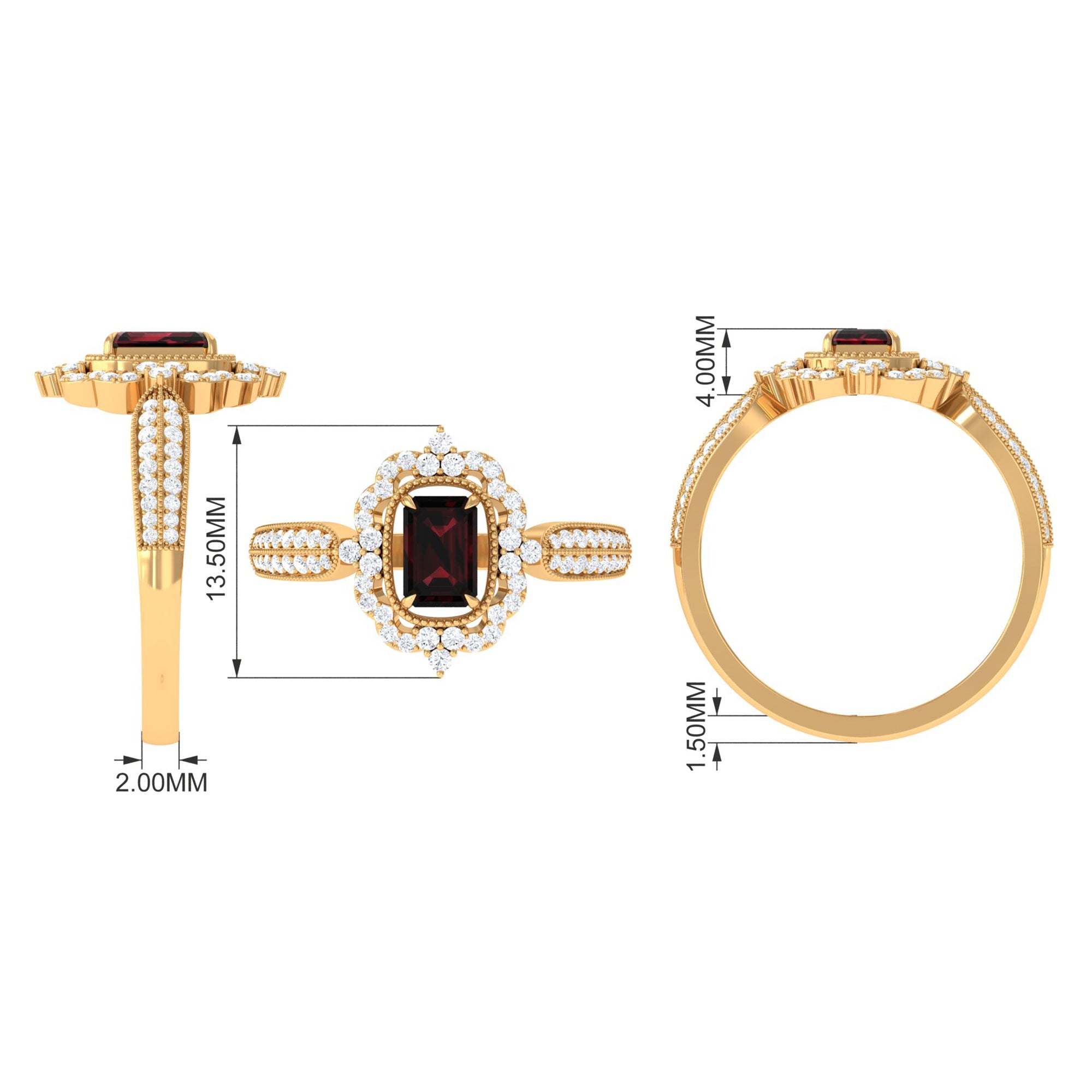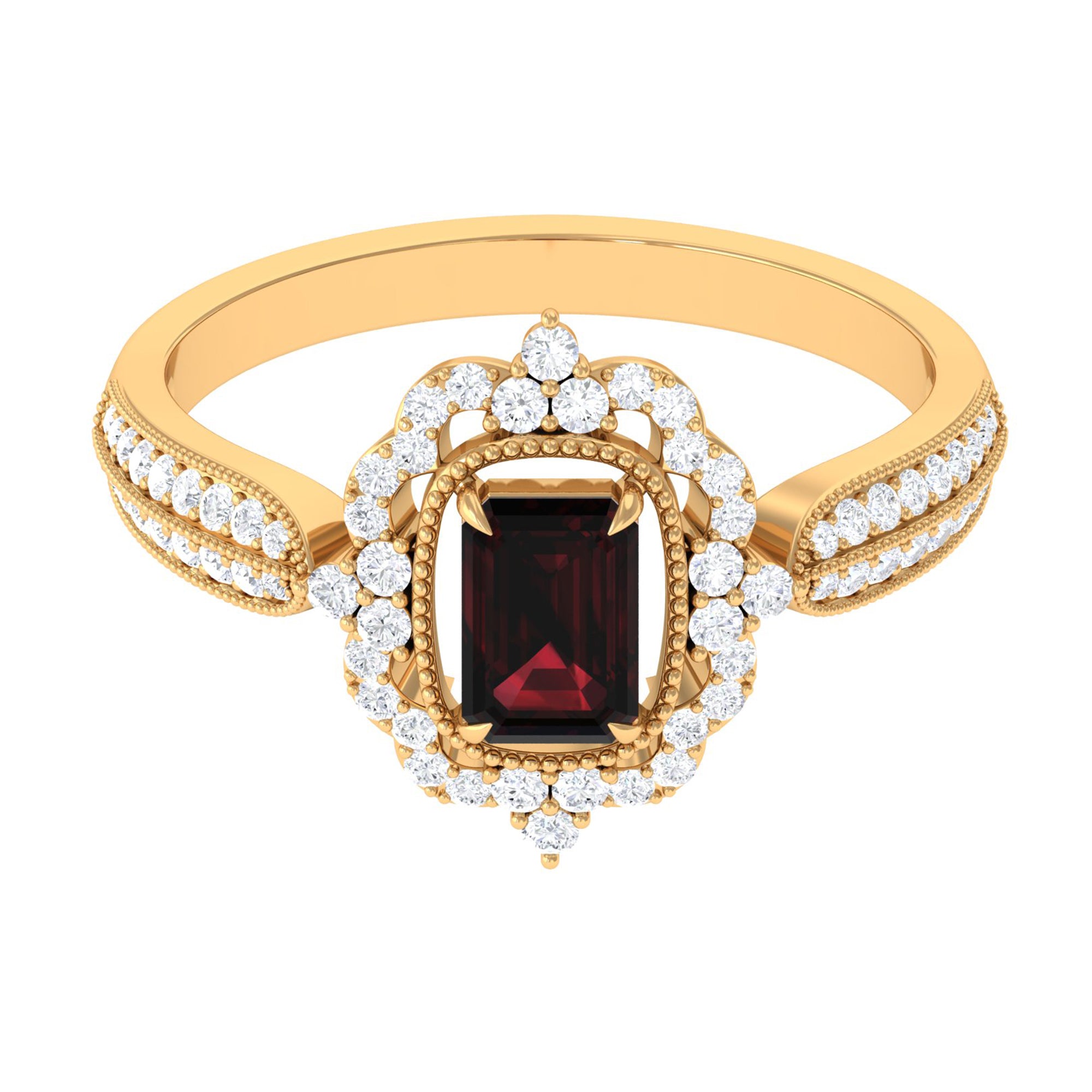 Timeless yet full of modern charm, this Vintage Looking Engagement Ring is the perfect symbol of eternal love. The deep, rich 4X6 mm Garnet at its center in Claw Setting radiates warmth and passion, beautifully framed by a sparkling Diamond Halo that catches the light from every angle. Intricate Side Stones and delicate Beaded Detailing add a touch of vintage elegance, creating a ring that feels both classic and uniquely personal. Crafted with care and available in various US sizes, this Emerald Cut Engagement Ring is designed to fit perfectly while celebrating the special bond between two hearts. Whether it is a proposal, anniversary or a meaningful gift, this Garnet Diamond Engagement Ring tells a story of love that lasts a lifetime. Delivered in a signature jewelry box, this Red Garnet Ring is ready to surprise and delight the one who holds your heart. Pair it with your favorite outfit or wear it as a statement piece. With every glance, this Halo Engagement Ring with Garnet captures the essence of romance, timeless elegance and commitment, making it a cherished promise you can wear every day.