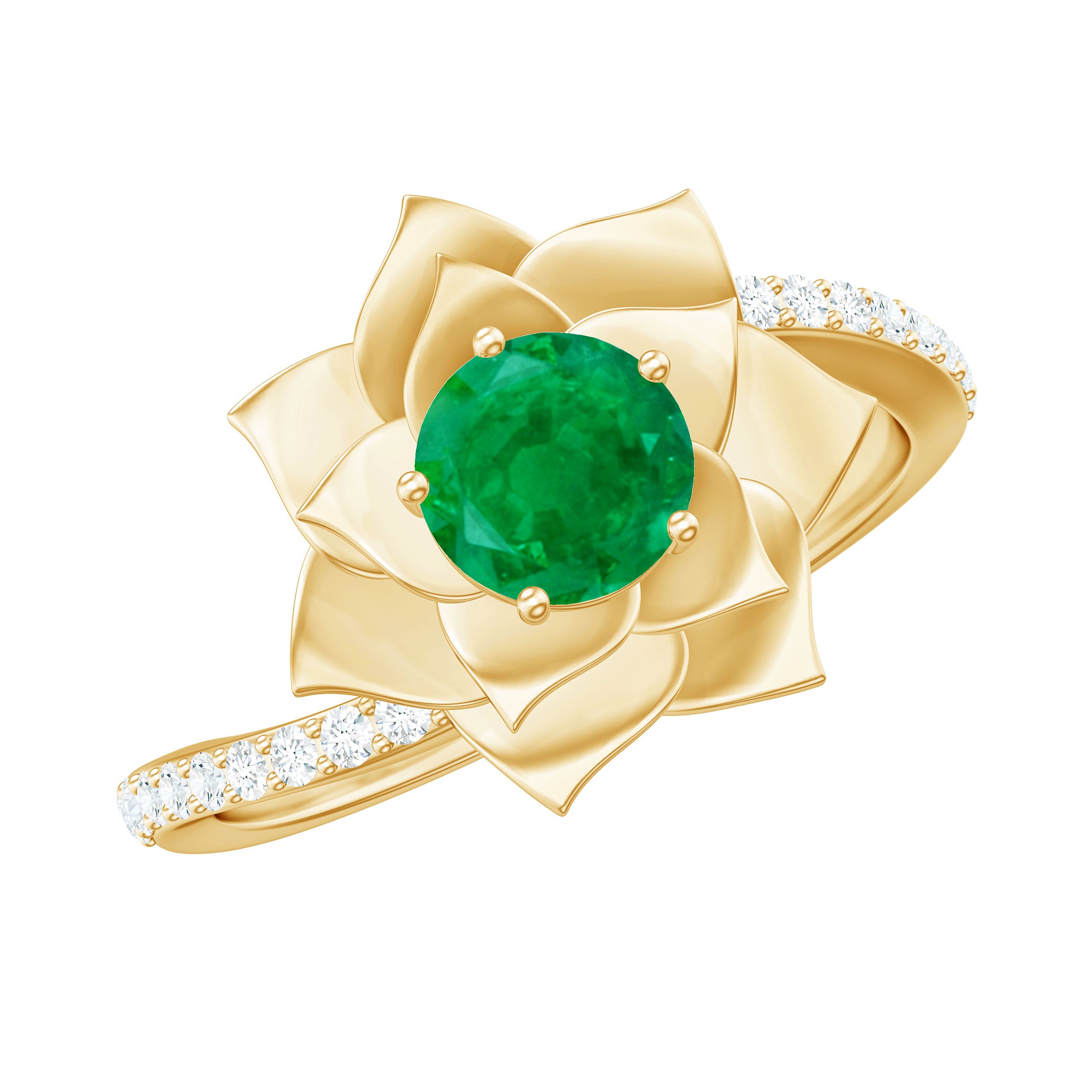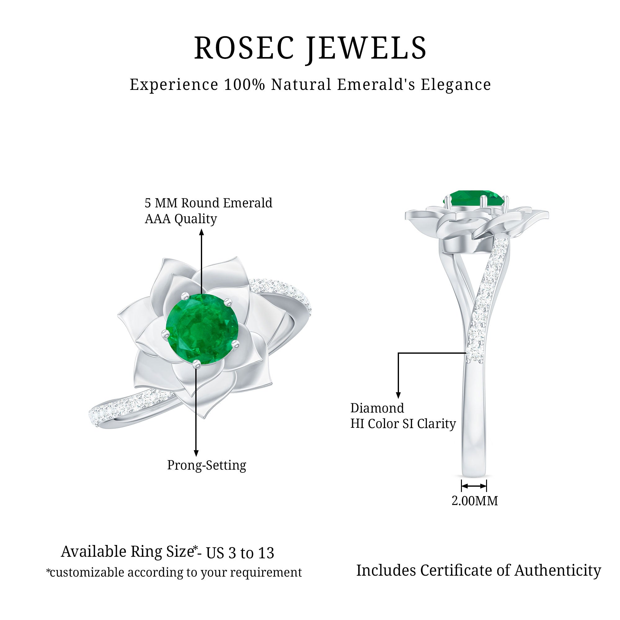 Bloom into forever with this enchanting Flower Engagement Ring, a design that blossoms with the beauty of love in full bloom. At its center, a vivid 5 mm Round Shape Emerald gemstone sits gracefully within a delicate Flower motif, symbolizing growth, passion and the natural elegance of true romance. The unique Diamond Bypass Shank curves gently around the centerpiece, sparkling with every movement and creating a graceful flow that mirrors the intertwining paths of two souls meant to be. Exquisitely crafted for the woman who cherishes beauty in every detail, this Emerald Diamond Engagement Ring radiates charm and the poetry of everlasting love. Whether for a heartfelt proposal, a romantic anniversary or a promise of devotion, this Bypass Engagement Ring arrives beautifully presented in a signature jewelry box and is available in multiple ring sizes for the perfect fit. Romantic and full of life, this Emerald Flower Ring is a garden of emotions, forever blooming on your hand.