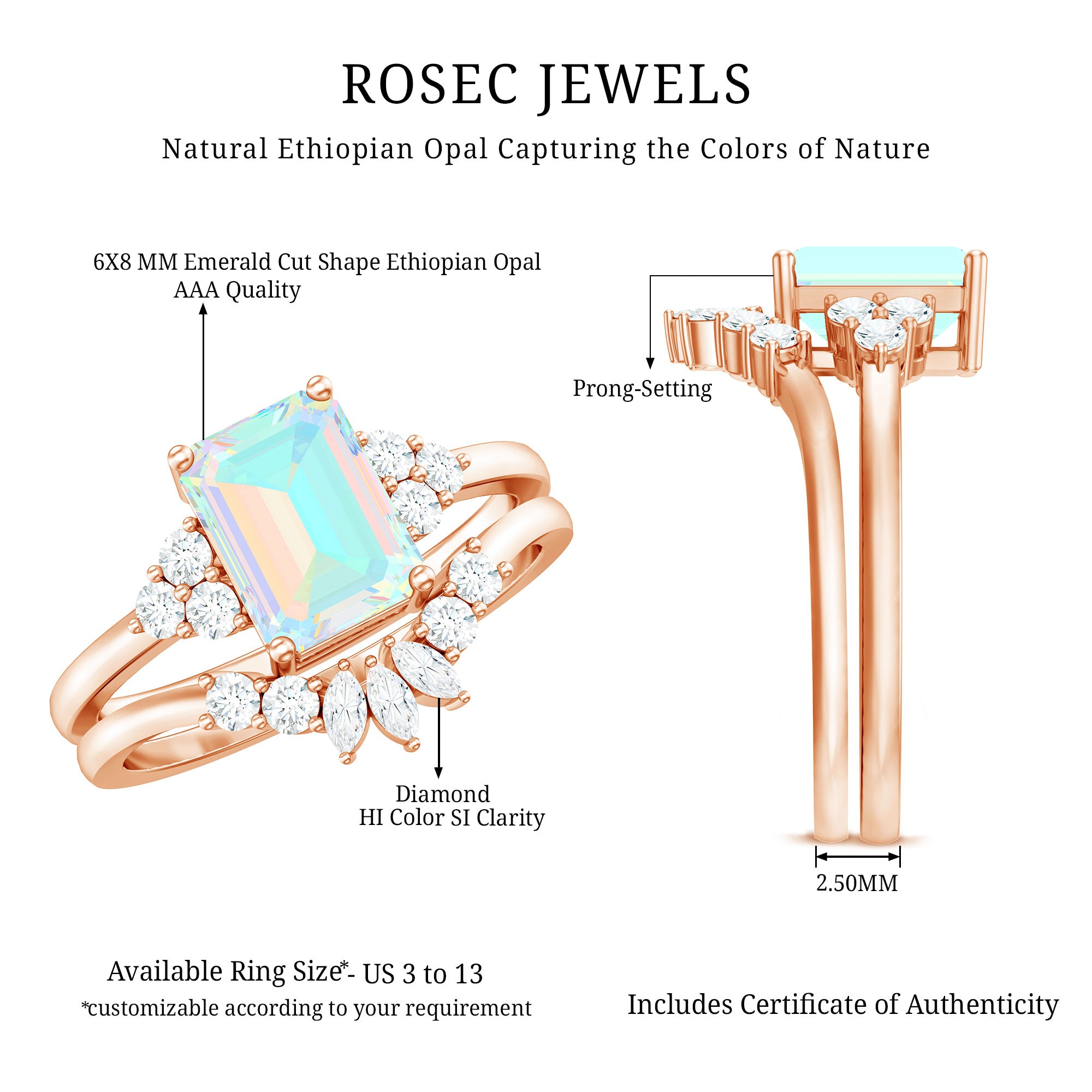 Say forever with the brilliance and bold beauty of this Wedding Bridal Ring Set, a breathtaking set designed to shine from every angle. At the center of the captivating Solitaire Engagement Ring of this 2 Piece Ring Set sits a 6X8 mm Emerald Cut Ethiopian Opal, glowing with a kaleidoscope of iridescent hues that symbolize hope, passion and an ever-evolving love. Flanked by the Diamond trio, the Emerald Cut Engagement Ring beautifully represents your love. Paired with a perfectly Curved Diamond Enhancer Band, this Wedding Engagement Ring Set creates a seamless, radiant design that hugs the center ring with graceful brilliance. Ideal for the bride who craves elegance with a touch of ethereal charm, this Opal Engagement Ring with Wedding Band is a perfect fusion of tradition and modern magic. Available in multiple ring sizes for a flawless fit and delivered in a signature jewelry box, this Engagement and Wedding Ring Set is proposal-ready and destined to be treasured for generations.