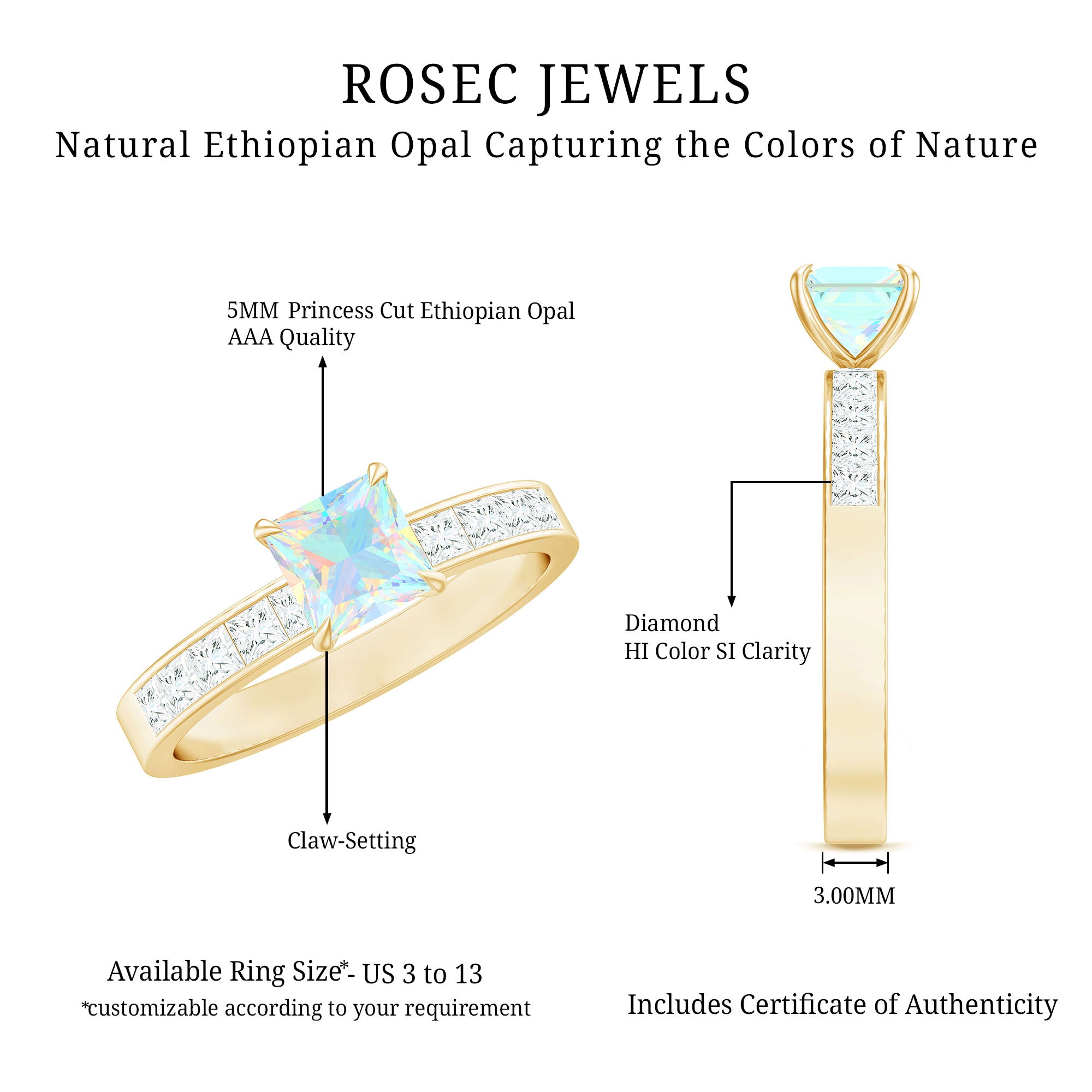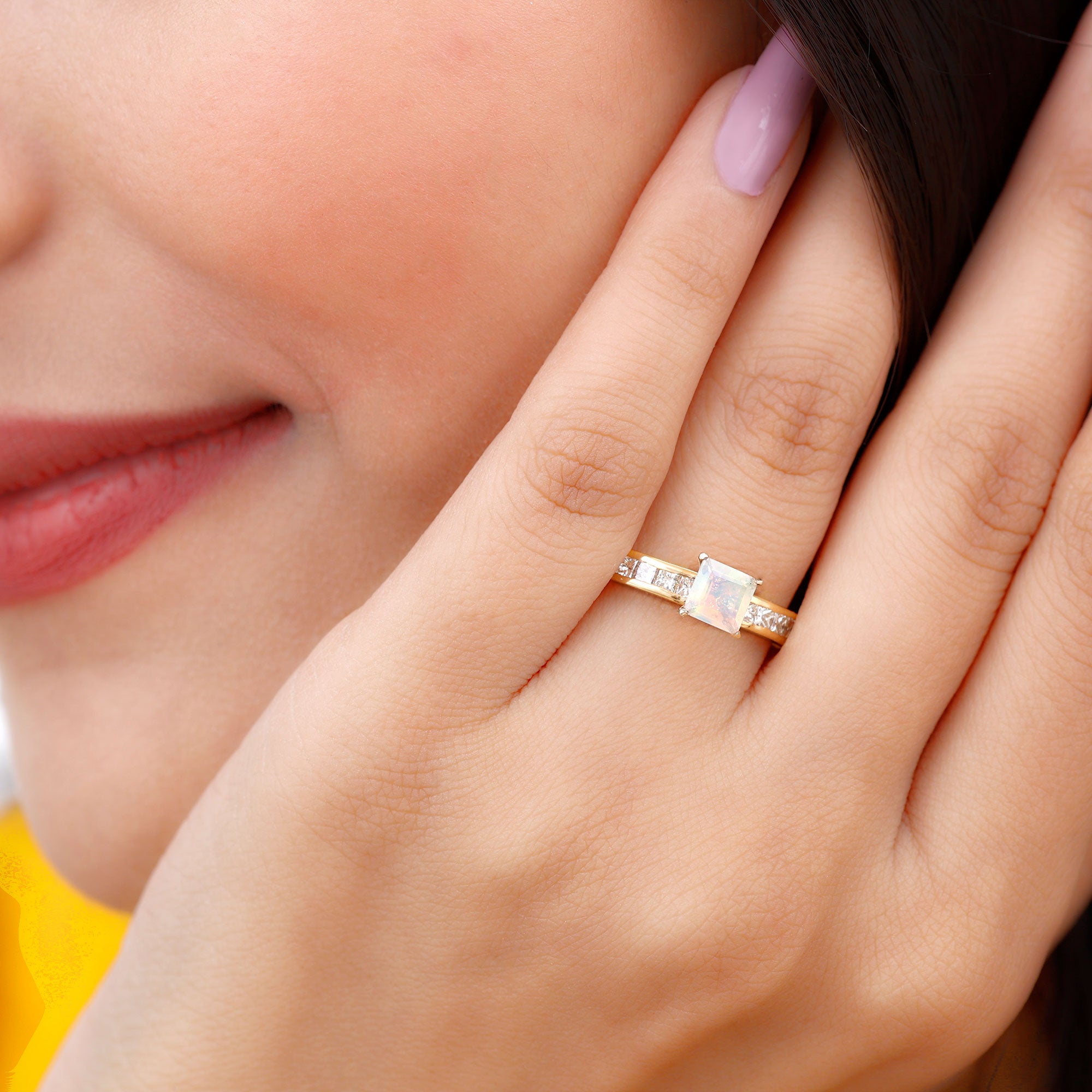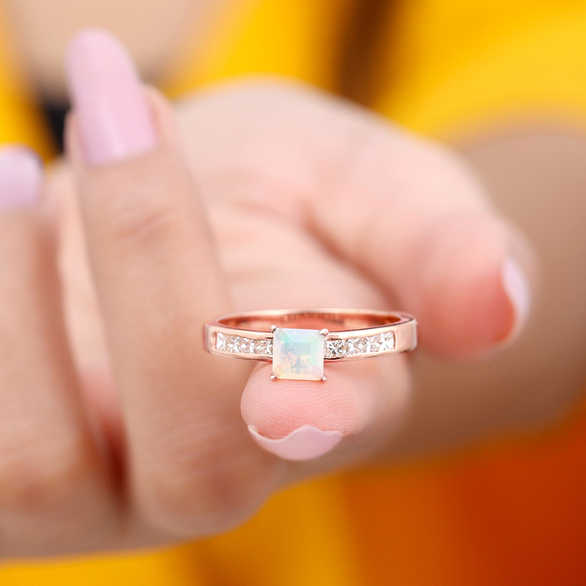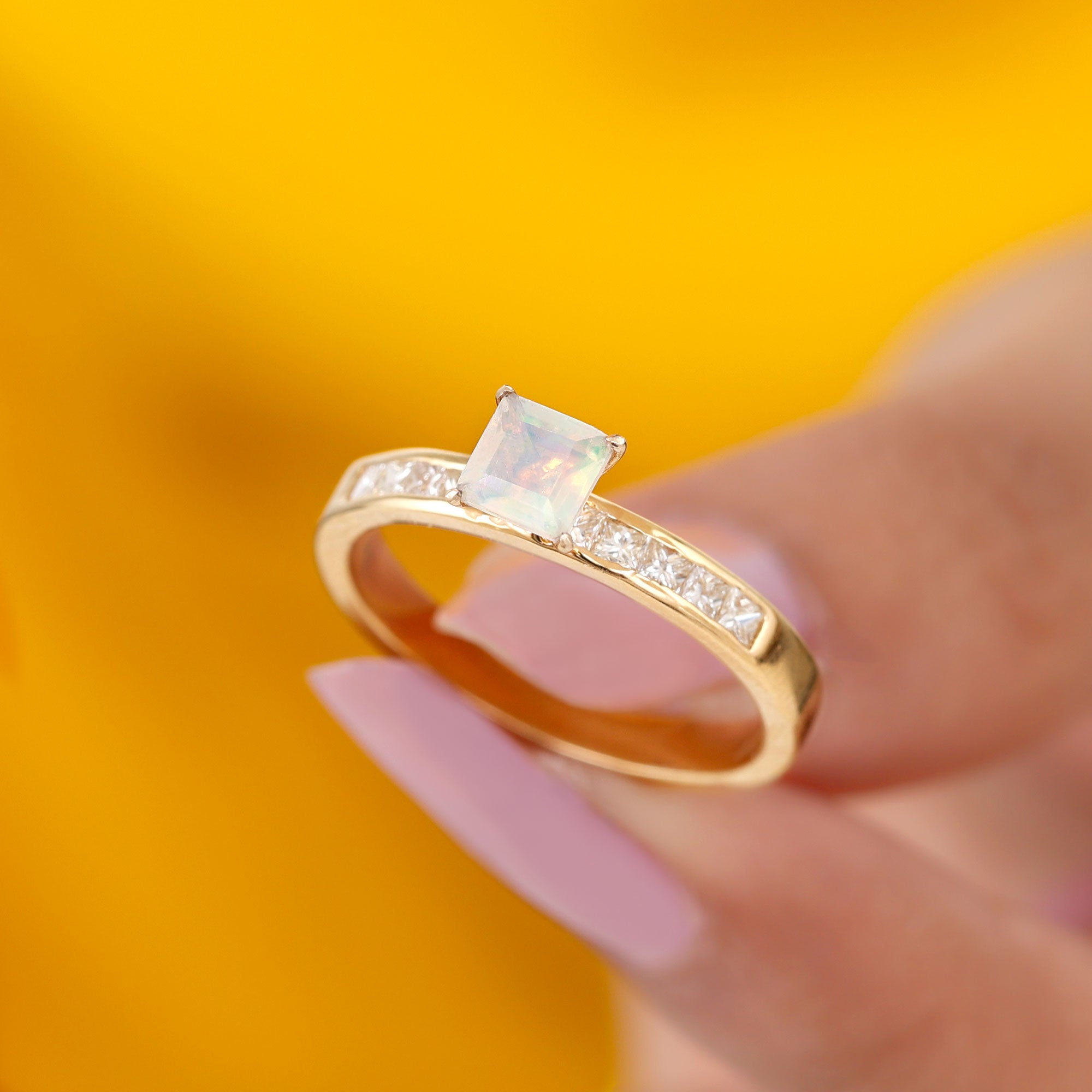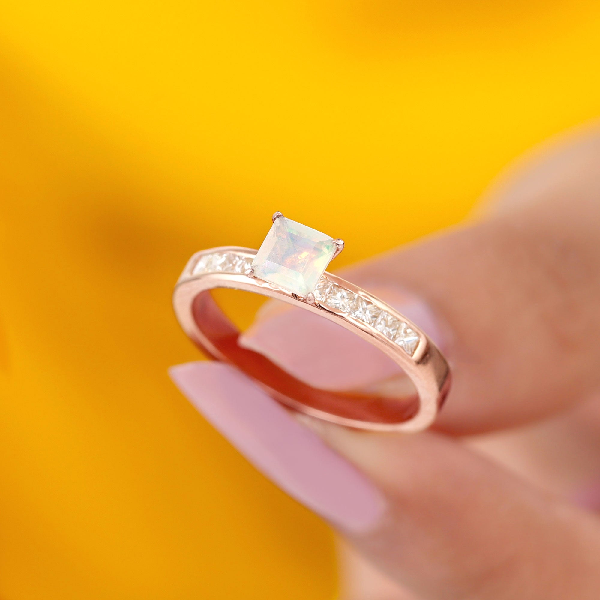 Make your forever moment glow with the iridescent magic of this Ethiopian Opal Engagement Ring, a truly unforgettable piece that captures the beauty of love in full color. At the center is a mesmerizing 5 mm Princess Cut Ethiopian Opal set in Claw Setting, known for its kaleidoscopic flashes of color that shift with every movement. Framed by sparkling Princess Cut Diamond Side Stones along the band, this Princess Cut Engagement Ring brings together classic elegance and ethereal charm. The princess cut gives it a modern edge, while the natural fire of the opal adds a dreamy, one-of-a-kind touch. Whether you are planning a surprise proposal or celebrating a love that deserves something extraordinary, this Side Stone Engagement Ring is designed to leave a lasting impression. Crafted with care, available in various sizes for the perfect fit and presented in a signature jewelry box, this Opal Solitaire Ring for Engagement is ready to be treasured from the first yes to forever. Romantic and full of wonder, this Opalescent Ring is a piece of your love story.