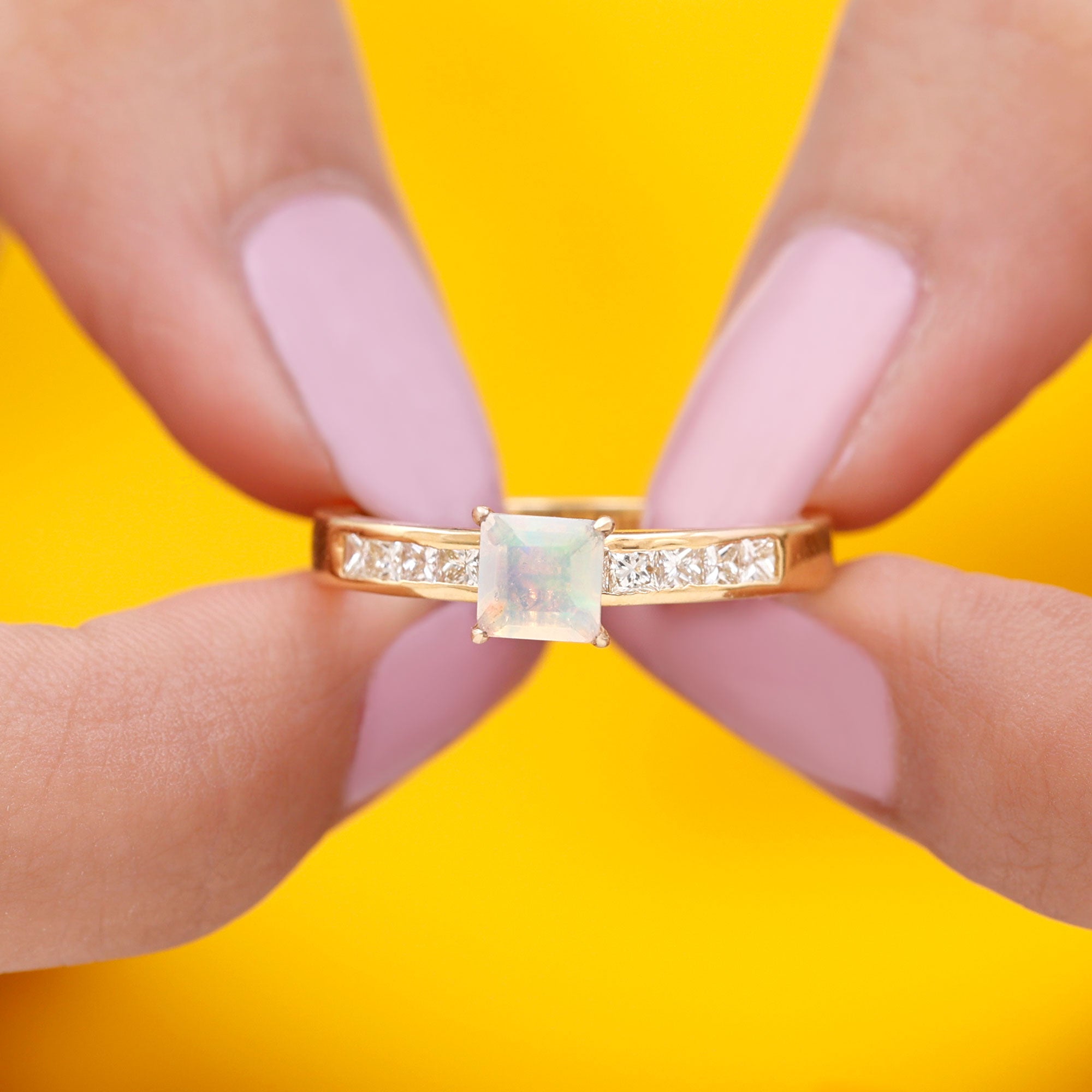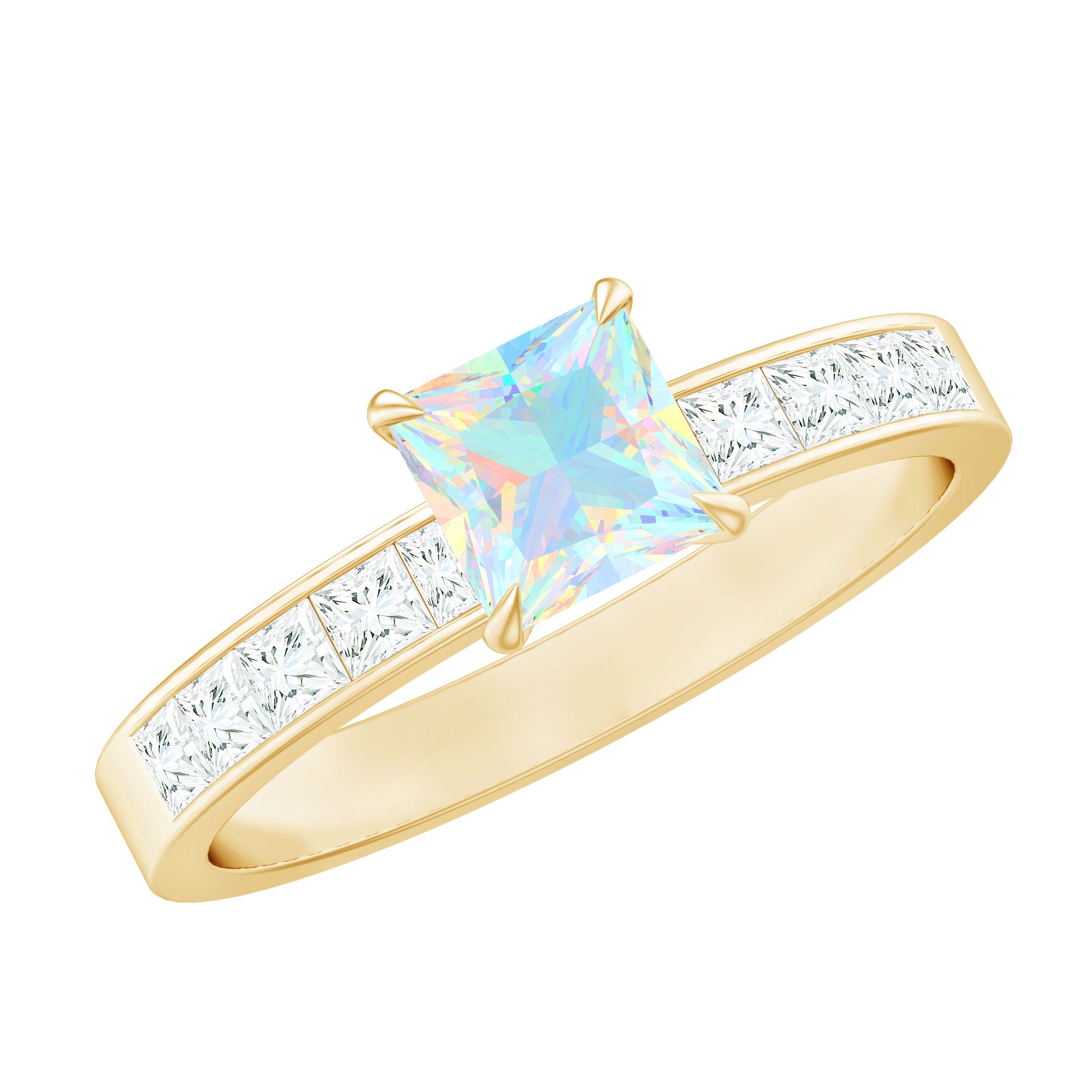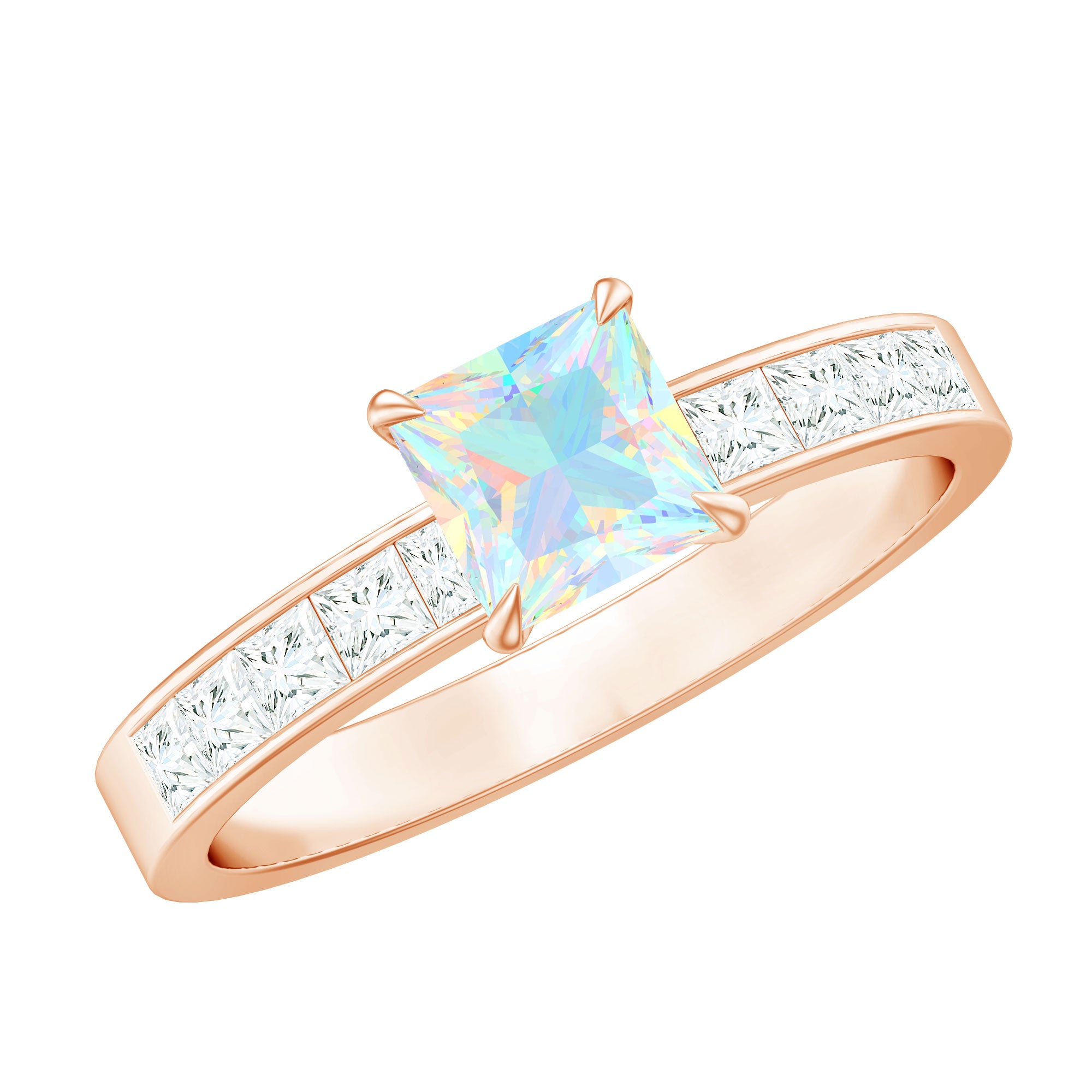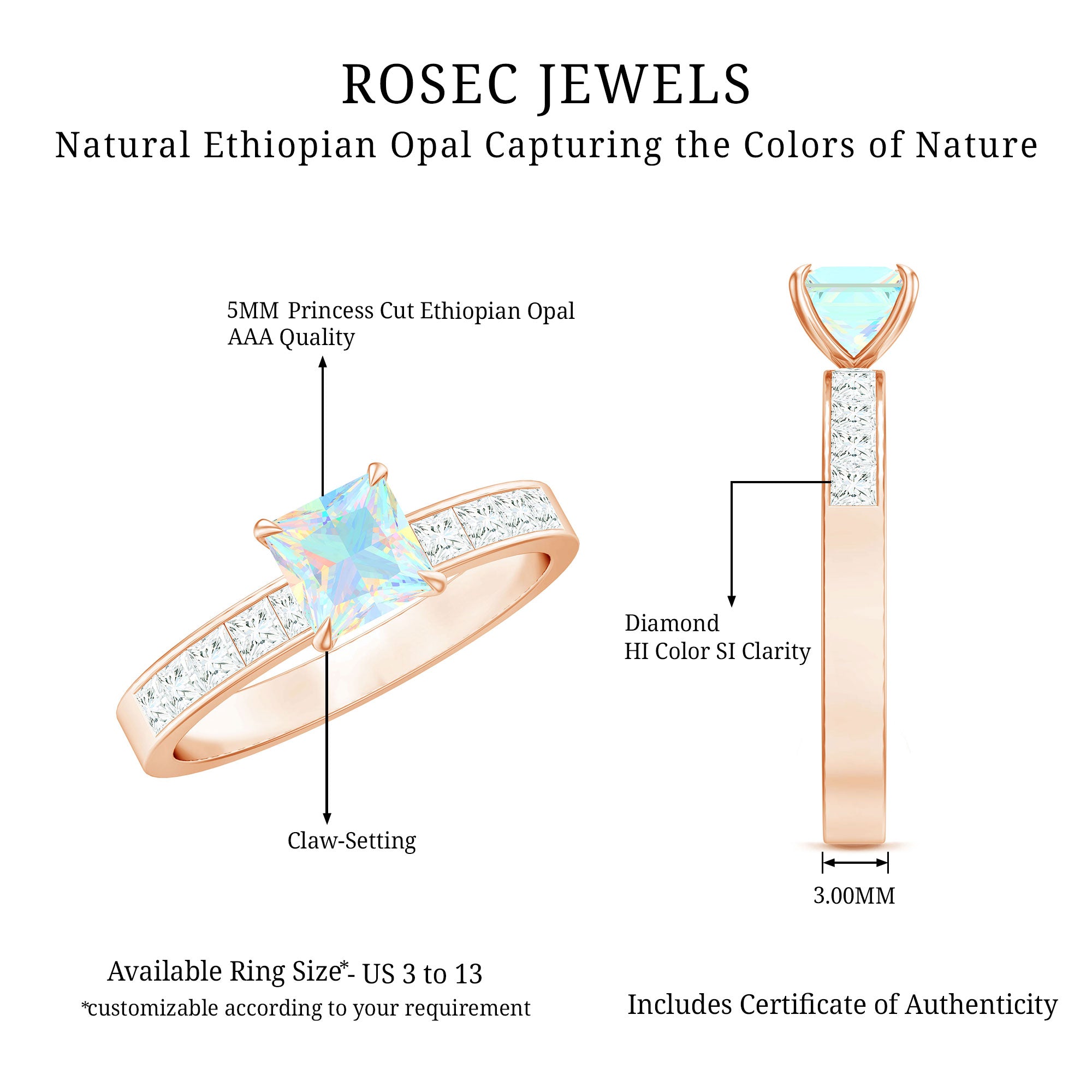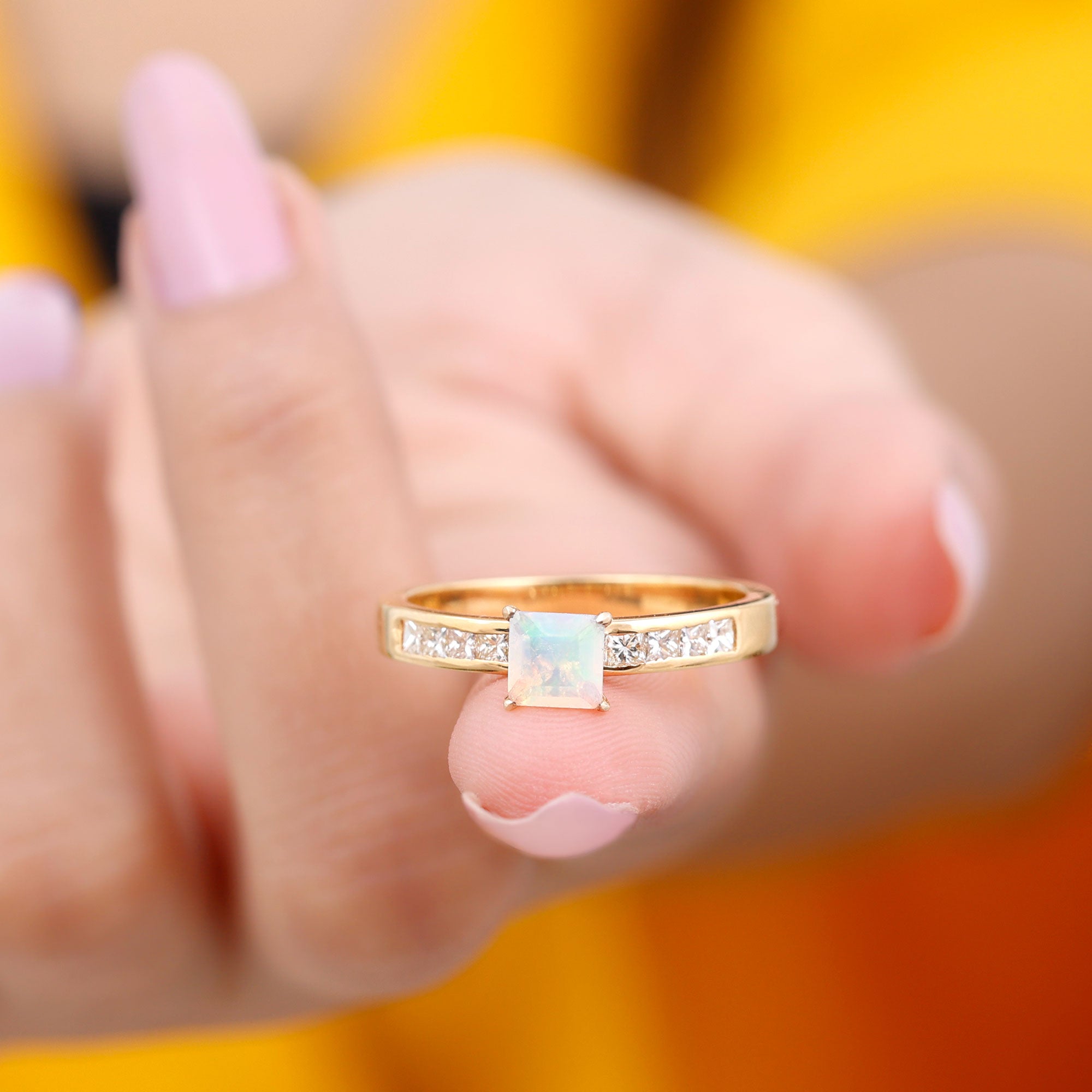 Make your forever moment glow with the iridescent magic of this Ethiopian Opal Engagement Ring, a truly unforgettable piece that captures the beauty of love in full color. At the center is a mesmerizing 5 mm Princess Cut Ethiopian Opal set in Claw Setting, known for its kaleidoscopic flashes of color that shift with every movement. Framed by sparkling Princess Cut Diamond Side Stones along the band, this Princess Cut Engagement Ring brings together classic elegance and ethereal charm. The princess cut gives it a modern edge, while the natural fire of the opal adds a dreamy, one-of-a-kind touch. Whether you are planning a surprise proposal or celebrating a love that deserves something extraordinary, this Side Stone Engagement Ring is designed to leave a lasting impression. Crafted with care, available in various sizes for the perfect fit and presented in a signature jewelry box, this Opal Solitaire Ring for Engagement is ready to be treasured from the first yes to forever. Romantic and full of wonder, this Opalescent Ring is a piece of your love story.