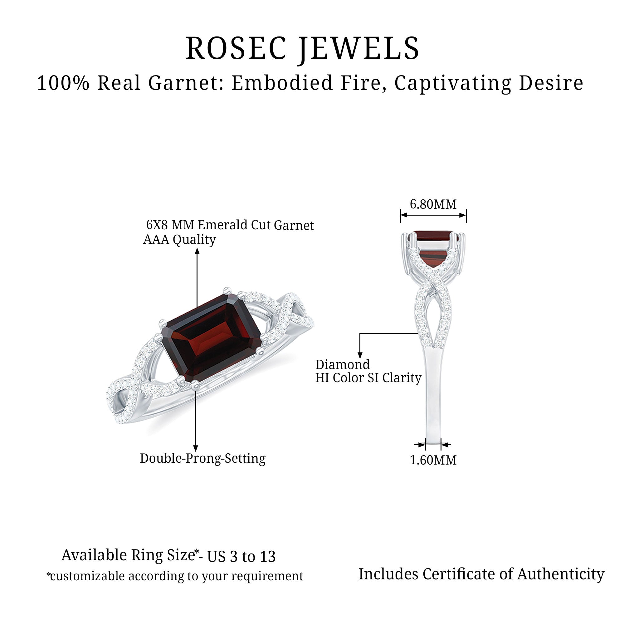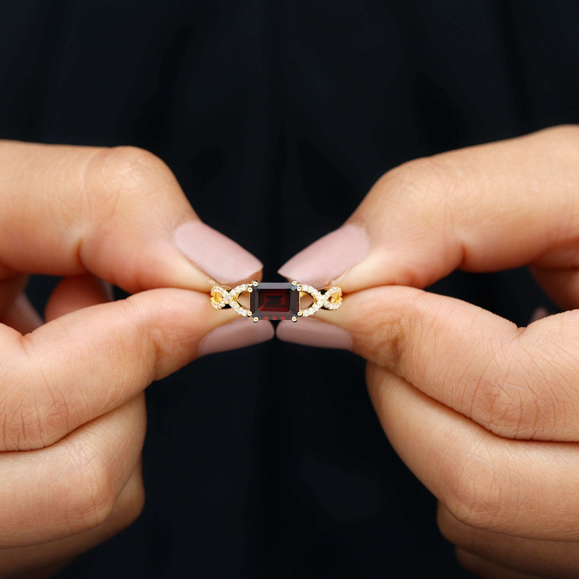 Make your special day unforgettable with this Emerald Cut Engagement Ring in a stunning East West style, a design that dares to be different while staying effortlessly elegant. The vibrant red 6X8 mm Garnet of Emerald Cut, set horizontally in Double Prong Setting, shines with a bold and modern charm that symbolizes passion and everlasting love. Its emerald cut catches the light with every movement, while the sparkling Diamond Crossover Shank wraps around it in a graceful embrace, reflecting unity and devotion. Together, they create a mesmerizing harmony of fire and brilliance, a perfect representation of two souls intertwined. Handcrafted with care, this Garnet Diamond Ring offers a balance of sophistication and sentiment, making it a breathtaking choice for engagements or romantic milestones. Presented in a signature jewelry box, this East West Engagement Ring arrives ready to capture hearts and mark the most precious moments of life. Available in various ring sizes, this Emerald Cut Garnet Ring is a lasting promise, a celebration of love and a treasure meant to shine forever.