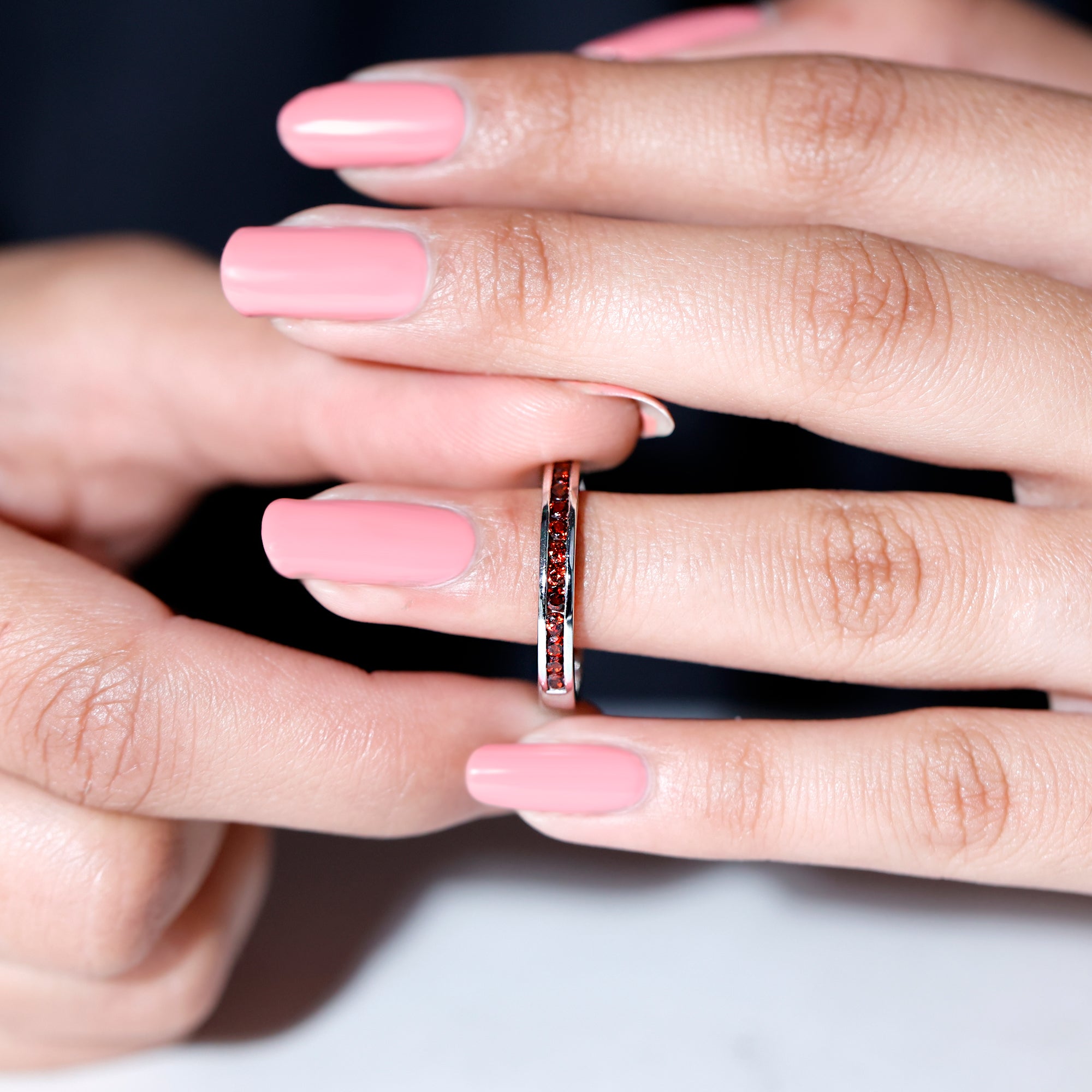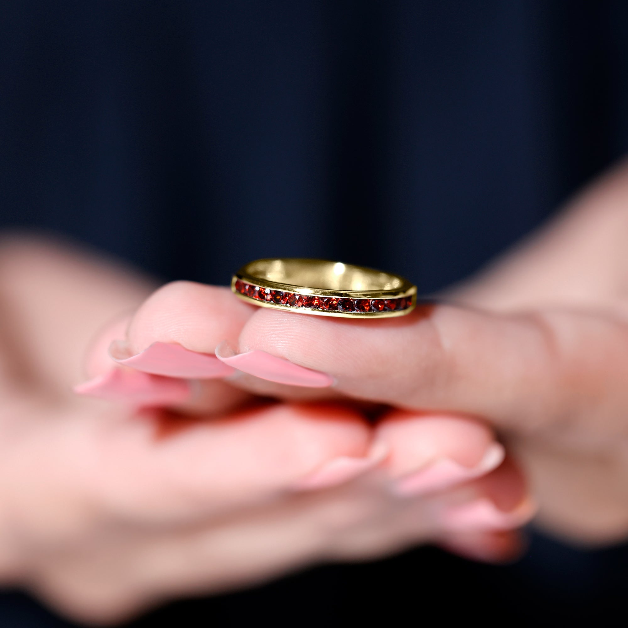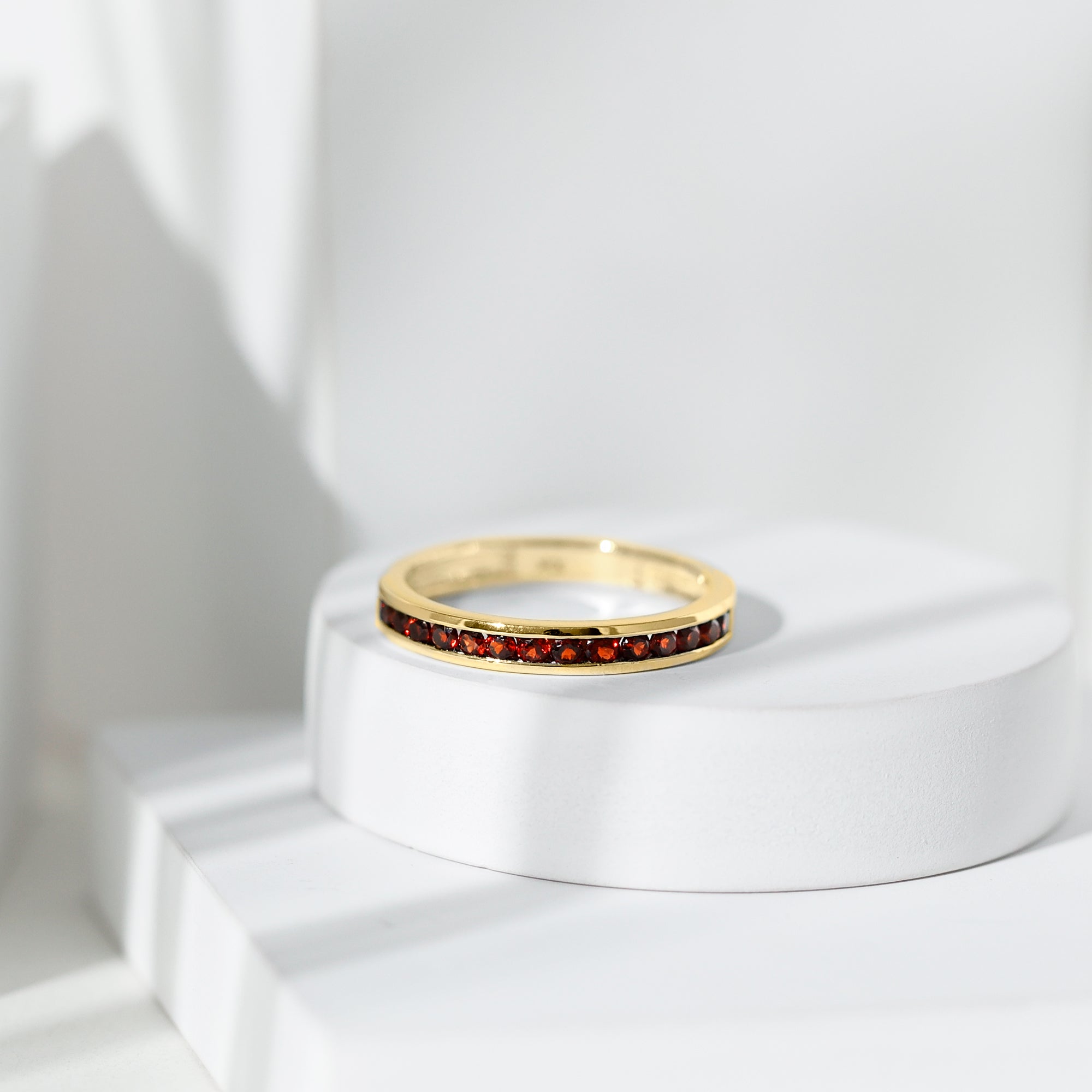 Elevate your love story with the radiant charm of this Half Eternity Ring, a stunning symbol of passion and promise. The deep red 2 mm Round Shape Garnet stones set in Channel Setting shimmer with warmth and emotion, capturing the essence of love that glows endlessly. Set delicately along half the band, each gem reflects the beauty of commitment, bright, bold and everlasting. Perfect for stacking with other rings or wearing solo for a graceful touch, this versatile Garnet Stackable Ring adds a romantic sparkle to any look. Its elegant simplicity makes it ideal for anniversaries, special occasions or as a meaningful everyday reminder of someone dear to your heart. The rich hue of garnet embodies strength and devotion, making this Garnet Eternity Ring a timeless treasure for the one who holds your heart. Thoughtfully presented in a signature jewelry box, this Red Garnet Ring is ready to be gifted and cherished. Available in various US ring sizes, the Garnet Birthstone Ring is a promise meant to shine forever.