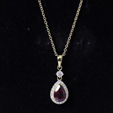 Like a soft drop of love, this Rhodolite Garnet Teardrop Necklace adds romance and beauty to any special moment. Designed with elegance and care, it features a stunning 6X9MM pear shaped rhodolite at the center. Surrounding the center stone is a halo of sparkling lab grown diamonds, adding just the right amount of shine and contrast. These diamonds catch the light beautifully, making the Rhodolite Garnet Necklace sparkle with every move you make. Sitting just above the teardrop is a single round lab grown diamond, giving the pendant an extra elegant touch and connecting it to the chain in a graceful way. The pendant is crafted in 14K yellow gold plated silver, giving it a soft golden glow. It hangs from a delicate cable chain that feels comfortable on the skin and lies beautifully on the neckline, ideal for wedding gowns, party dresses, or even a romantic dinner look. This Wedding Necklace for Bride is a lovely choice for bridal jewelry, wedding day gifts, or anniversary celebrations. Whether it is worn by the bride herself, gifted to a loved one, or saved as a keepsake, it is a timeless piece that will be treasured for years. Packaged in a premium jewelry box and comes with a gemstone certificate, this necklace is ready to gift and full of love. Celebrate your most special moments with jewelry that feels as heartfelt as the occasion.