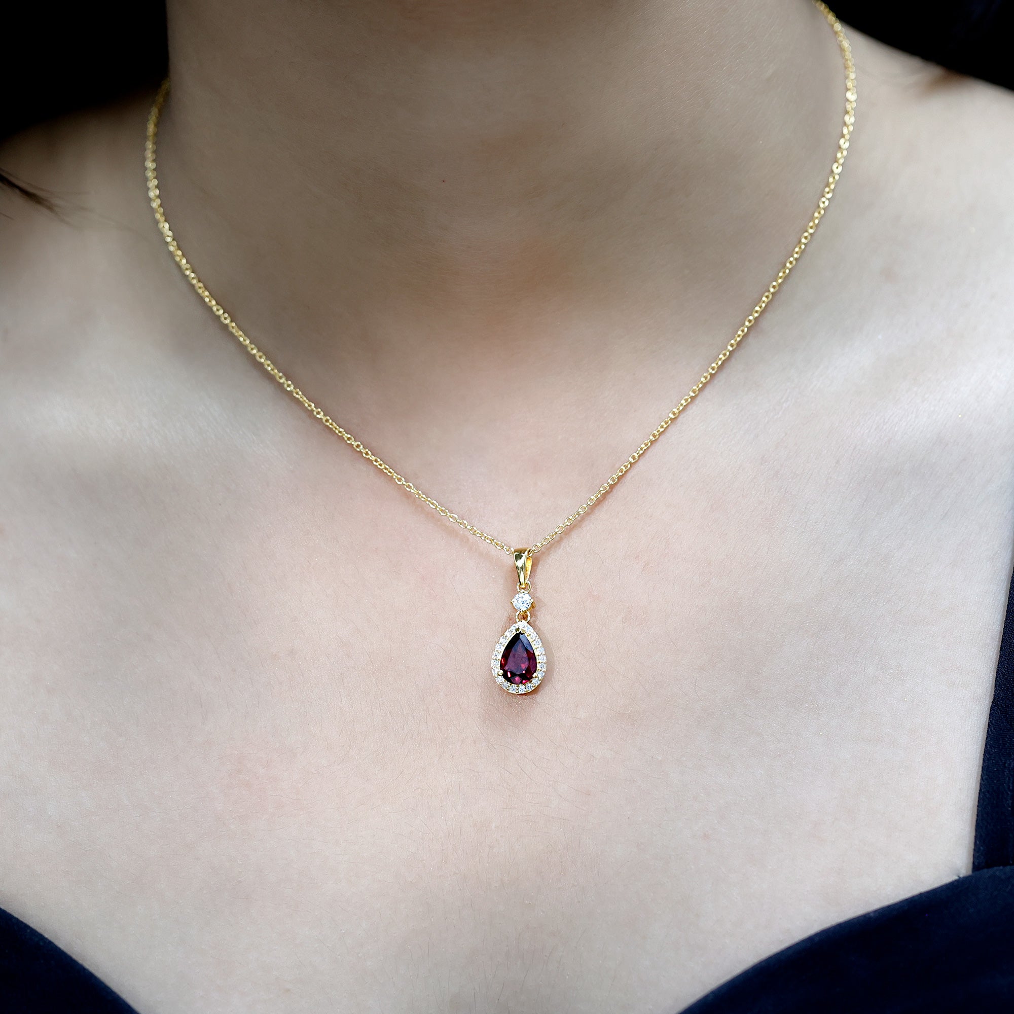 Certified Rhodolite Garnet Teardrop Necklace with Diamond Halo