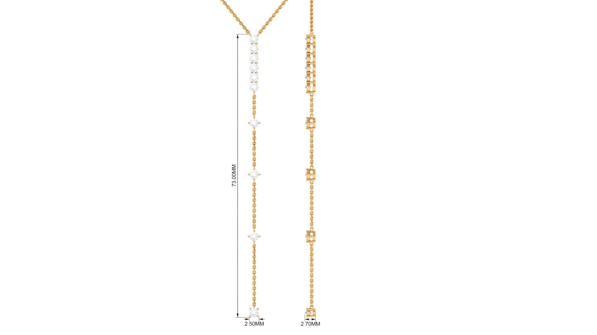 This Y Lariat Necklace is precisely crafted to decorate your neckline. It features moissanite stones linked in a chain which adds an extra shine to the necklace. This Lariat Necklace is perfect to be paired with a statement necklace that will level up the stacking game. This necklace beholds the classic shine of D-VS1 Quality Moissanite featured in the necklace. This Moissanite Necklace will be delivered to you in premium quality packaging.