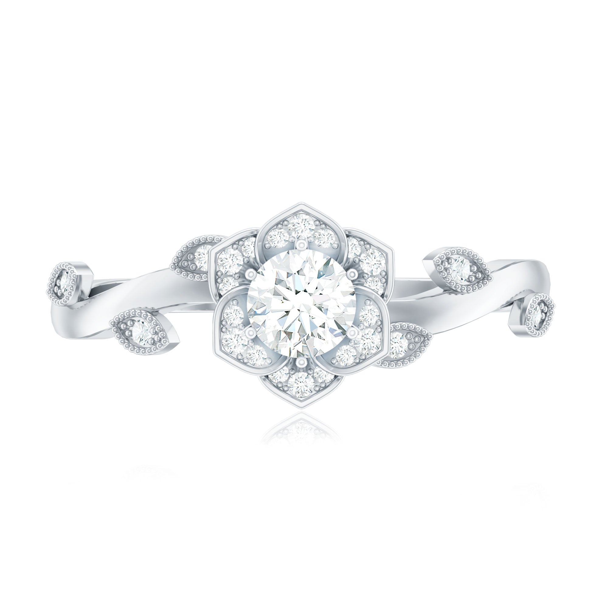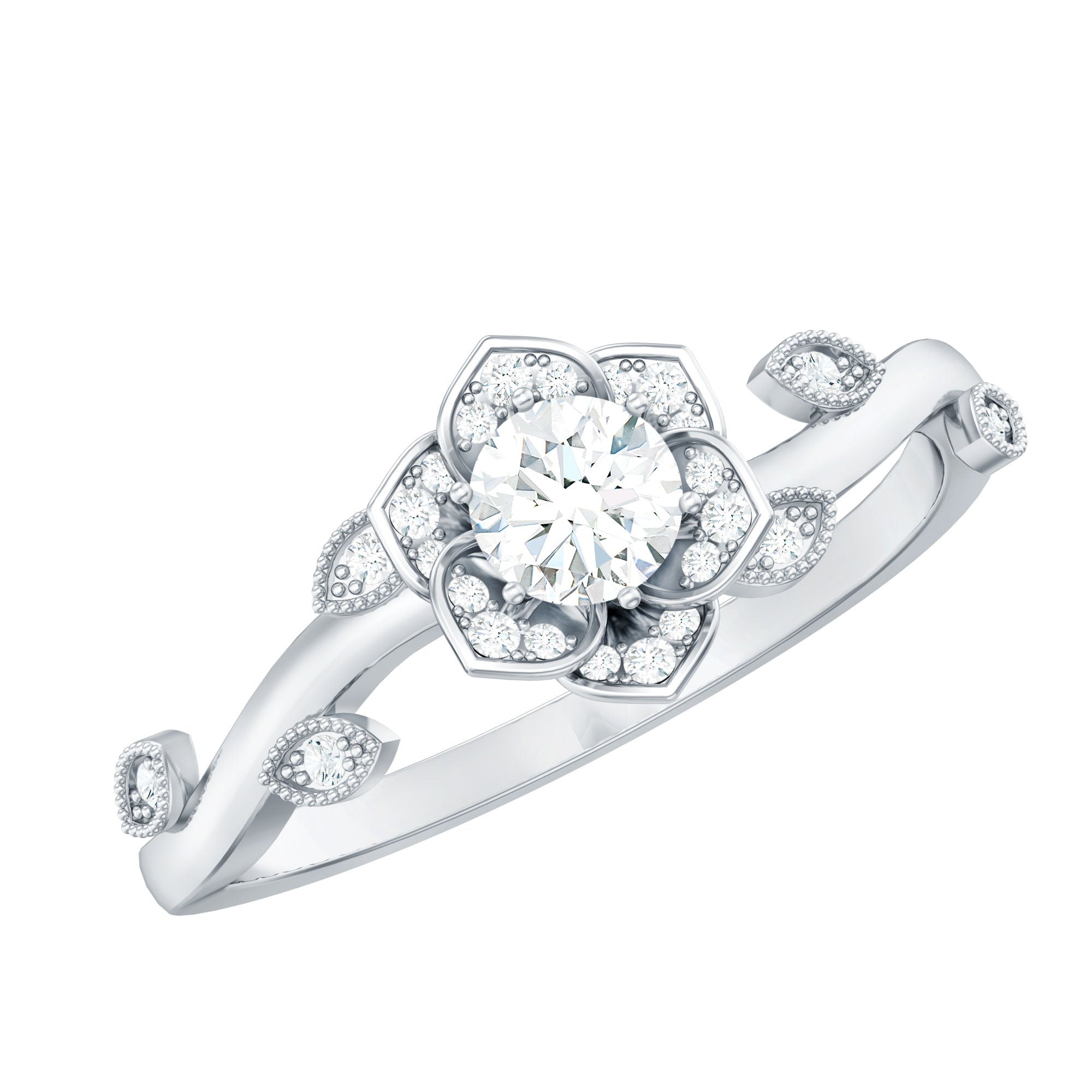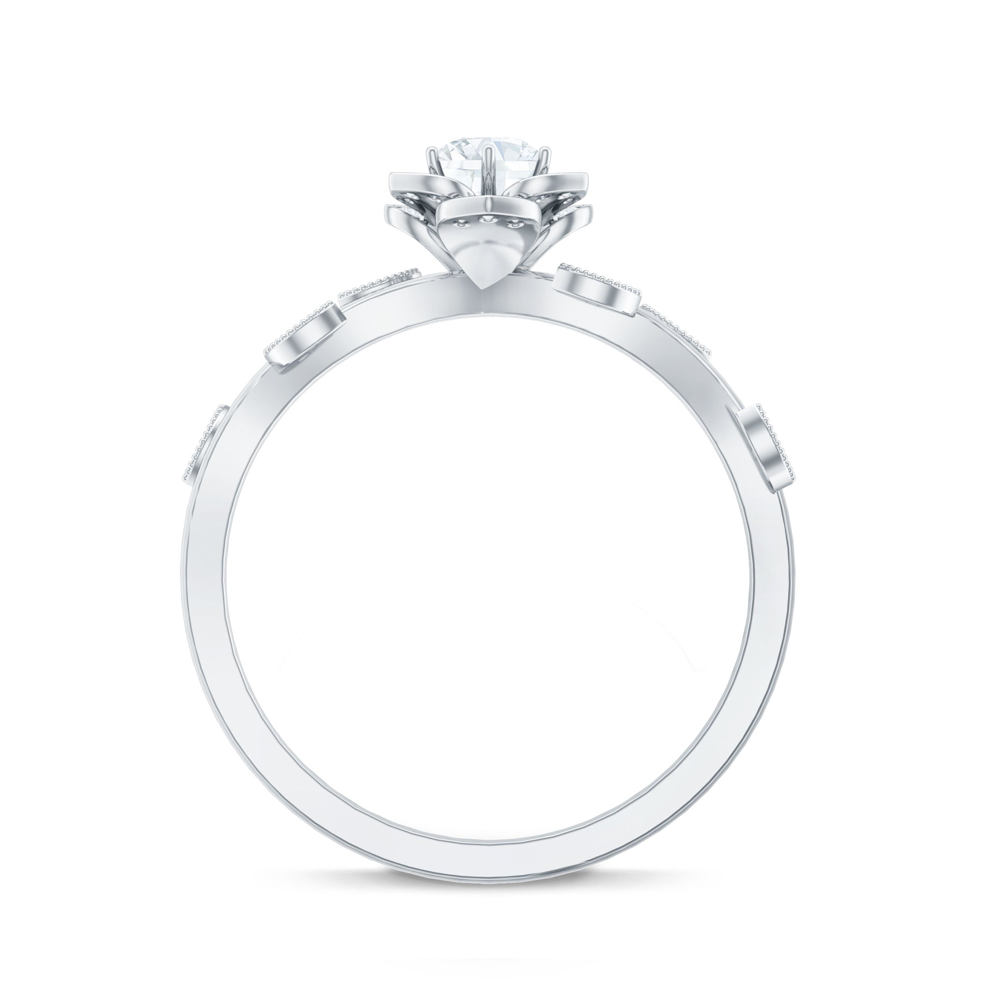 Elegant, eye-catching, and crafted with affection, this Flower Engagement Ring serves as a sincere emblem of eternity. At its heart is a radiant 4 MM Round Shape Diamond set in Prong Setting, encircled by beautiful flower petals embellished with delicate diamonds, certified for its outstanding brilliance and clarity, reflecting light like a fantasy. But the enchantment doesn’t end there, the band is softly curved and flourishes with detailed Leaf Motifs, each one tastefully decorated with a tiny Diamond that contributes a gentle shimmer and romantic allure. The distinctive design wraps around the finger like a garden of commitments, making this Diamond Engagement Ring an ideal selection for engagements, promises, or significant milestones. Made with precision and a keen eye for detail, this Real Diamond Ring for Women honors love that flourishes beautifully over time. The Diamond showcases all the brilliance of HI-SI Quality, allowing you to wear this piece with unparalleled sparkle. Whether you are giving it as a gift or committing to a lifelong love, this Nature Inspired Ring arrives in a chic jewelry box and is offered in US sizes ranging from 3 to 13. Romantic, elegant, and brimming with charm, this Diamond Flower Ring tells a love story blossoming on your finger.