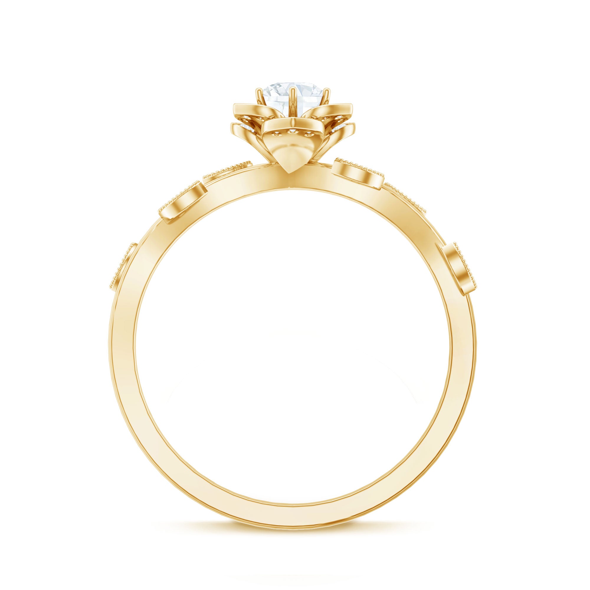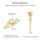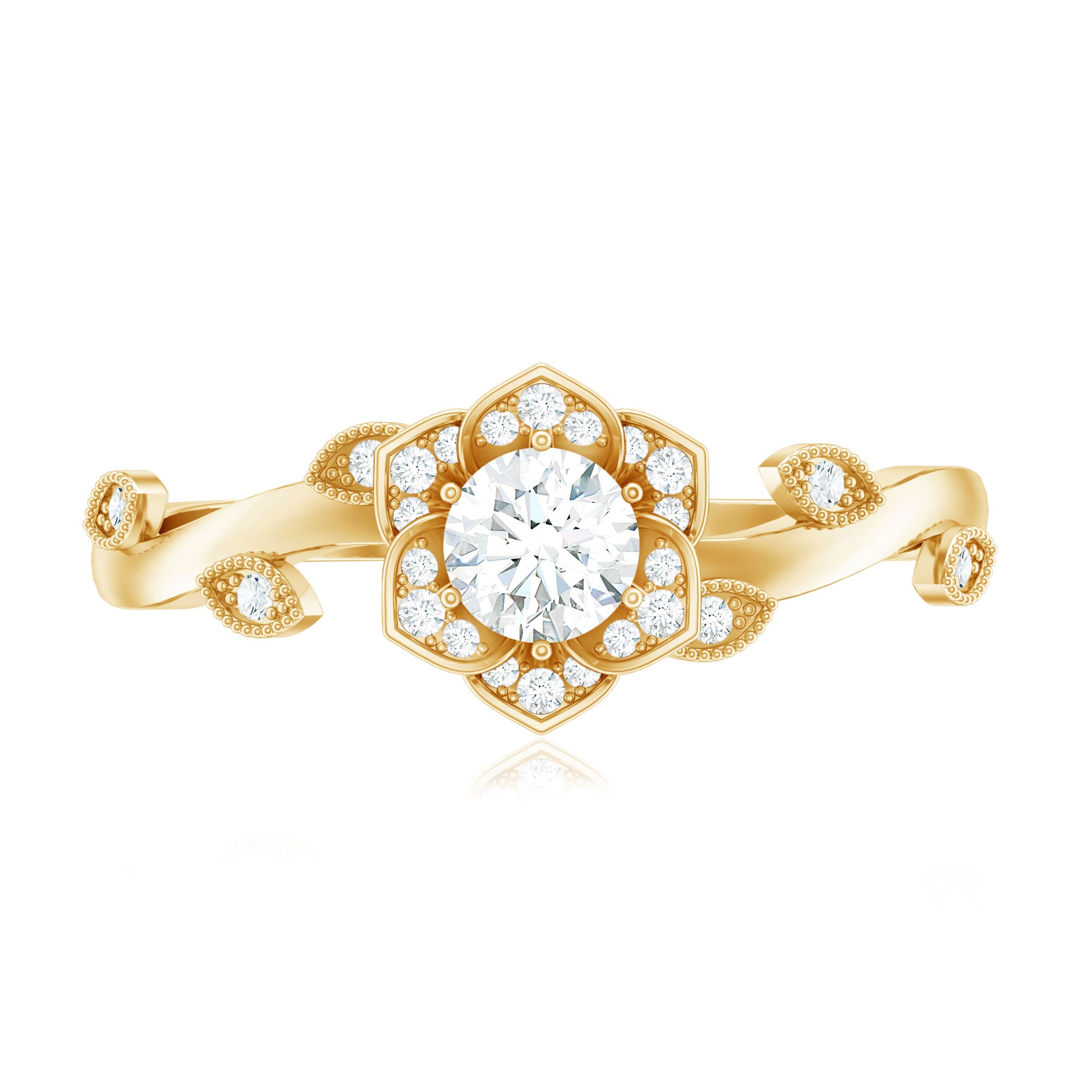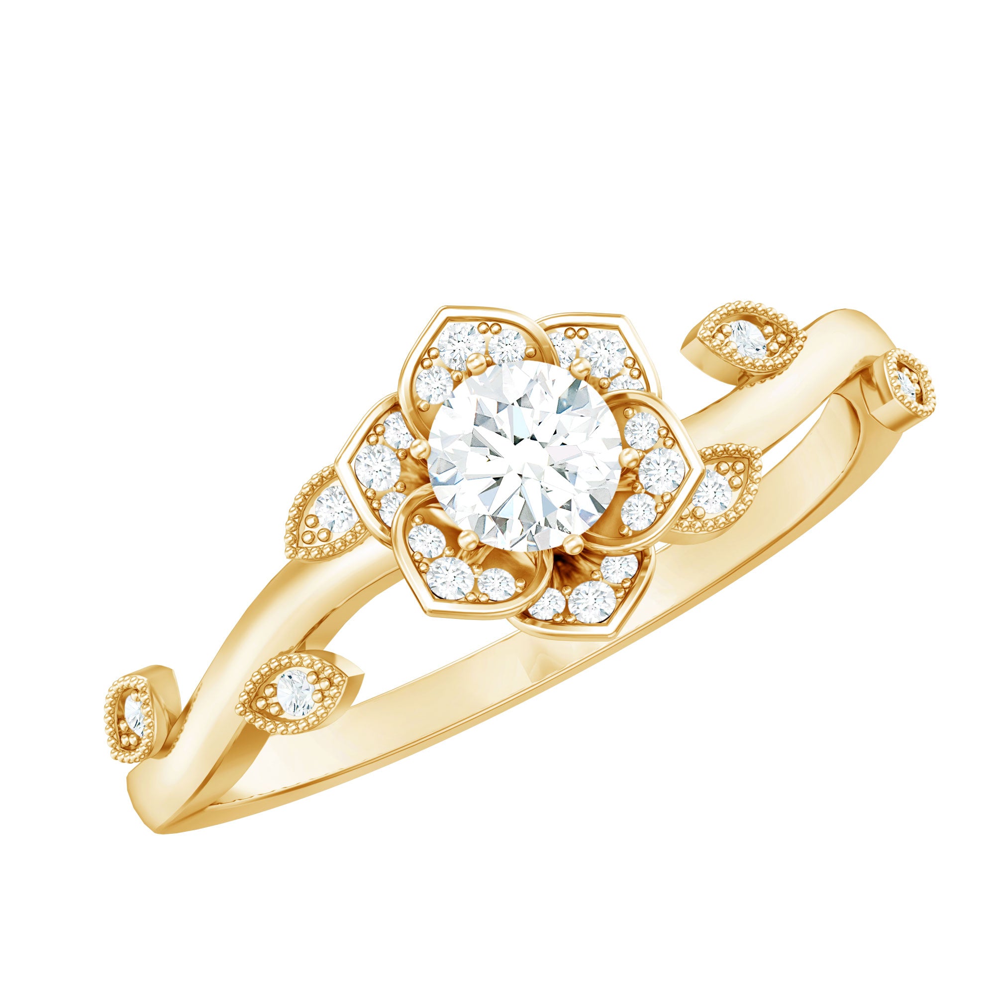 Elegant, eye-catching, and crafted with affection, this Flower Engagement Ring serves as a sincere emblem of eternity. At its heart is a radiant 4 MM Round Shape Diamond set in Prong Setting, encircled by beautiful flower petals embellished with delicate diamonds, certified for its outstanding brilliance and clarity, reflecting light like a fantasy. But the enchantment doesn’t end there, the band is softly curved and flourishes with detailed Leaf Motifs, each one tastefully decorated with a tiny Diamond that contributes a gentle shimmer and romantic allure. The distinctive design wraps around the finger like a garden of commitments, making this Diamond Engagement Ring an ideal selection for engagements, promises, or significant milestones. Made with precision and a keen eye for detail, this Real Diamond Ring for Women honors love that flourishes beautifully over time. The Diamond showcases all the brilliance of HI-SI Quality, allowing you to wear this piece with unparalleled sparkle. Whether you are giving it as a gift or committing to a lifelong love, this Nature Inspired Ring arrives in a chic jewelry box and is offered in US sizes ranging from 3 to 13. Romantic, elegant, and brimming with charm, this Diamond Flower Ring tells a love story blossoming on your finger.