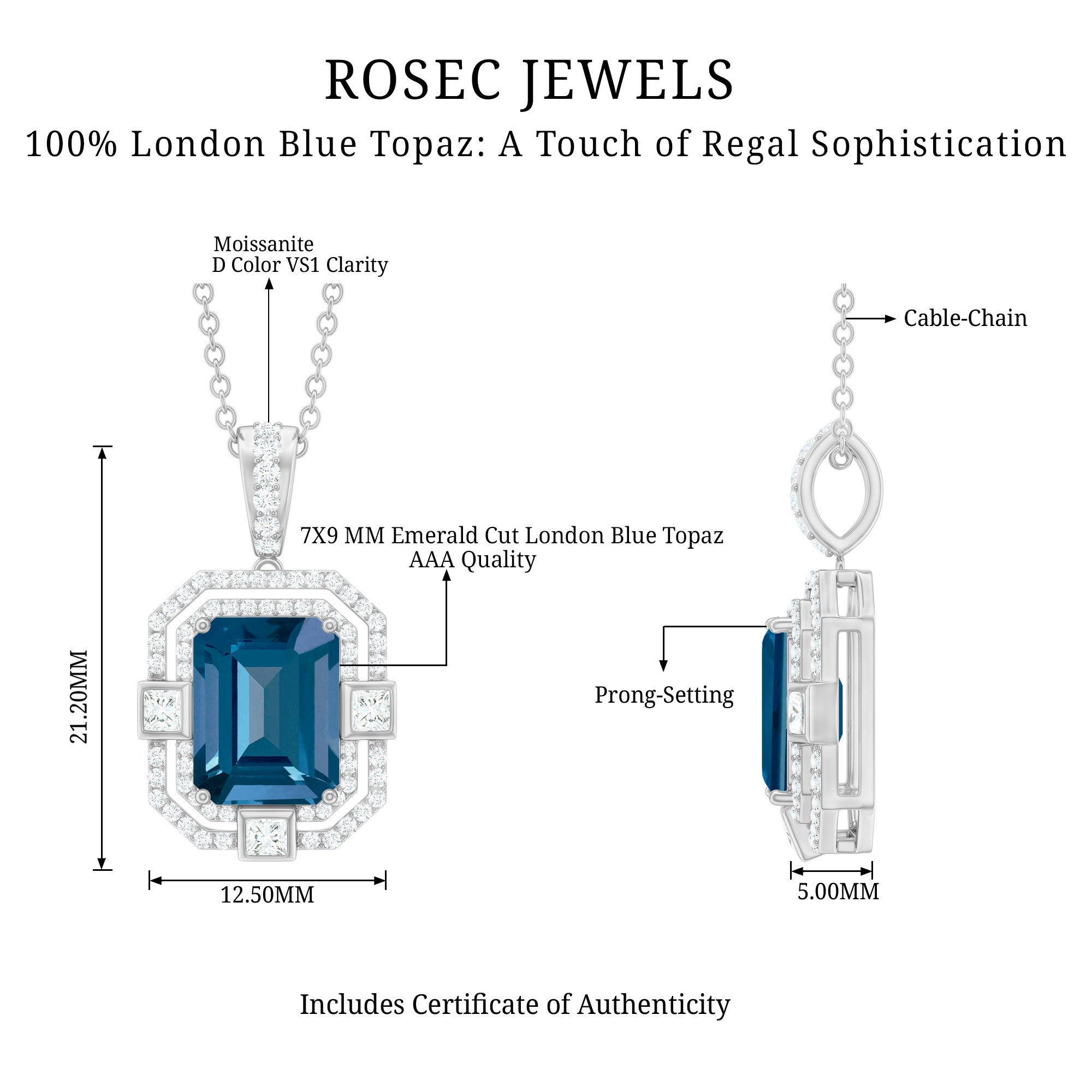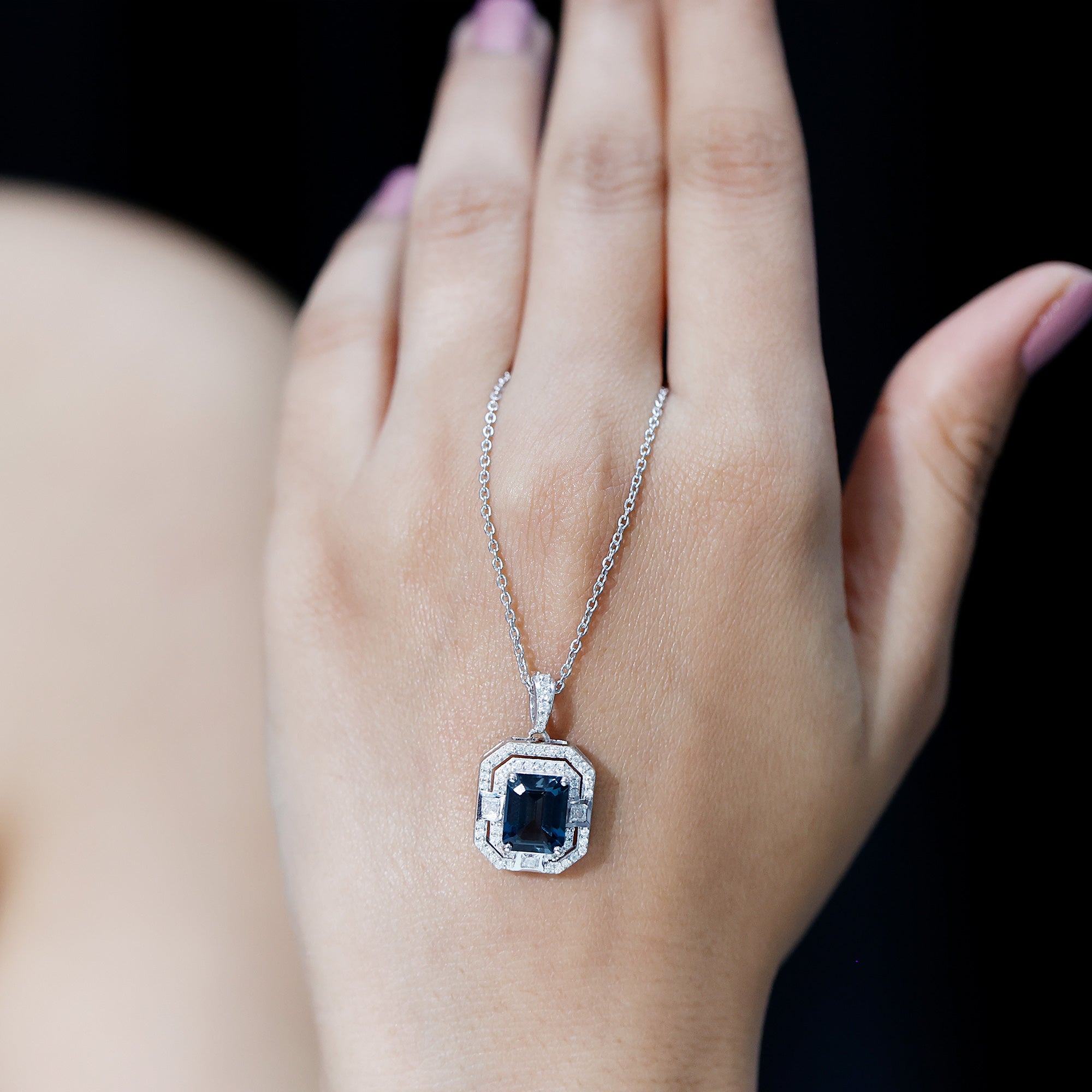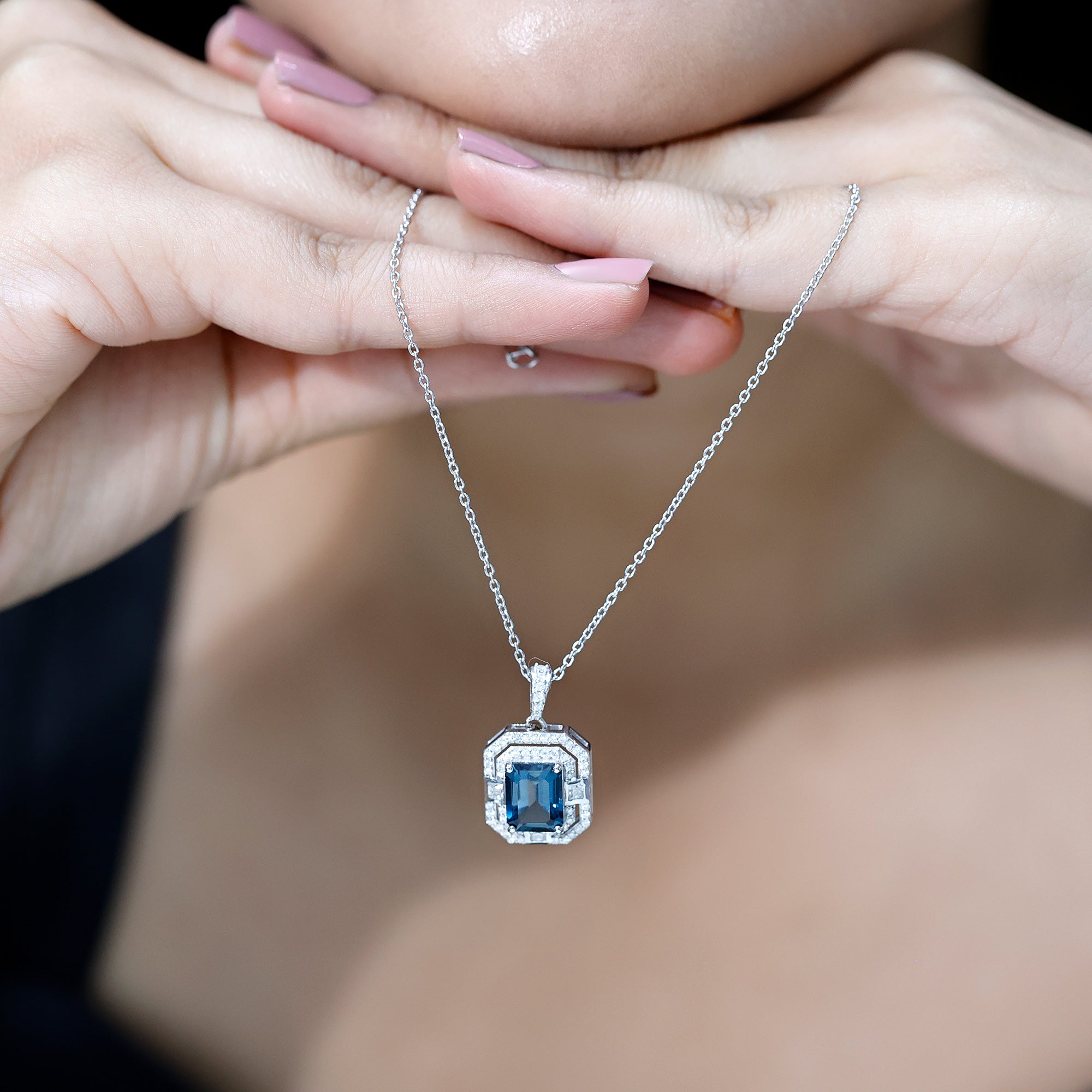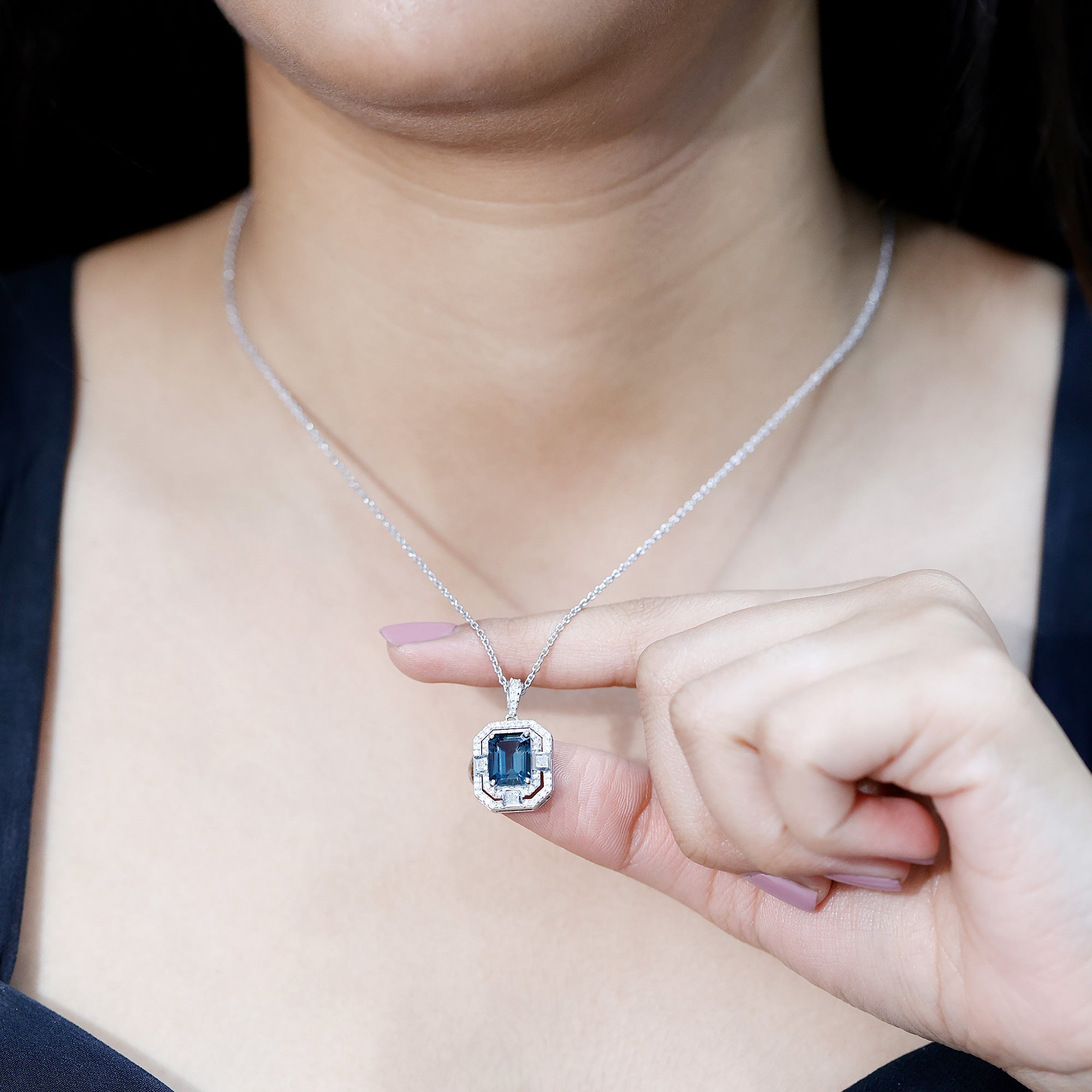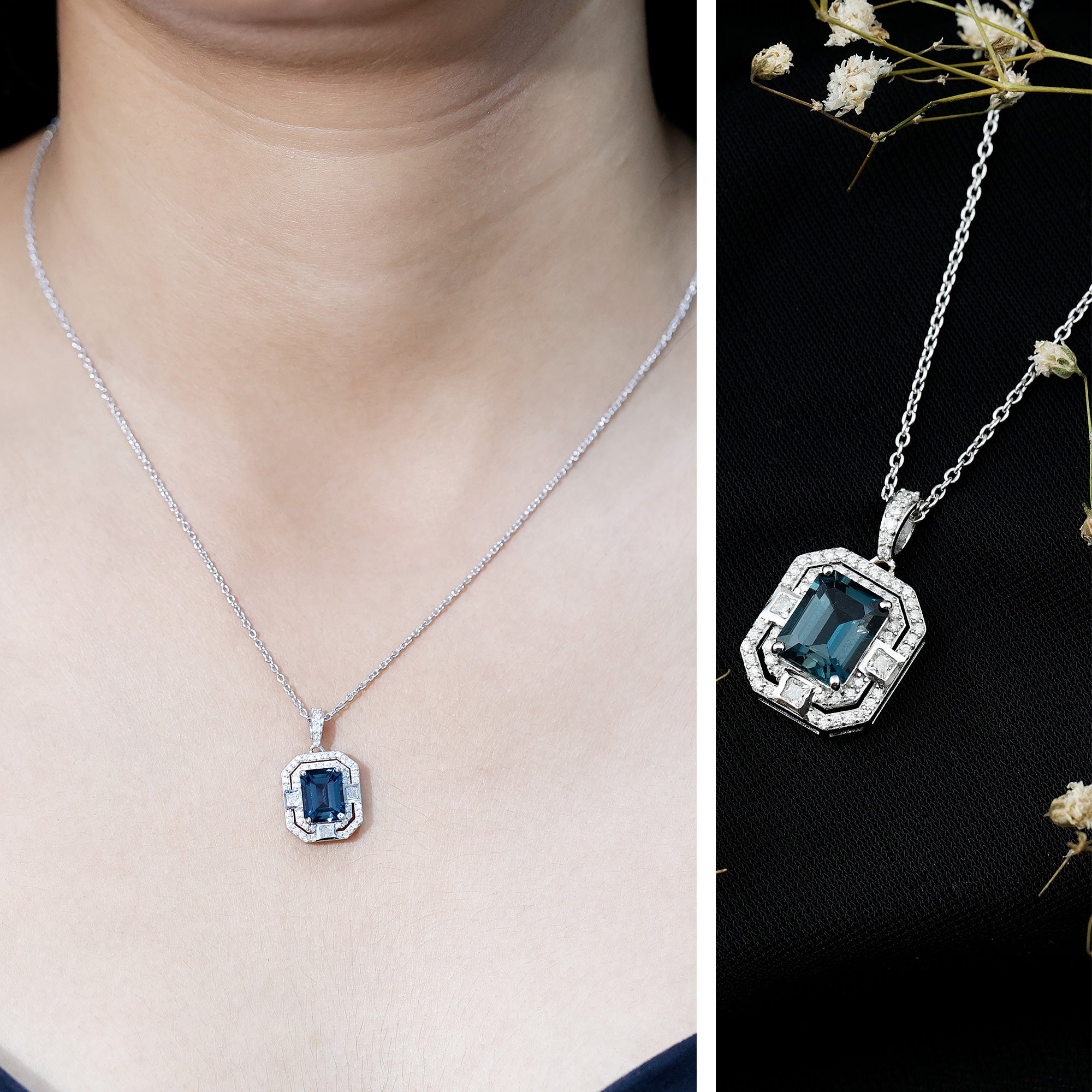 Embrace timeless elegance with this London Blue Topaz Necklace. At its center sits a stunning 7X9 mm Emerald Cut London Blue Topaz, radiating a deep, calming blue that feels both bold and graceful. Surrounding the Blue Topaz is a double halo of Moissanite stones, arranged to reflect light and enhance the sparkle, giving the necklace a touch of old-world charm with a modern twist. Inspired by Art Deco Inspired designs, this Blue Topaz Necklace in Silver offers a delicate balance of classic sophistication and contemporary style, making it a perfect choice for weddings, special occasions or even everyday elegance. This Statement Necklace is designed to capture attention and elevate your entire bridal look. Its striking combination of rich AAA Quality Blue Topaz and dazzling D-VS1 Moissanite Halo makes it the perfect finishing touch for your wedding day, adding a splash of color and timeless sophistication. Whether paired with a classic white gown or a uniquely styled ensemble, this Wedding Necklace symbolizes elegance, grace and individuality, ensuring you shine with confidence as you walk down the aisle.