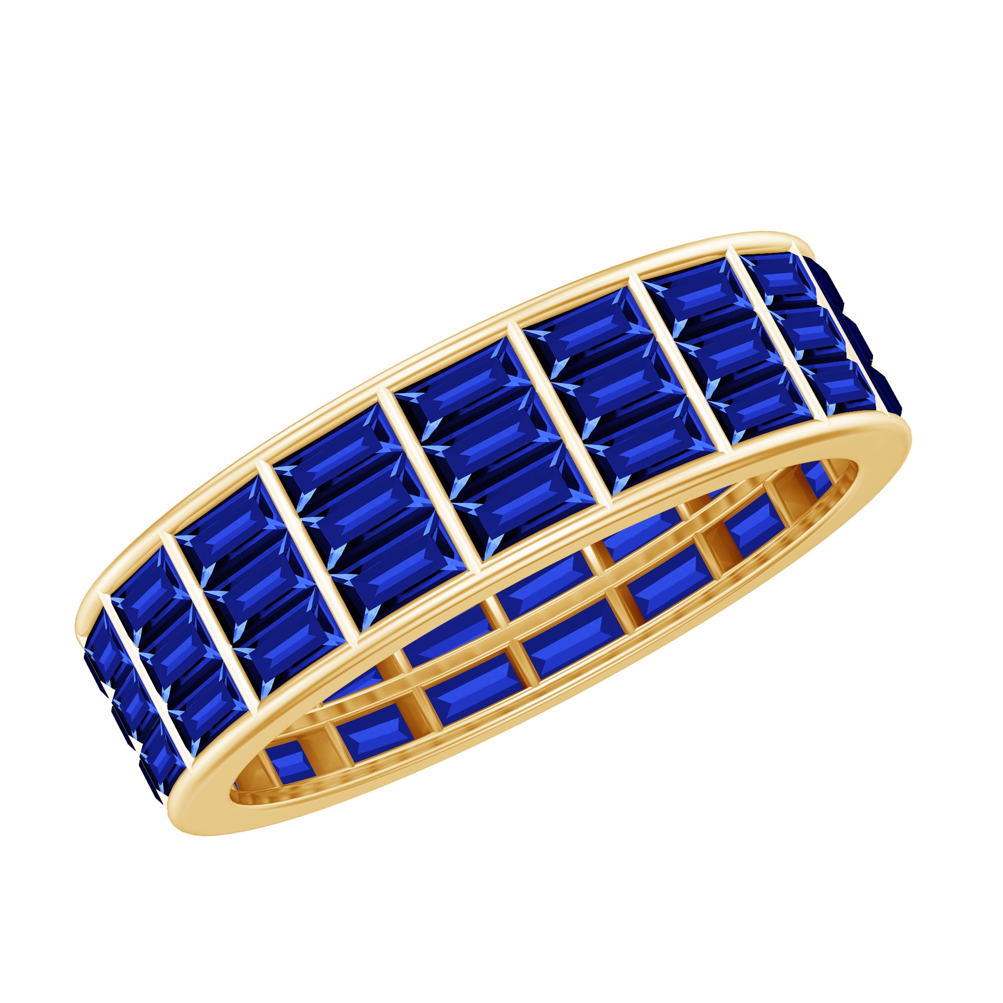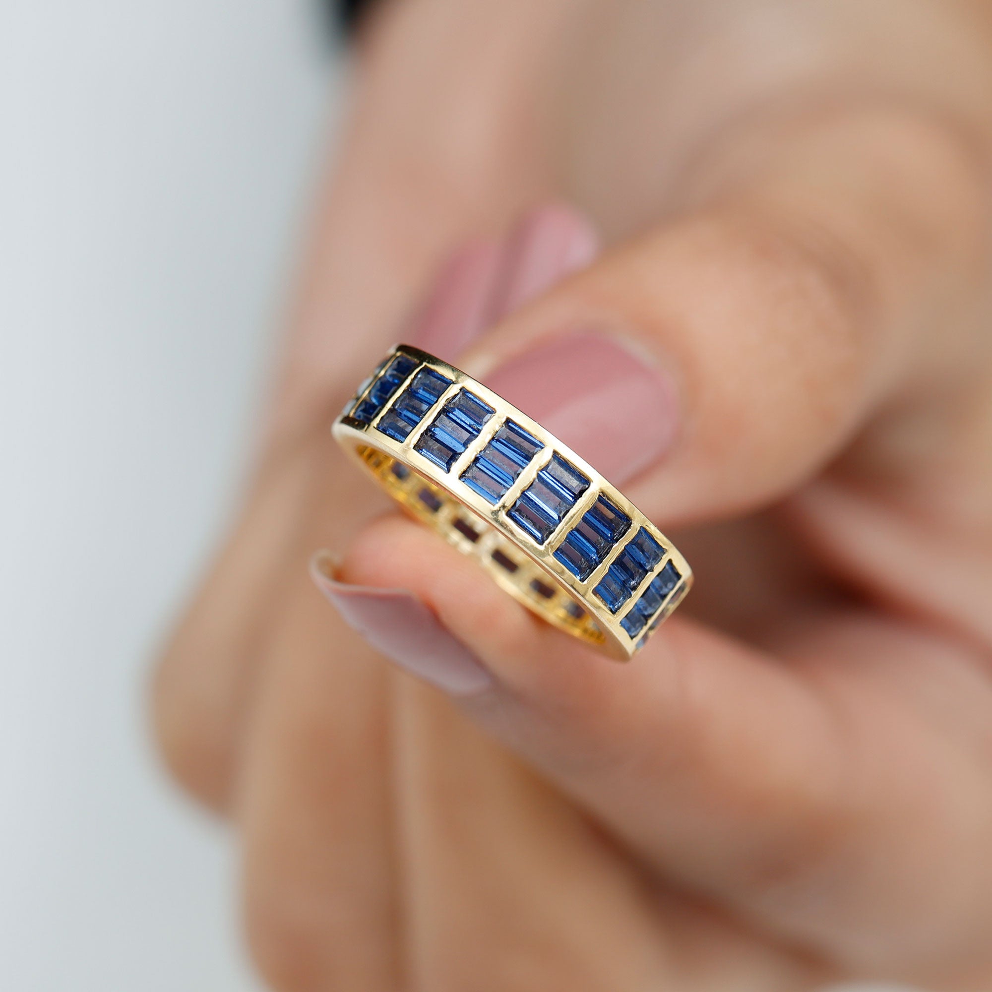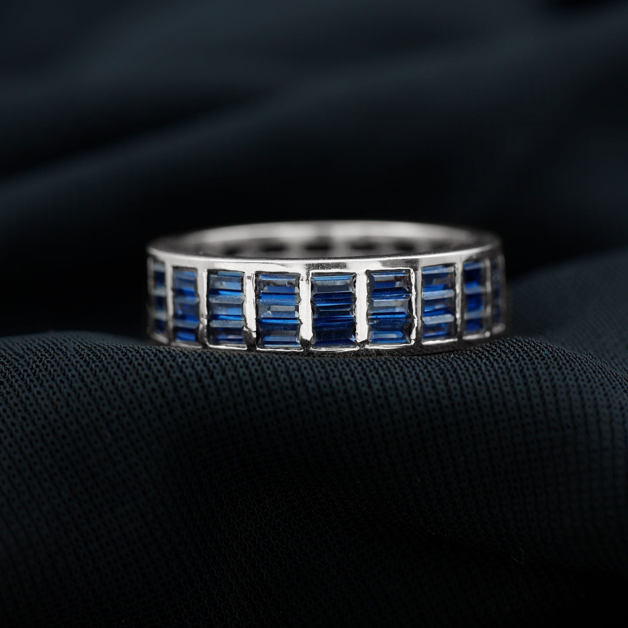 Deepen and strengthen your love with the rich and royal blue hue of this Created Blue Sapphire Eternity Band. Surprise her on your anniversary with this captivating piece, beautifully adorned with stunning color and embellishment. Let this Wide Eternity Ring be the expression of your enduring love, symbolizing the profound connection you share.