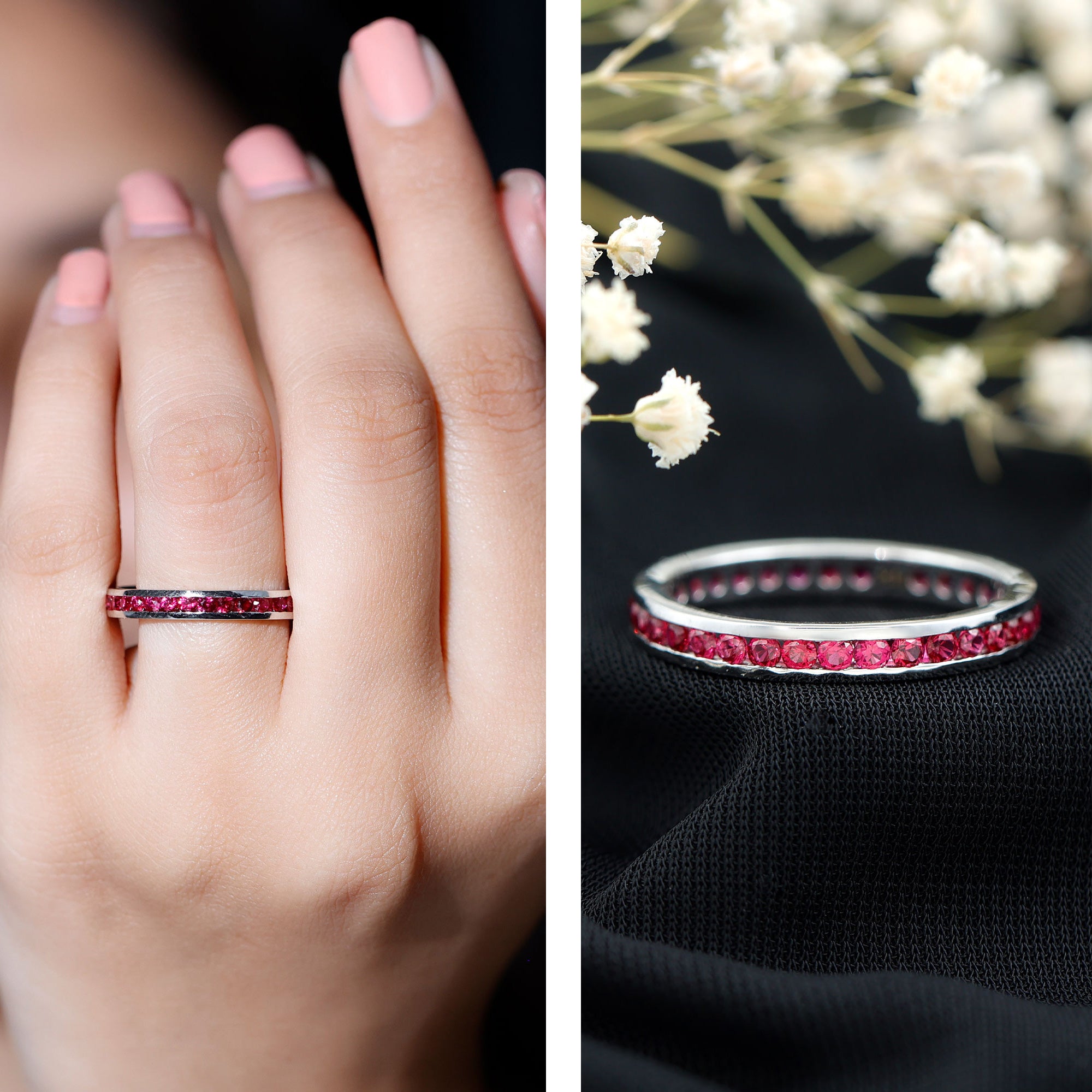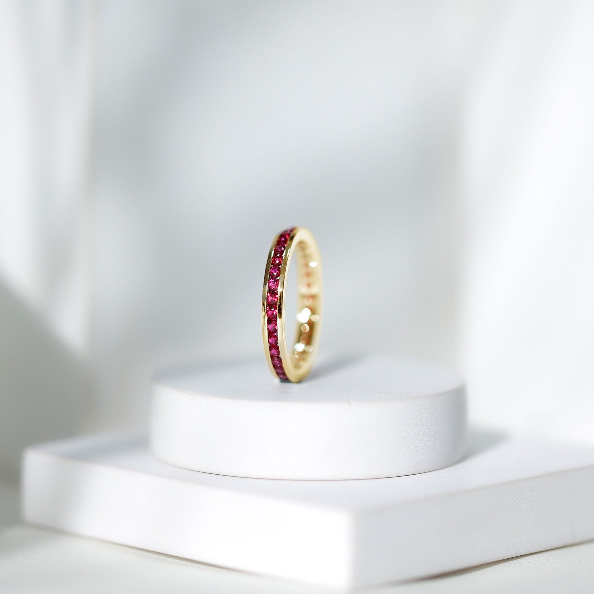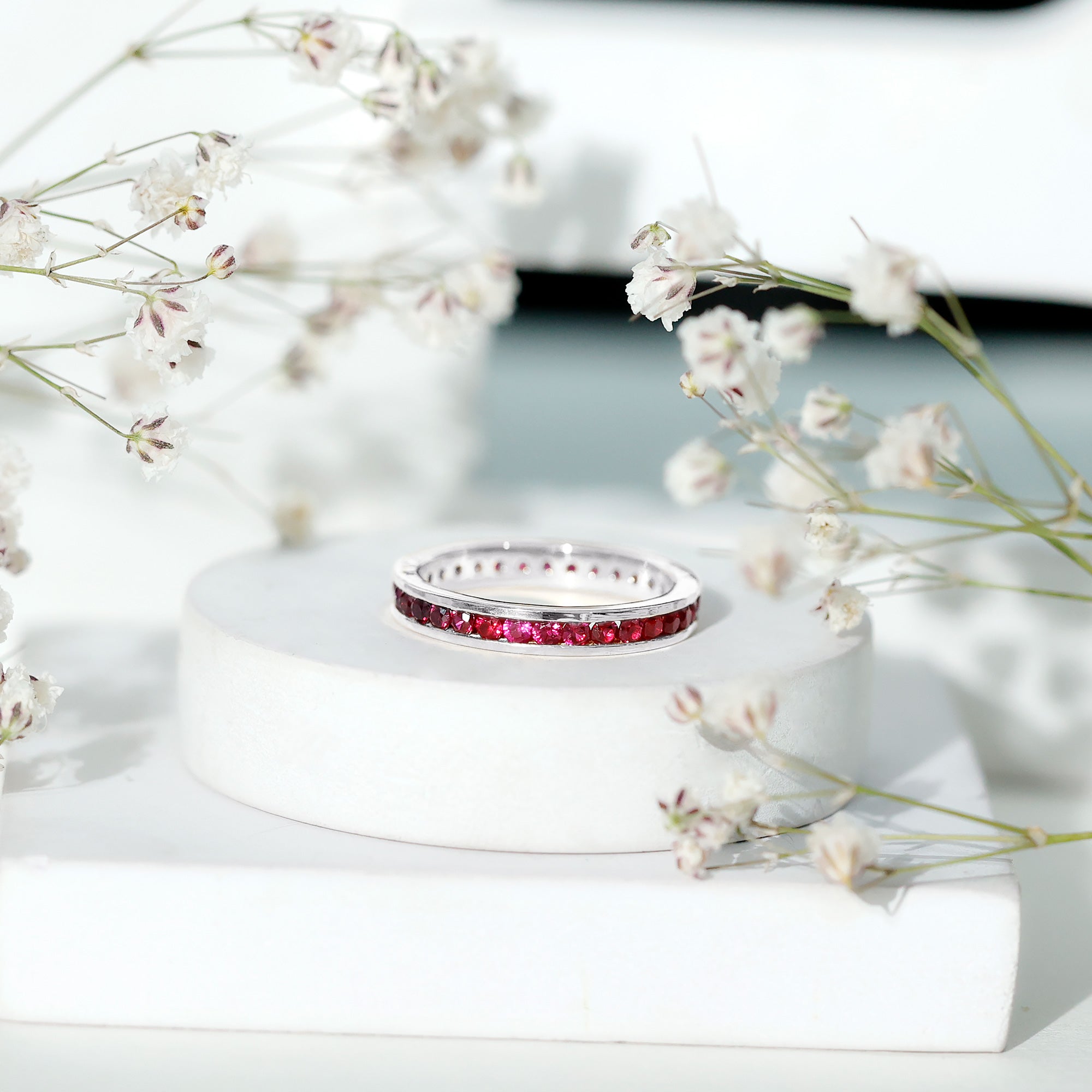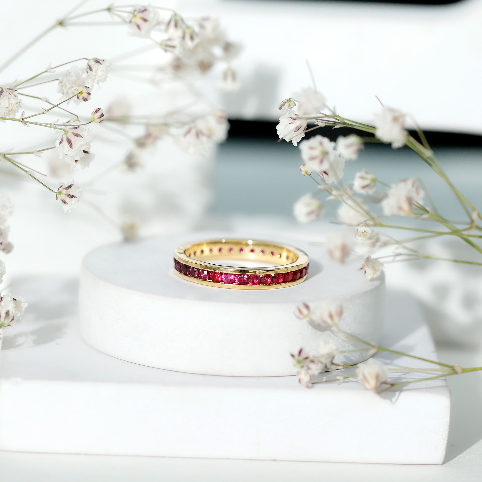 Show your love with this stunning Full Eternity Band Ring, featuring Round Cut Lab Created Ruby set in a Channel Setting. This beautiful ring is crafted in Solid Gold for a charming appeal, making it the perfect gift for your beloved.