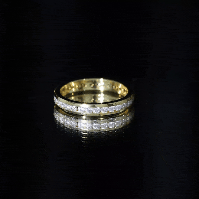 Create an unforgettable moment with this Moissanite Eternity Ring. This ring is embedded with Round Shape Moissanites delicately placed in Channel Setting that exudes sophistication and elegance. This ring is the perfect symbol for enduring love which is the reminder of your unbreakable bond. This Channel Set Wedding Band beholds the unmatchable shine of D-VS1 quality Moissanites embedded in the ring that makes the epitome of wisdom and strength of the relationship. Make your D-day Special with this Moissanite Wedding Ring, that can be styled in both ways either solely or as a stack ring with the statement ring.