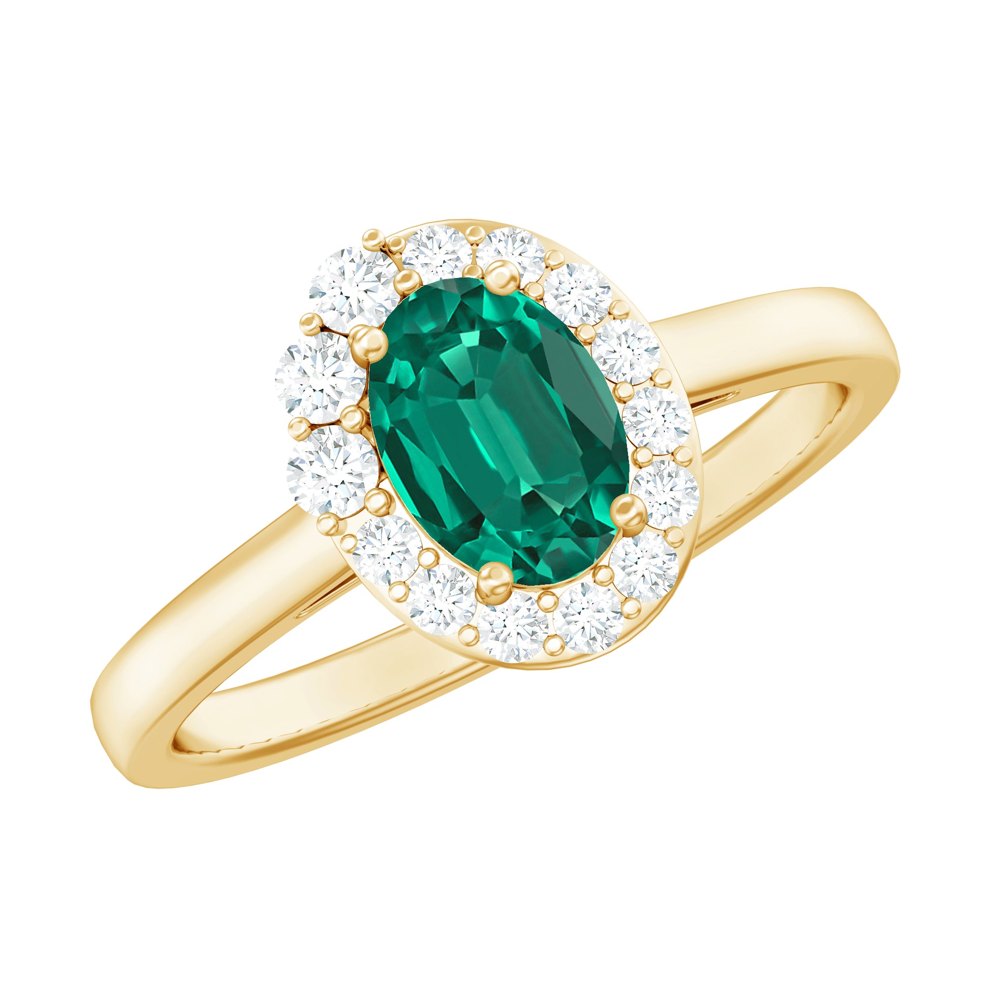 Classic 5X7 mm Oval Lab Grown Emerald Engagement Ring with Diamond Halo