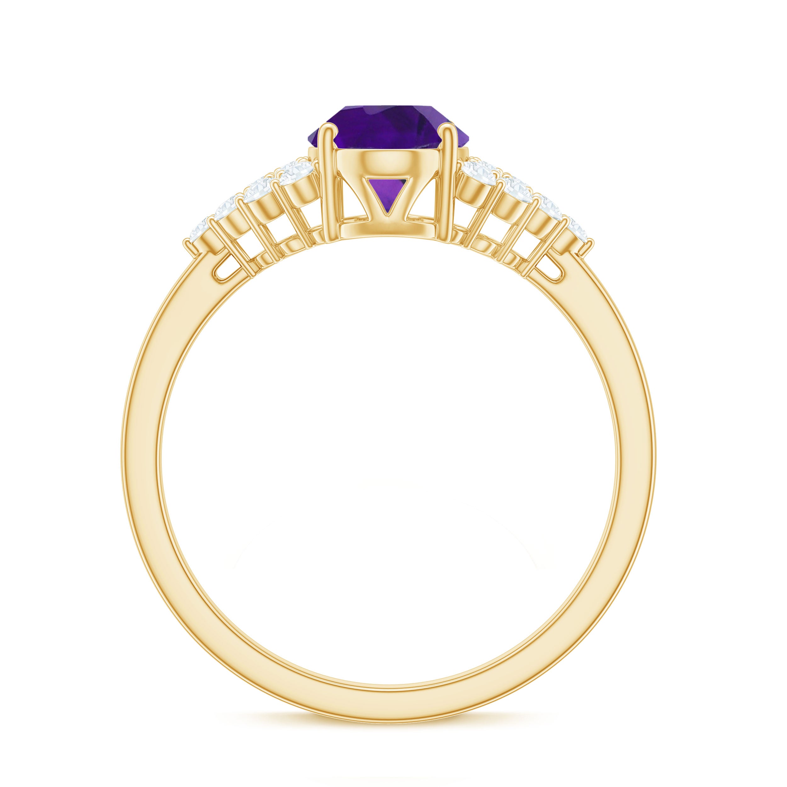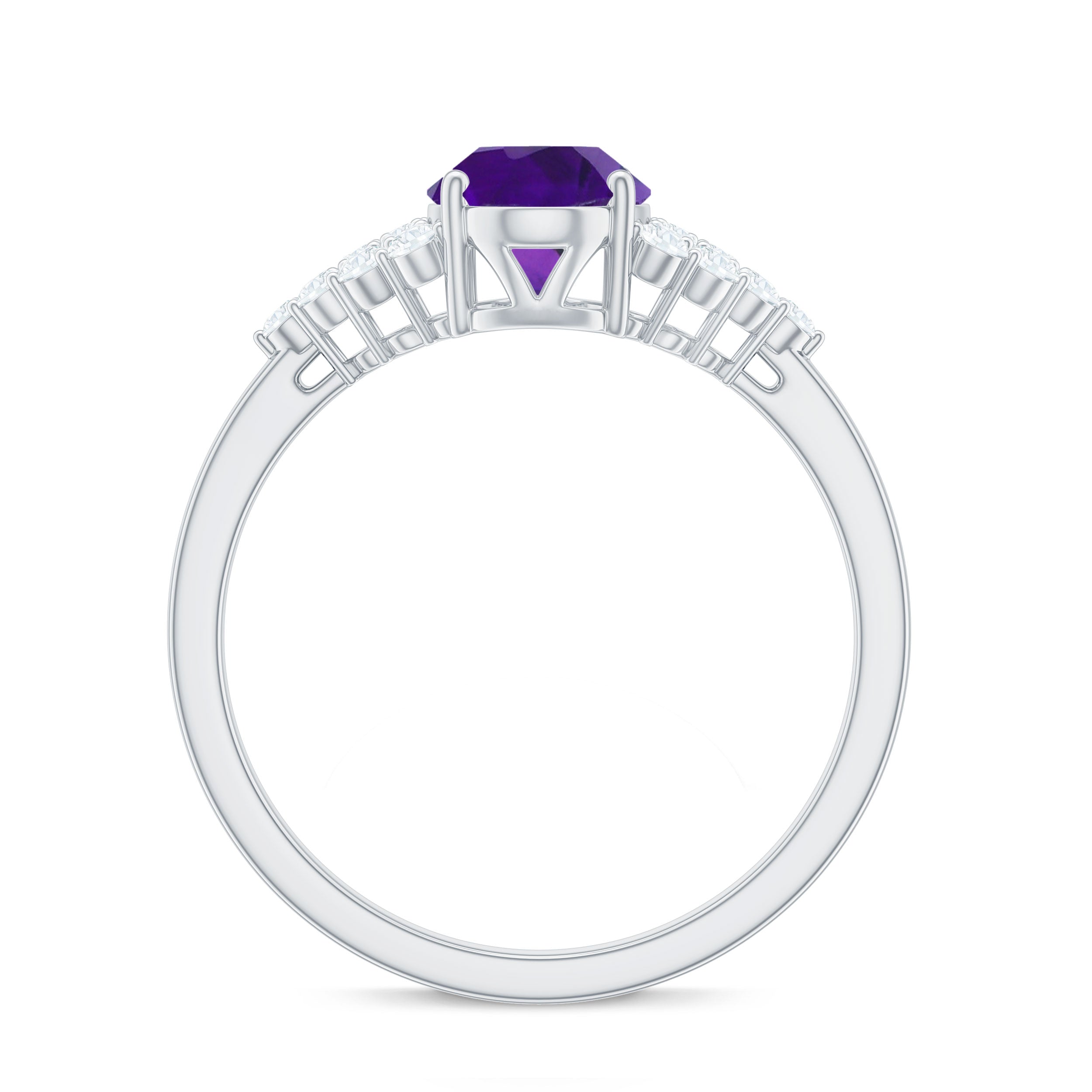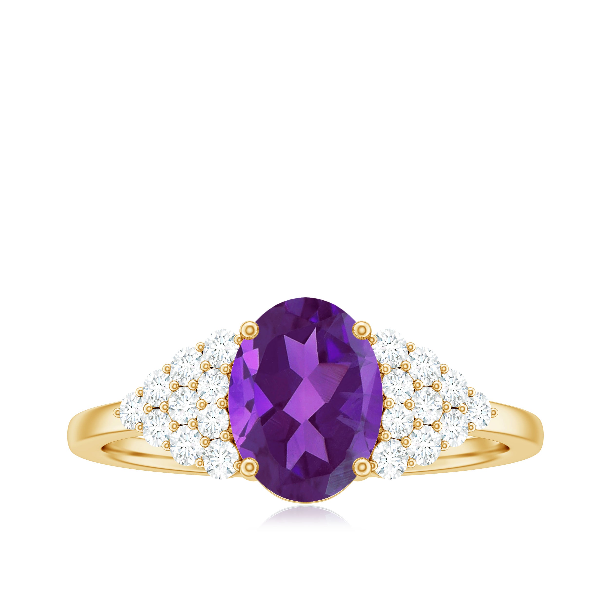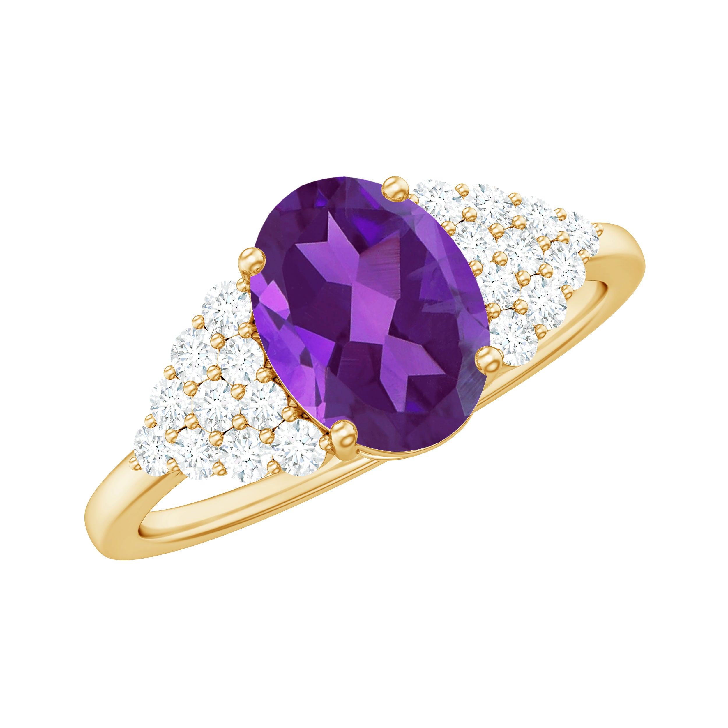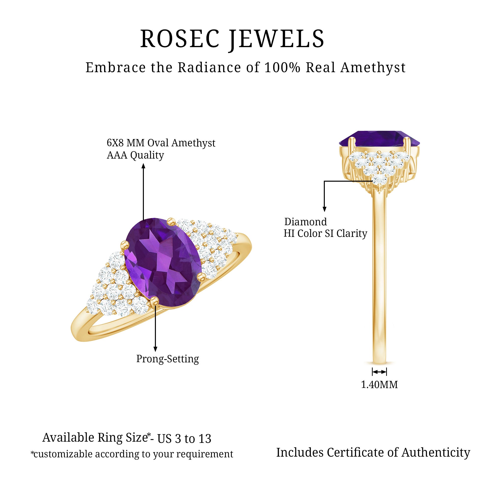 Wait no more to commemorate your love with an Amethyst and Diamond Engagement Ring as classic as your love story! It features the Center Stone of 6X8 MM Oval Shape Amethyst, secured by Prong Setting to add a touch of luxury. It is further illuminated by a cluster of Round Shape Diamond accentuated on either side. Each stone in this Certified Amethyst Ring has been rewarded with a top-notch quality grade, making it a bauble that forever shines as bright as your love.