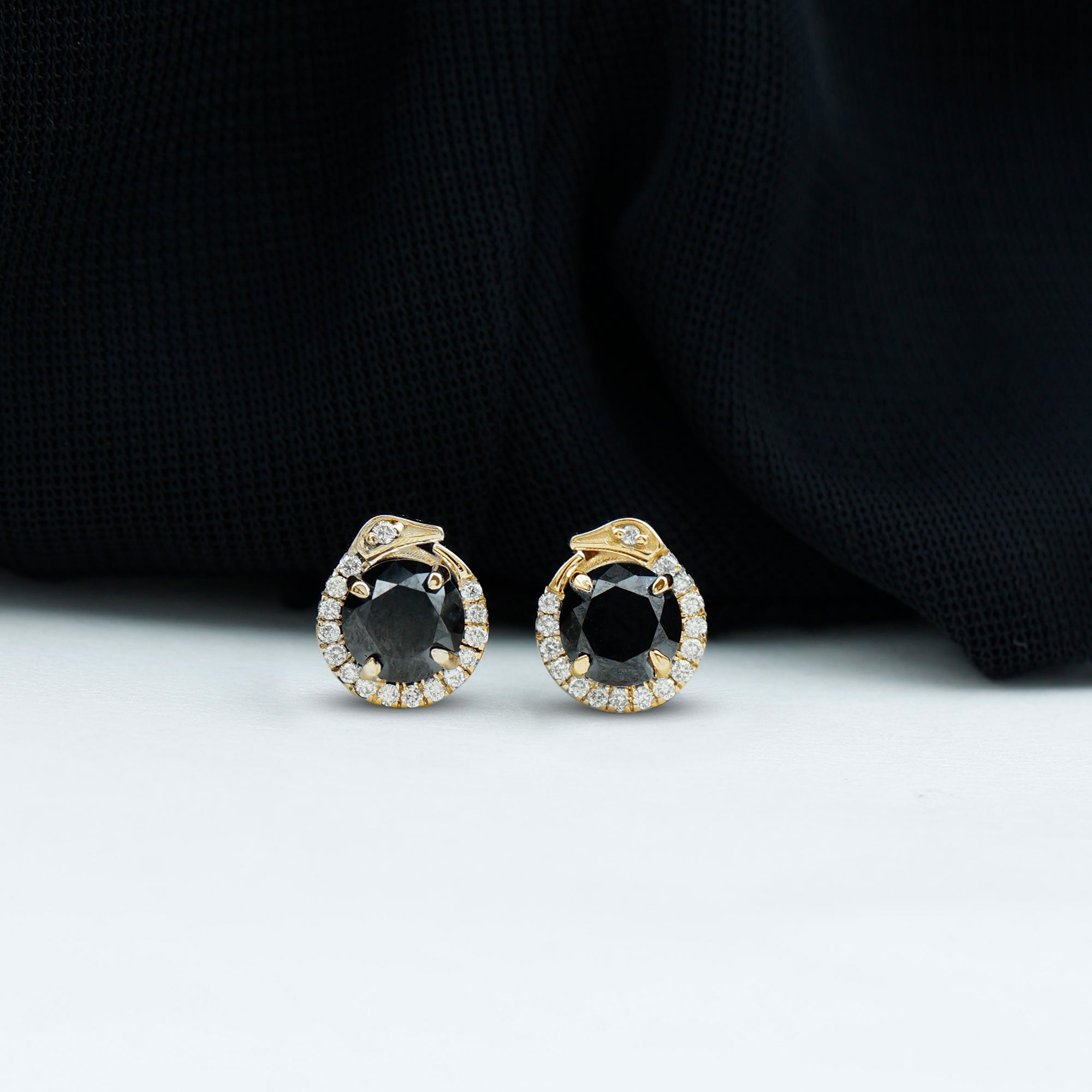Elevate your style with our Snake Stud Earrings, where a captivating Round Black Diamond takes center stage set in claw setting, surrounded by glistening white diamonds along the snake tail. These black diamond earrings are a unique and enchanting choice, combining the allure of black and white diamonds with a striking snake motif, making them a conversation-worthy accessory for any occasion.