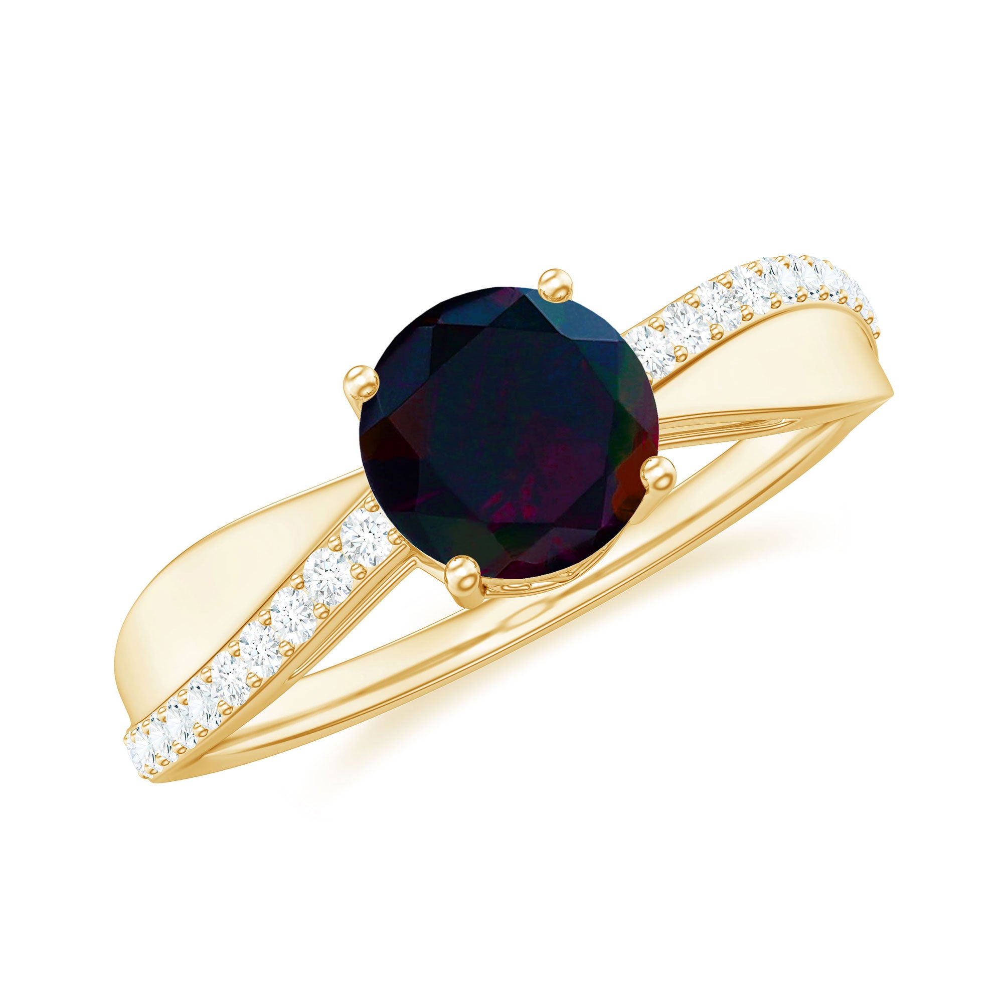 This exquisite black opal engagement ring with diamonds is a symbol of your eternal love and commitment. This solitaire engagement ring has a round-shaped black opal gemstone in the center with sparkling diamond side stones in a prong setting. If you are planning to make your engagement special and unique then this ring is just the perfect option for you. This October birthstone ring is more than just a piece of jewelry; its a promise of a lifetime of love and adventure.