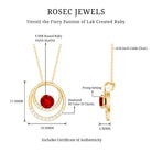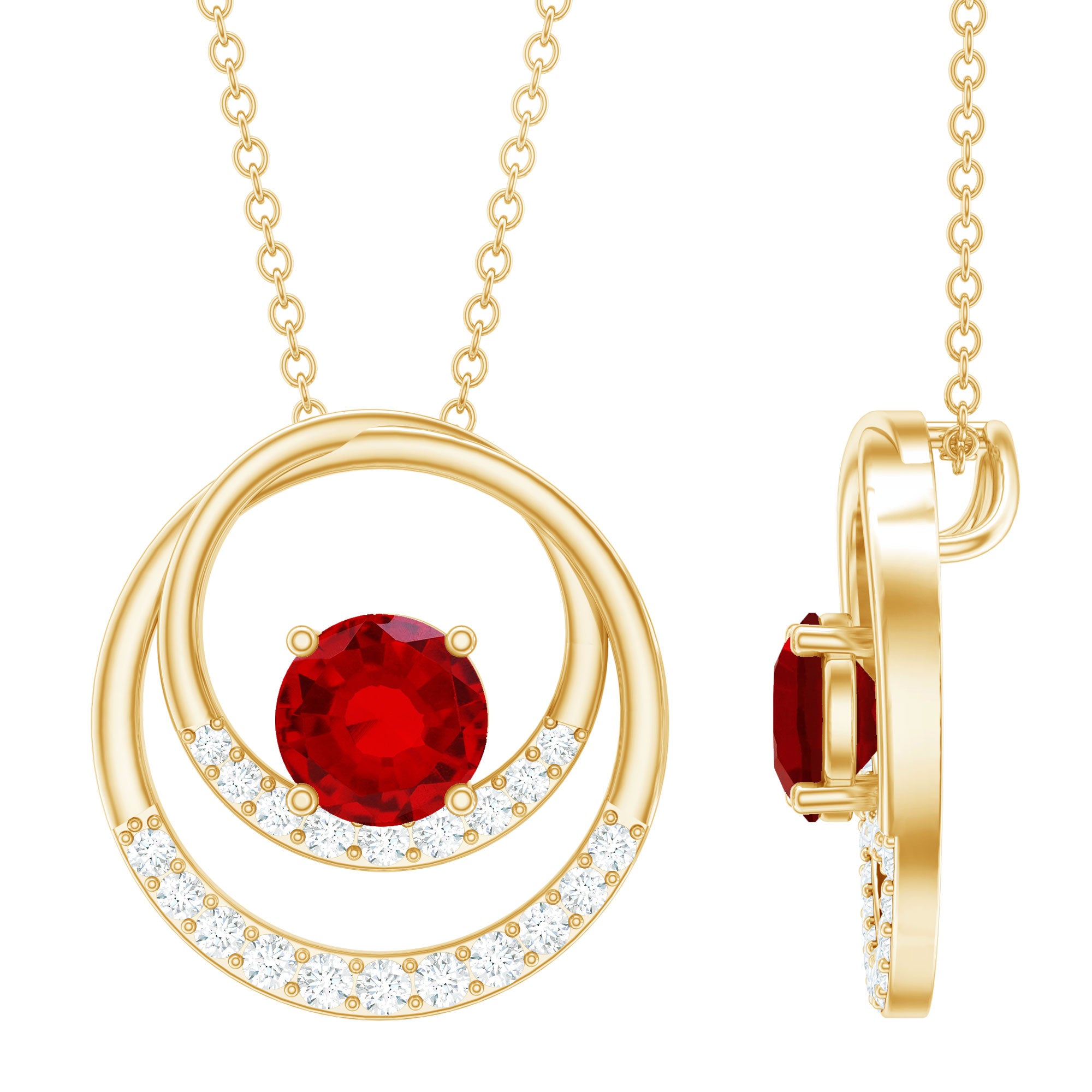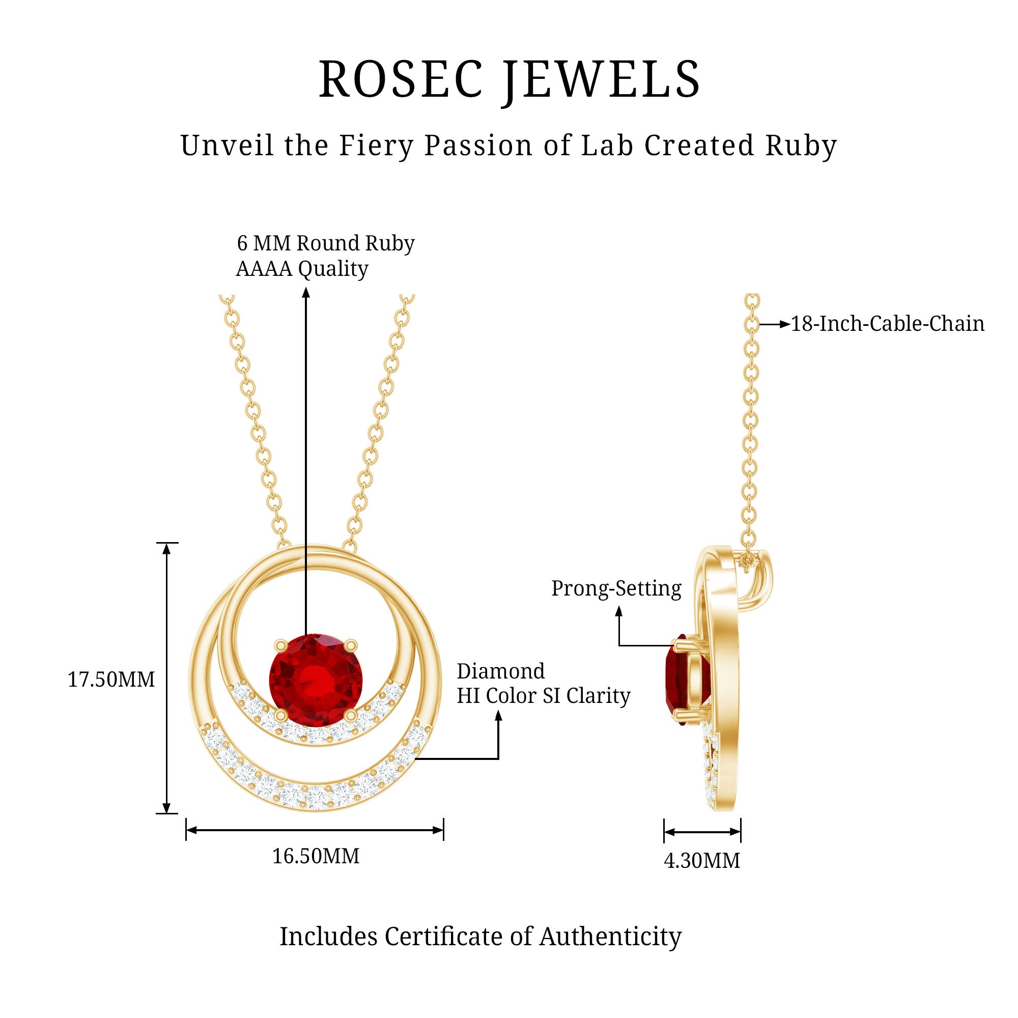 The focal point of this Diamond open circle pendant is the created ruby that instantly captures all the attention with its eye-catching hue. The created ruby is accompanied by an interlocked circle frame, that represents infinite ties and lasting bonds. It consists of a hidden bale that adds a bit of suspense and excitement to the glittering design.