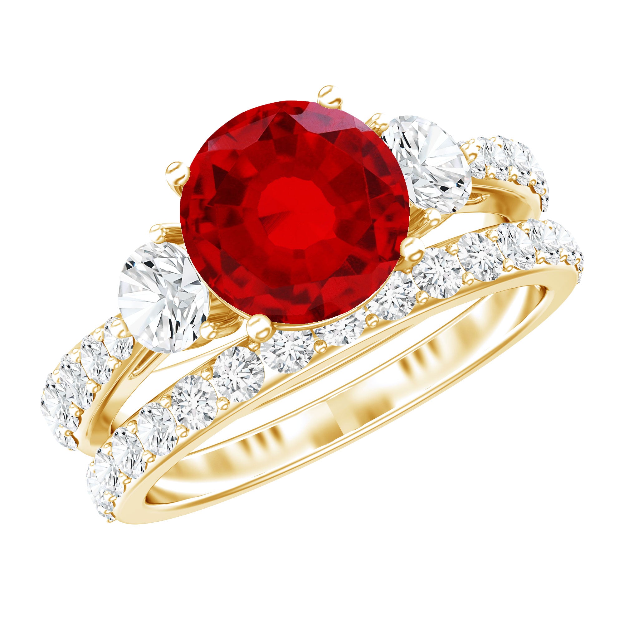 Adorn your loves finger with this beautiful Wedding Ring Set. Featuring an 8 MM Round Cut Lab Created Ruby solitaires set in a prong setting and accented with round cut moissanite side stones, this exquisite set is crafted in solid gold for an elegant and timeless look.