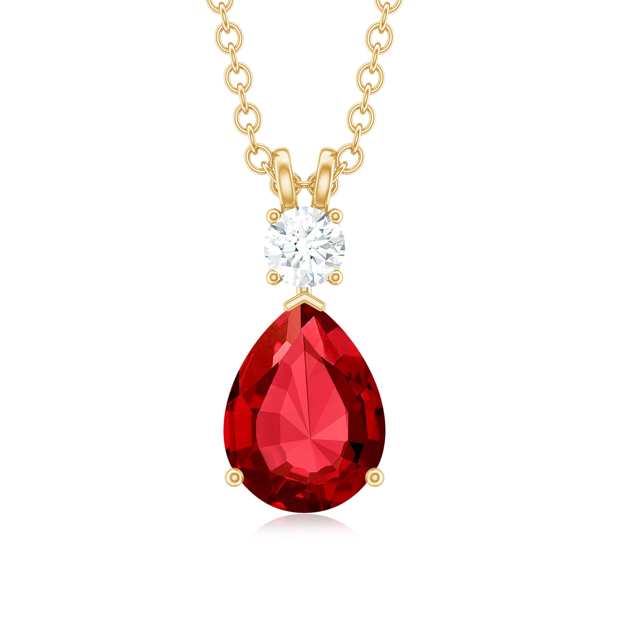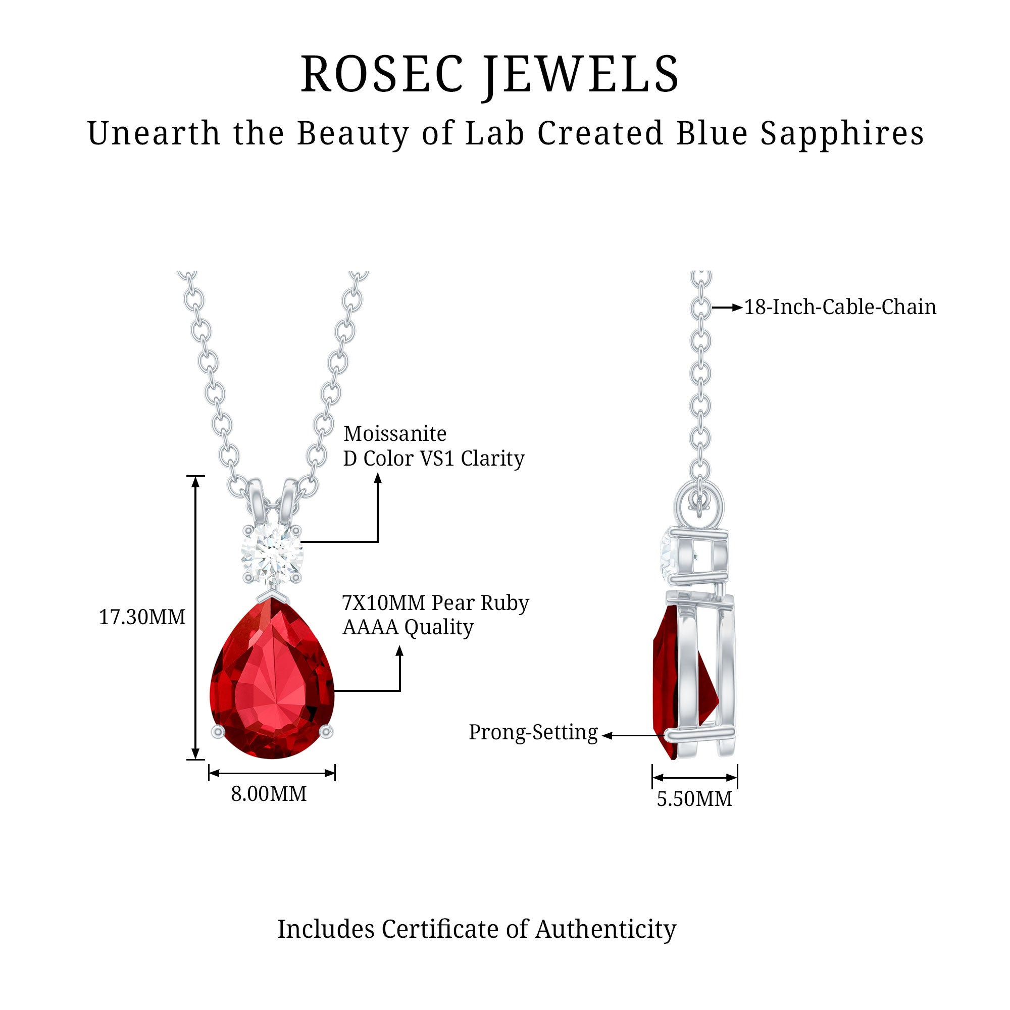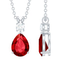 Behold the exquisite Teardrop Necklace, a true marvel of craftsmanship. Its centerpiece features a captivating Pear Shape Lab Created Ruby, embraced tenderly by a splendid Prong Setting. Adding to its allure, a Round Moissanite on the top casts a spellbinding aura. This mesmerizing creation serves as the ideal adornment, elevating any ensemble to a new level of elegance and charm.