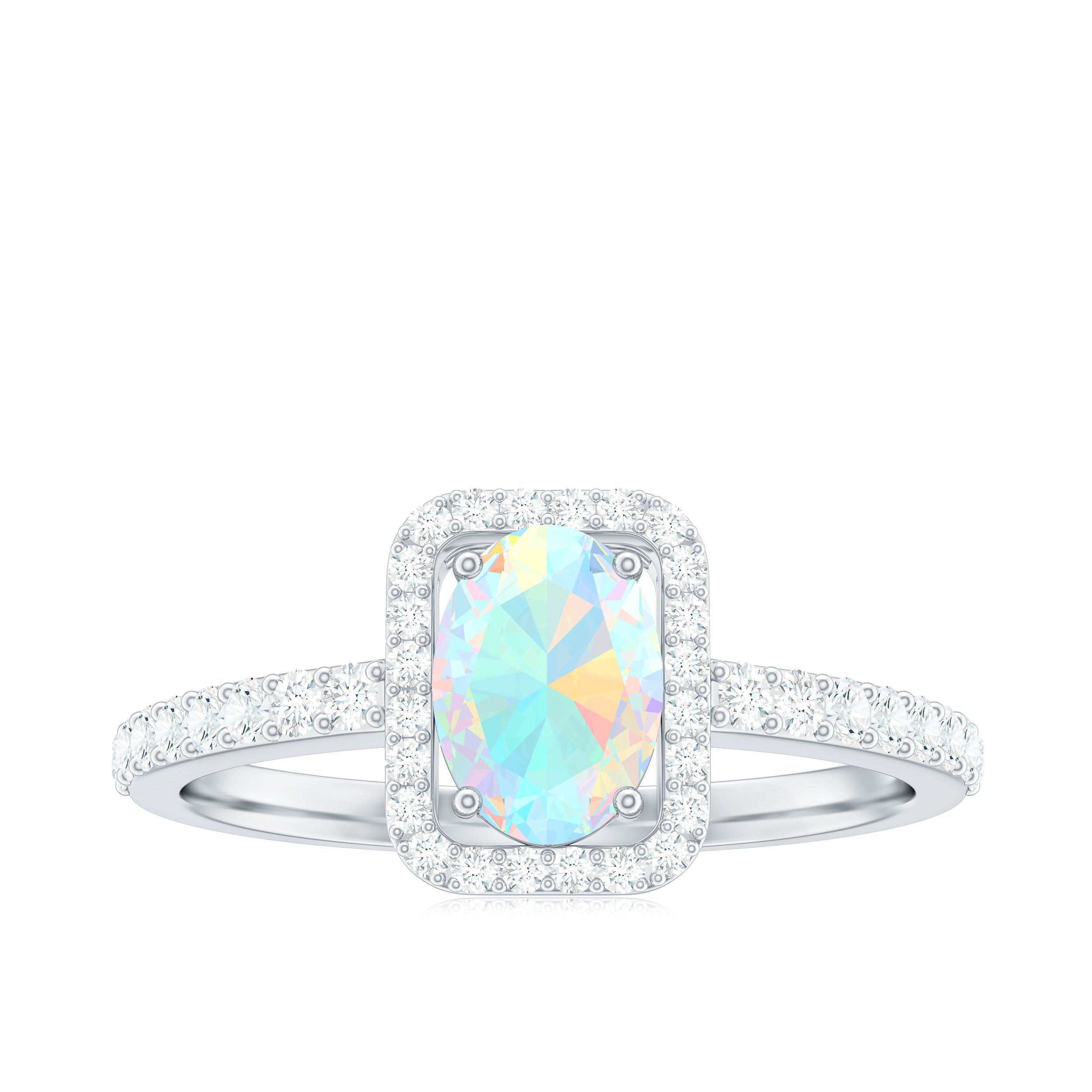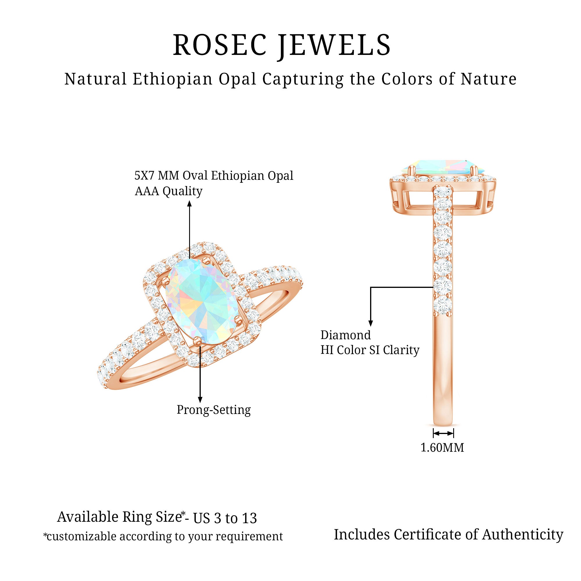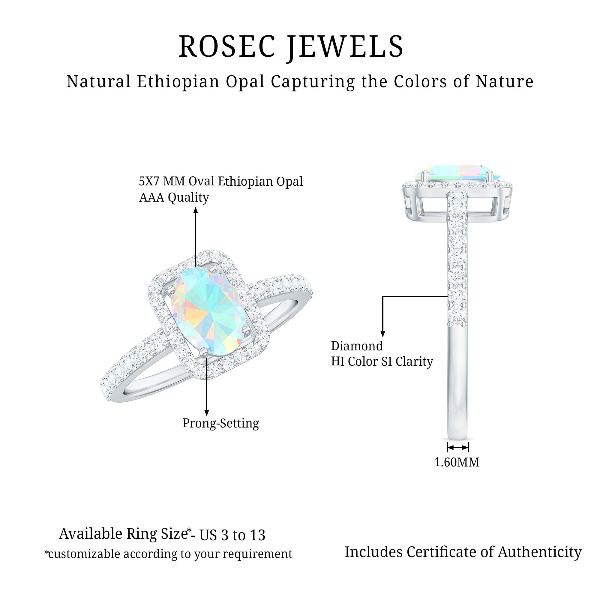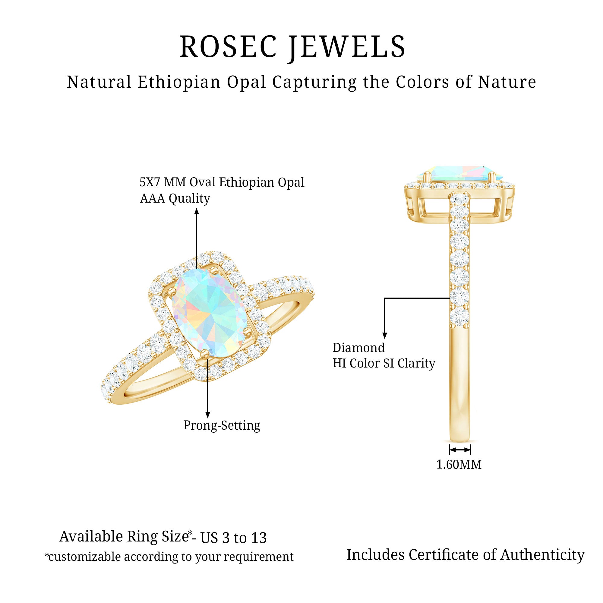 A breathtaking expression of love and luxury, this Ethiopian Opal Engagement Ring is a true masterpiece. At its center lies an enchanting 5X7 mm Oval Shape Ethiopian Opal of AAA Quality in Prong Setting. Set within a sleek rectangular frame, the Opal is beautifully complemented by a shimmering Halo of Diamond stones, casting a mesmerizing sparkle from every angle. The Side Stones over the band further enhance the natural allure of Opal, adding a touch of elegance and sophistication to the design. With its timeless design and captivating beauty, this Oval Engagement Ring is a reflection of the bond you share. Available in various sizes and presented in an elegant jewelry box, this Classic Engagement Ring with Opal is ready to accompany you on the most important journey of your life. This Opal and Diamond Ring is a testament to your eternal love, crafted to shine as brightly as your shared dreams.