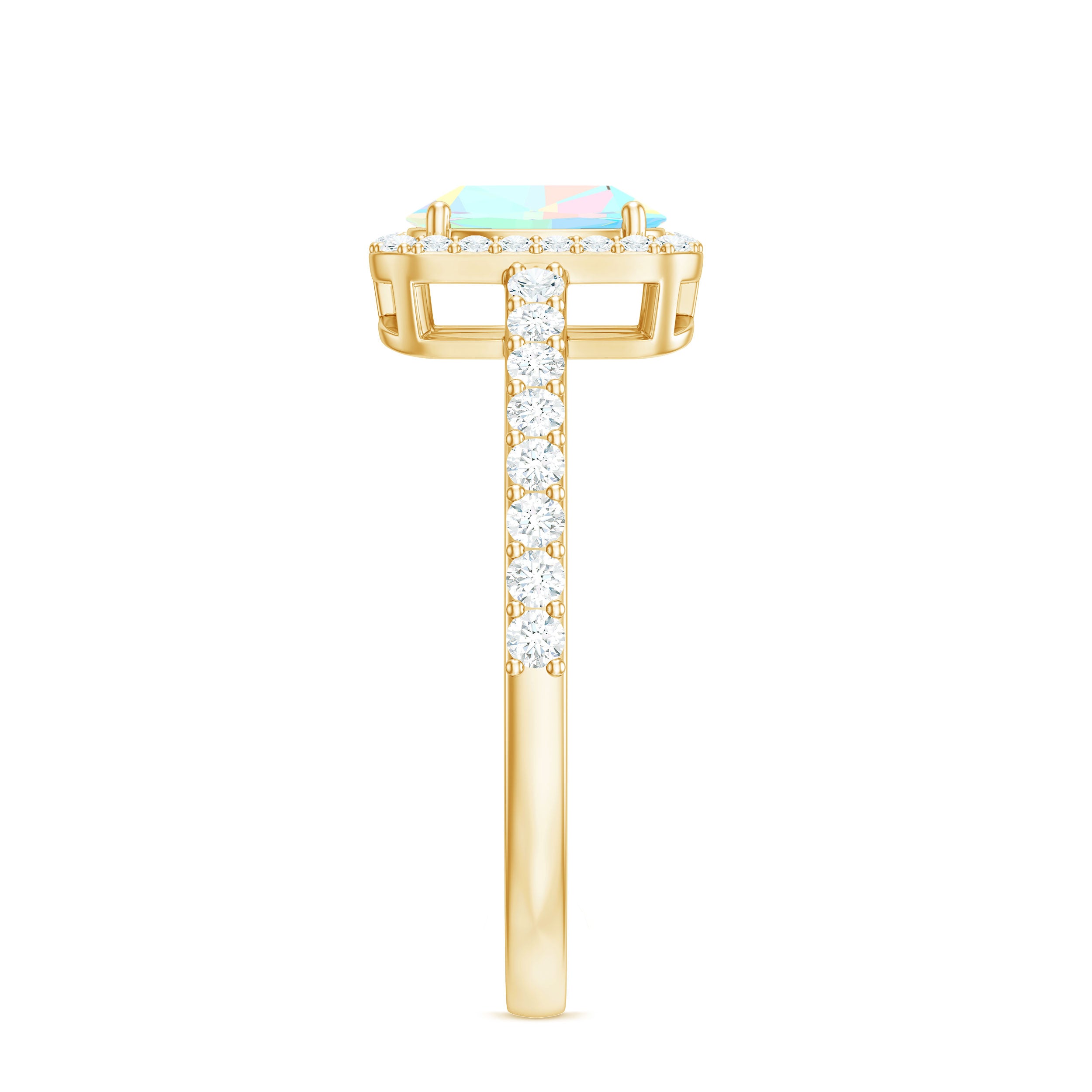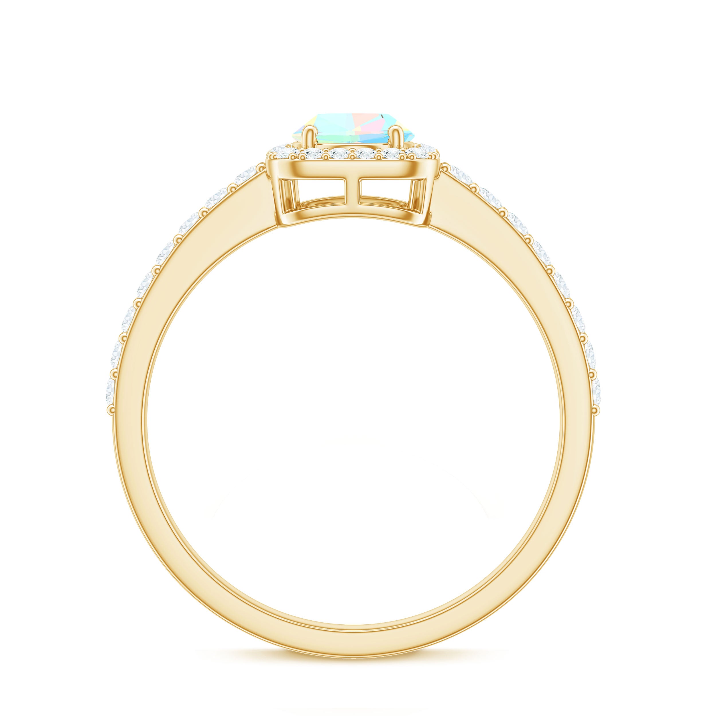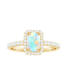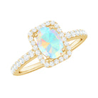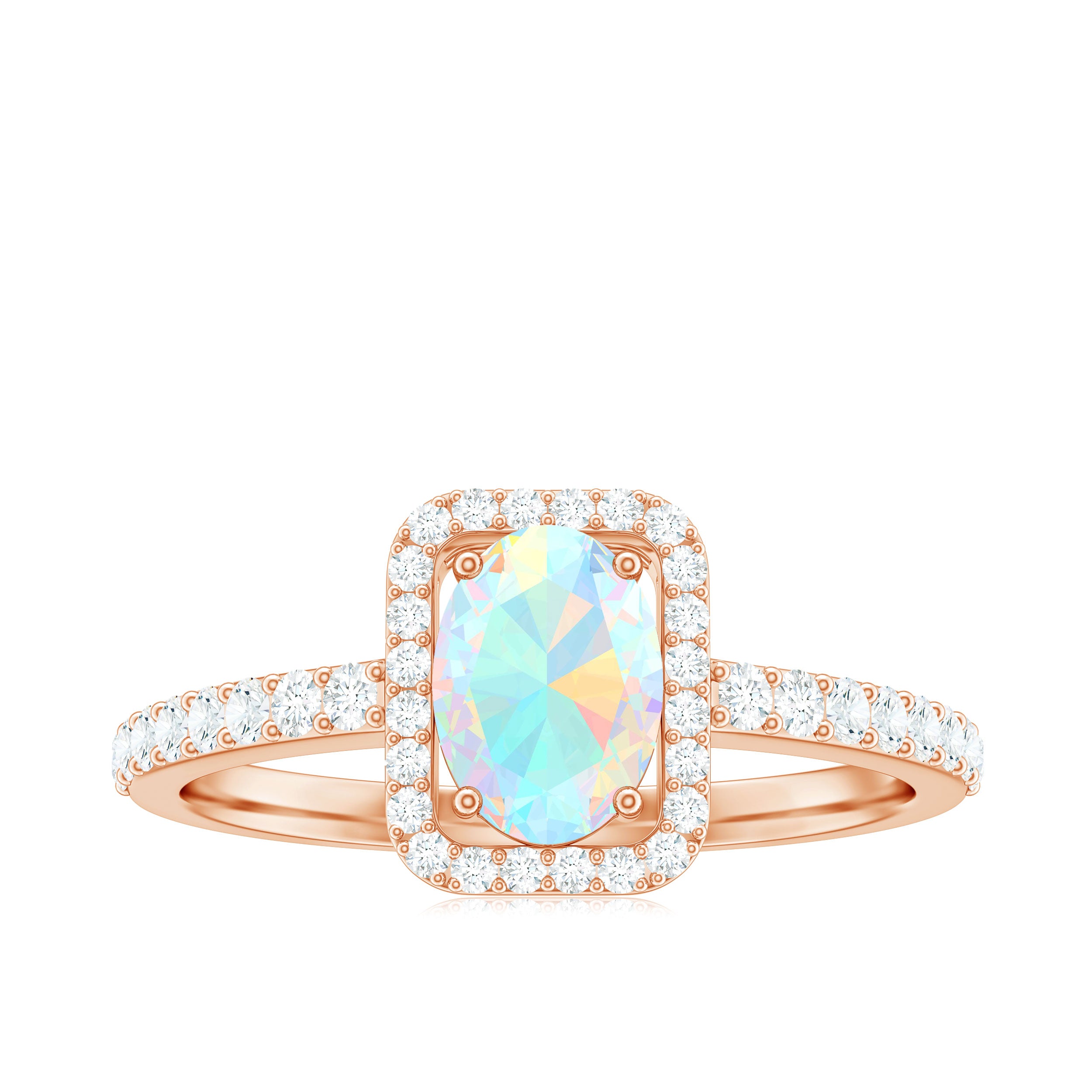 A breathtaking expression of love and luxury, this Ethiopian Opal Engagement Ring is a true masterpiece. At its center lies an enchanting 5X7 mm Oval Shape Ethiopian Opal of AAA Quality in Prong Setting. Set within a sleek rectangular frame, the Opal is beautifully complemented by a shimmering Halo of Diamond stones, casting a mesmerizing sparkle from every angle. The Side Stones over the band further enhance the natural allure of Opal, adding a touch of elegance and sophistication to the design. With its timeless design and captivating beauty, this Oval Engagement Ring is a reflection of the bond you share. Available in various sizes and presented in an elegant jewelry box, this Classic Engagement Ring with Opal is ready to accompany you on the most important journey of your life. This Opal and Diamond Ring is a testament to your eternal love, crafted to shine as brightly as your shared dreams.