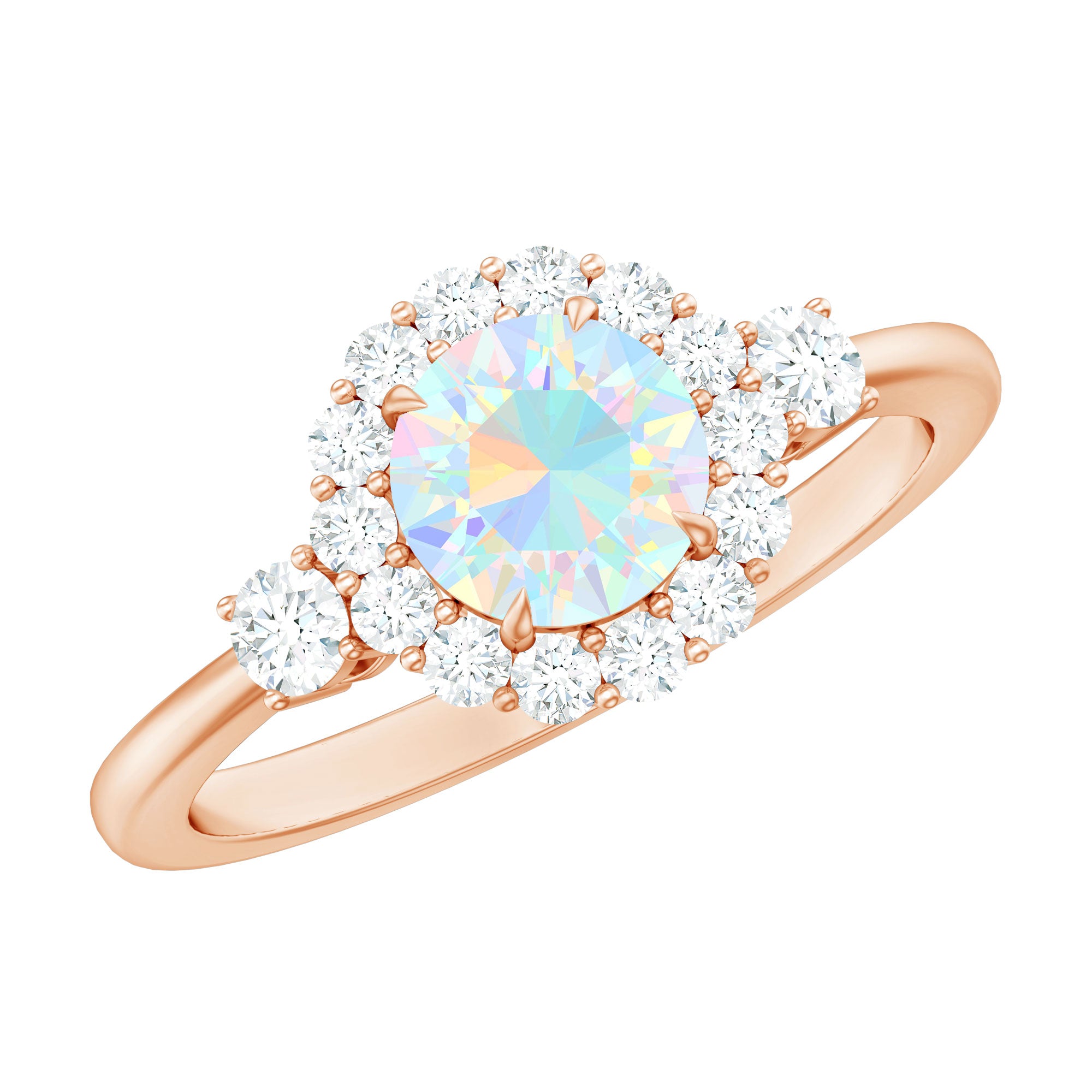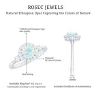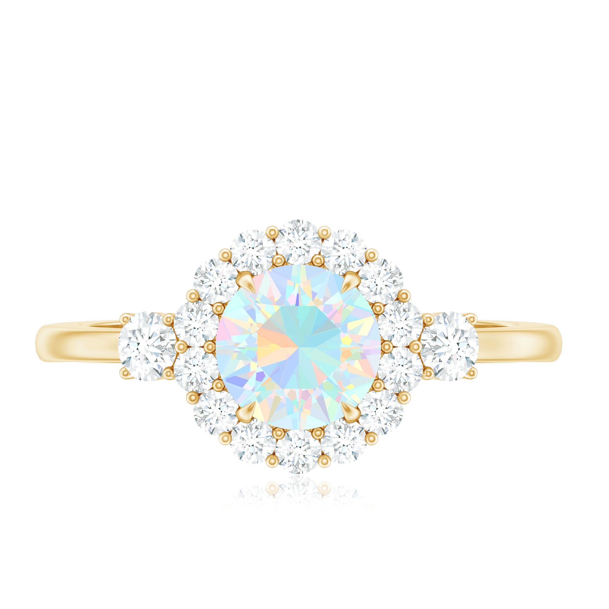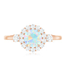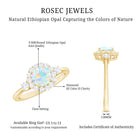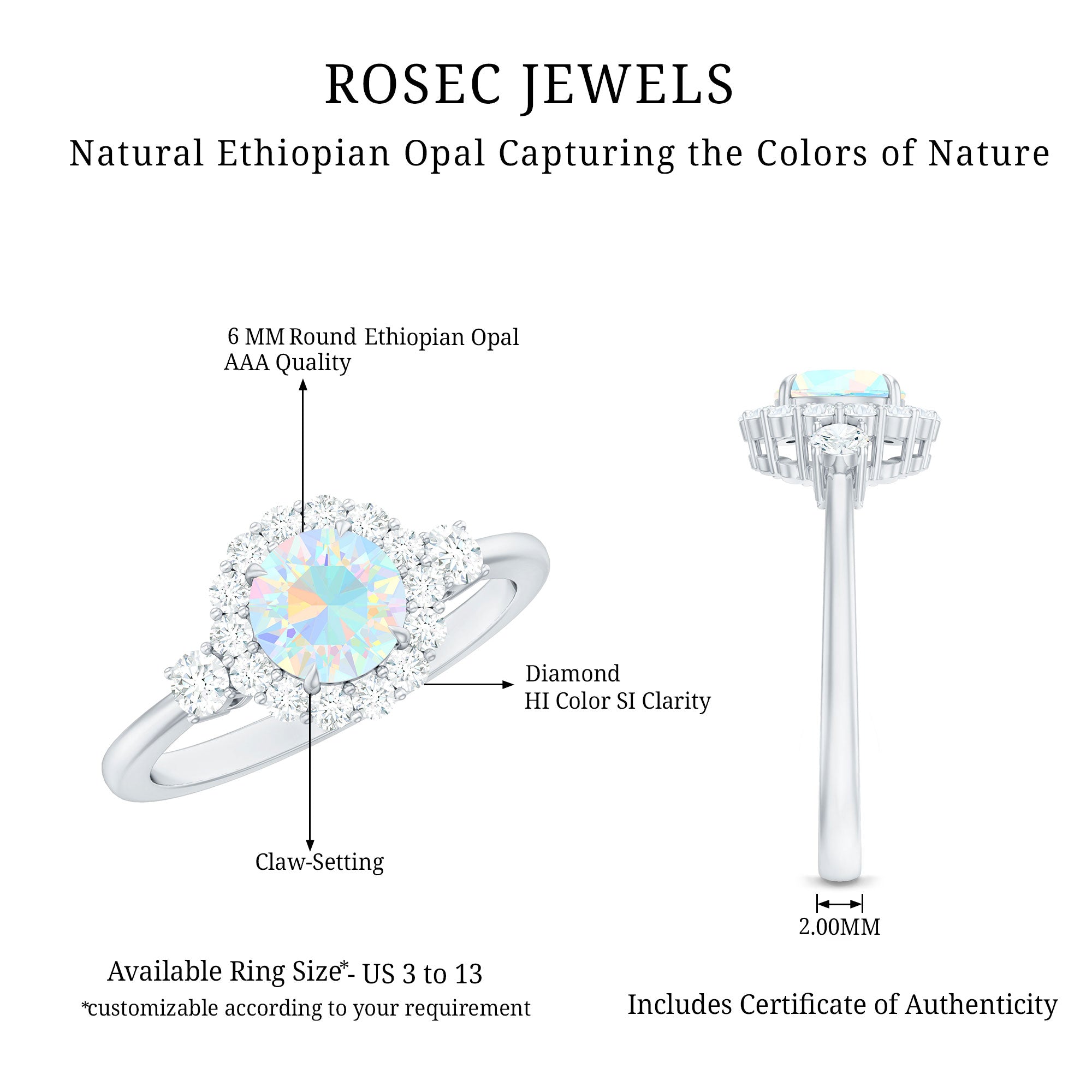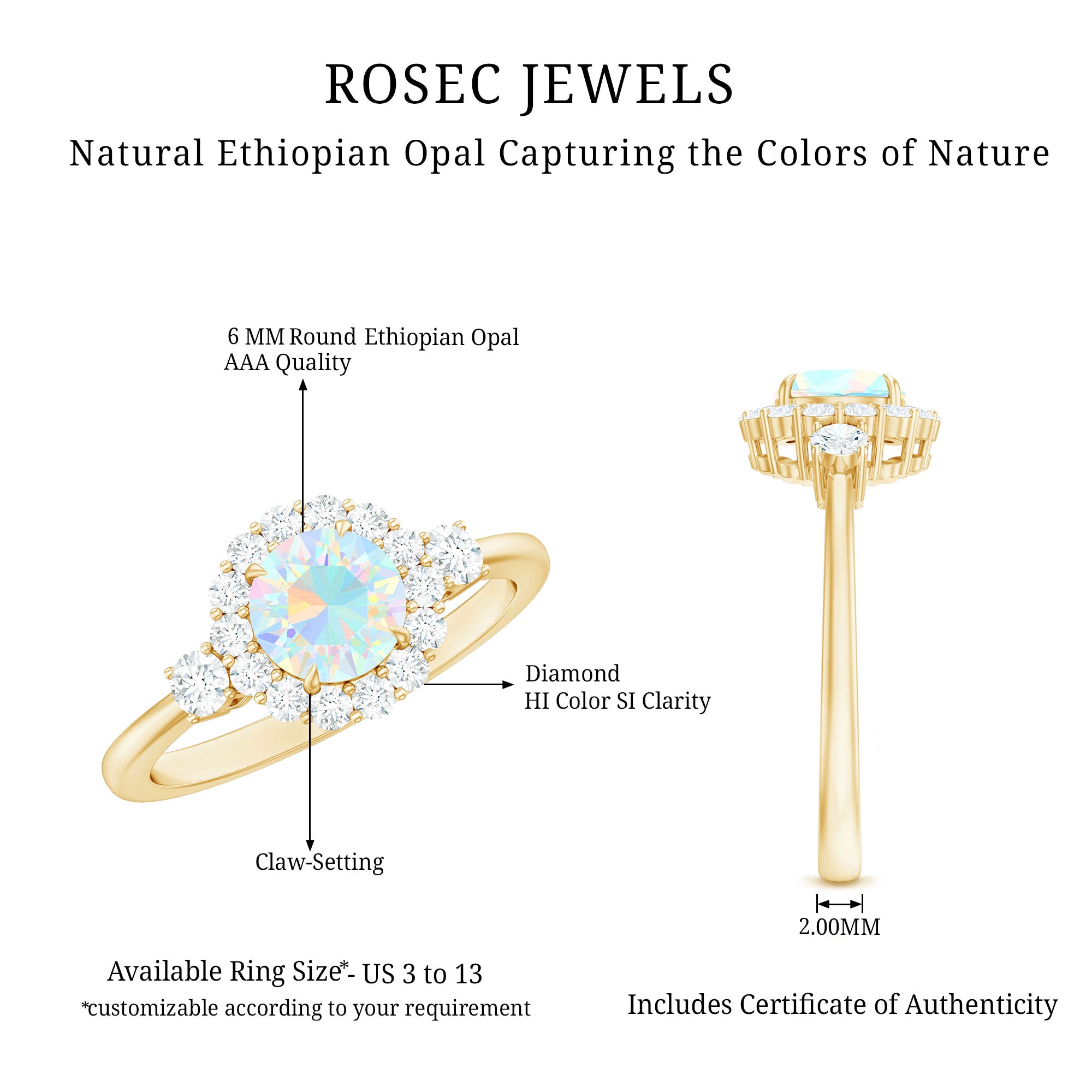 Dreamy and mesmerizing, this Classic Engagement Ring is made for the kind of love that feels both effortless and eternal. This Fine Engagement Ring features a glowing 6 mm Round Shape Ethiopian Opal that catches the light with every movement, revealing a soft rainbow of hues. Framed by a sparkling Diamond halo, the centerpiece is elevated to pure magic. On each side, a dainty Diamond adds just the right touch of elegance, like two stars guiding your forever journey. The design of this Opal and Diamond Ring is graceful yet unforgettable, blending classic beauty with a hint of whimsy, perfect for someone romantic at heart. Whether you are planning a surprise or choosing a ring together, this Halo Engagement Ring with Opal is a heartfelt symbol of strength and the lasting glow of love. Packaged in a beautiful jewelry box and available in a range of sizes, this Real Opal Engagement Ring is ready to fit perfectly into your most unforgettable moment.