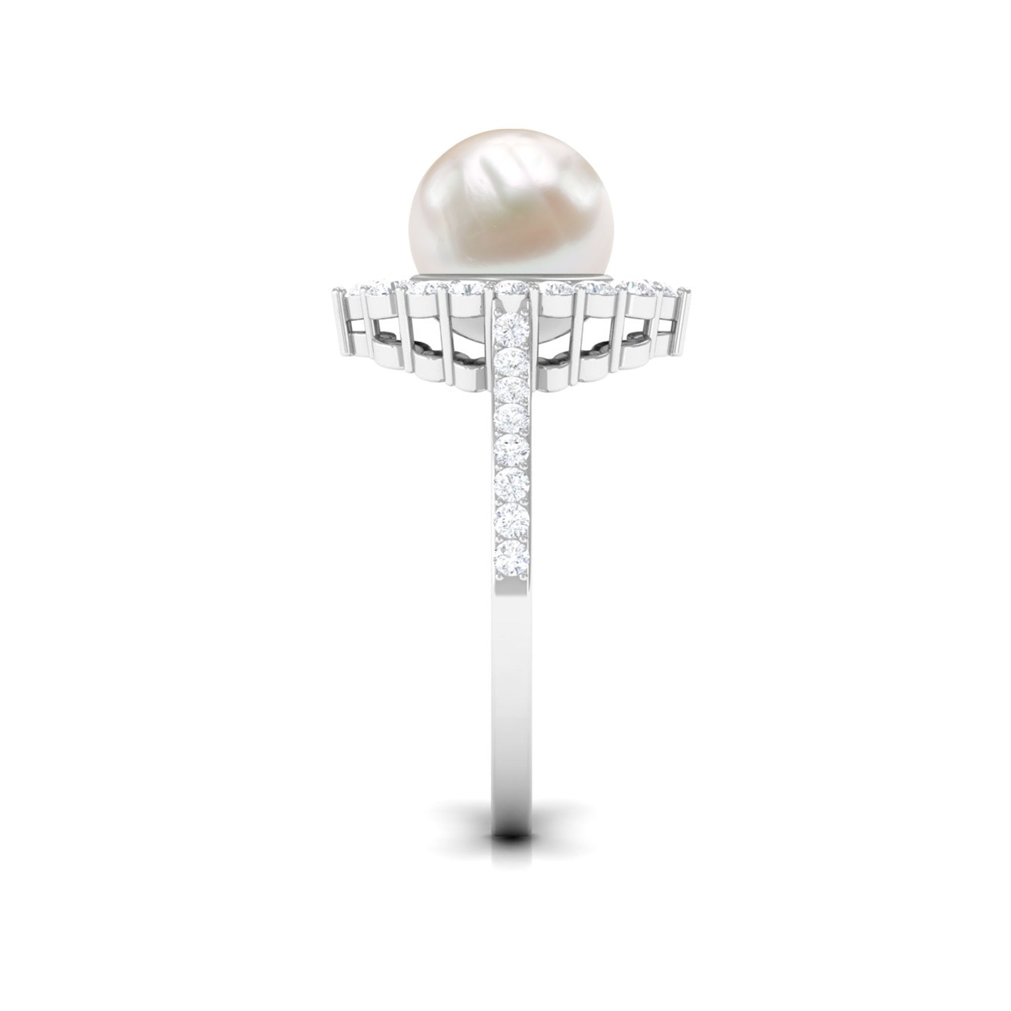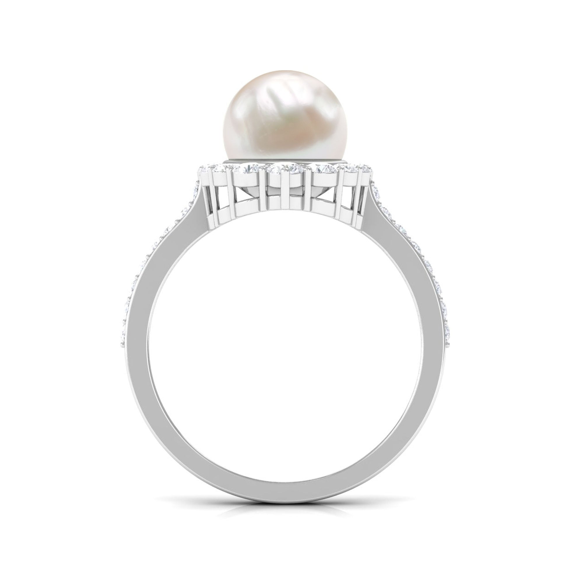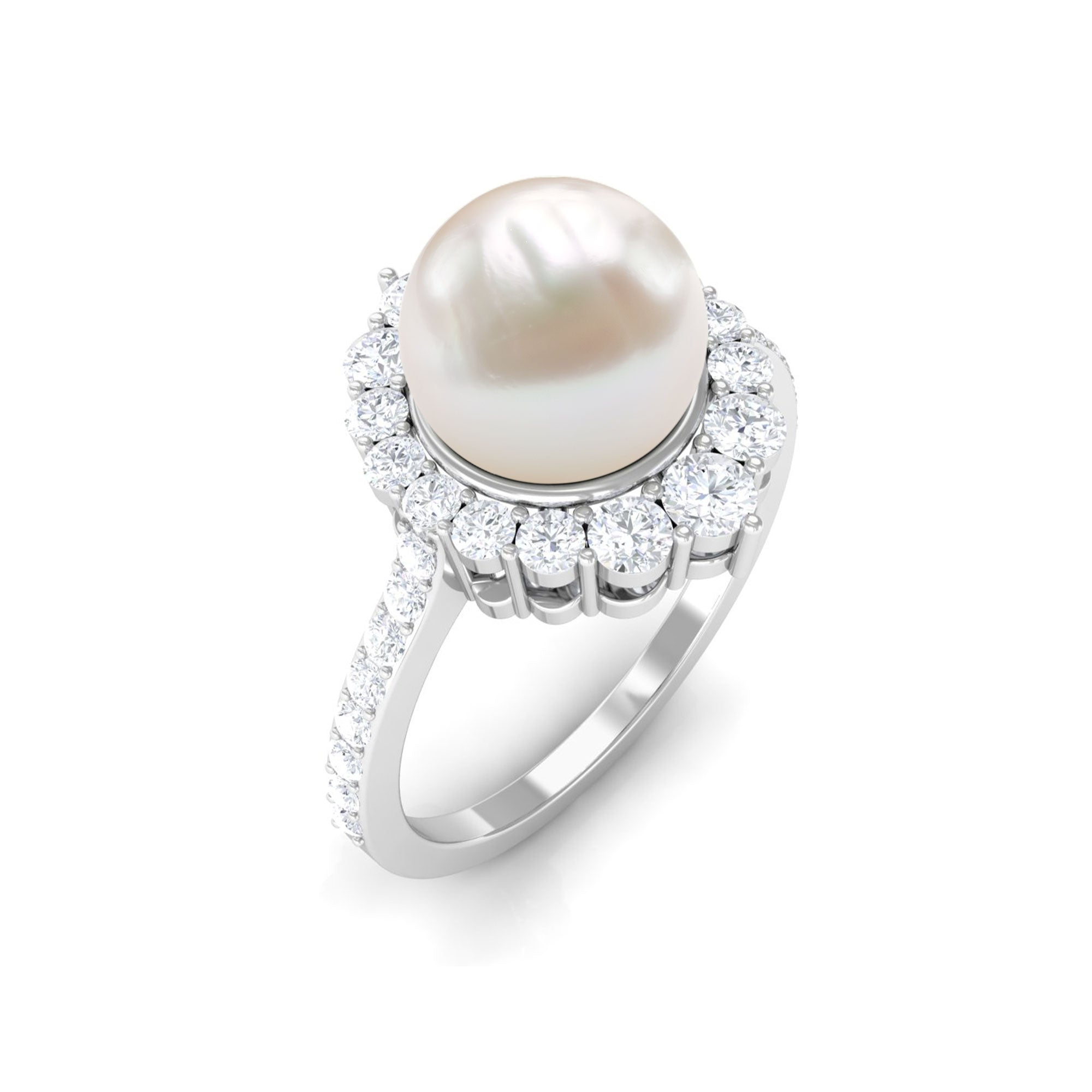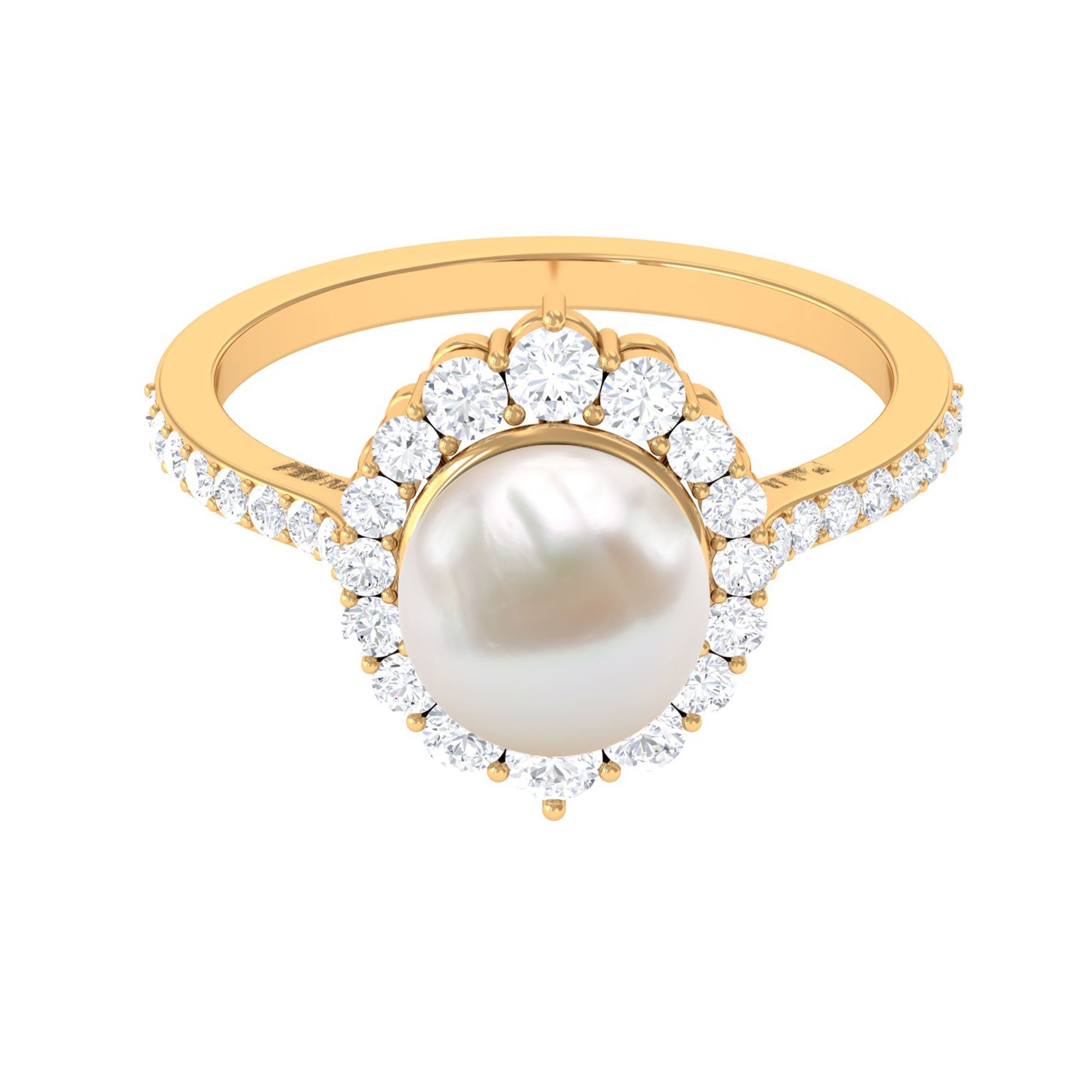 If youre easily captivated by classics, look no further than this Freshwater Pearl Halo Ring! Dripped in elegance, it features the Centerpiece of 8 MM Round Shape Freshwater Pearl, effortlessly secured by Bead Setting. For a scintillating touch, it has been adorned by shimmery Halo and side-stones of Round Shape Diamond. You could go from flaunting this Certified Pearl Ring everyday to saving it for special occasions and it wont fail to make a befitting statement.