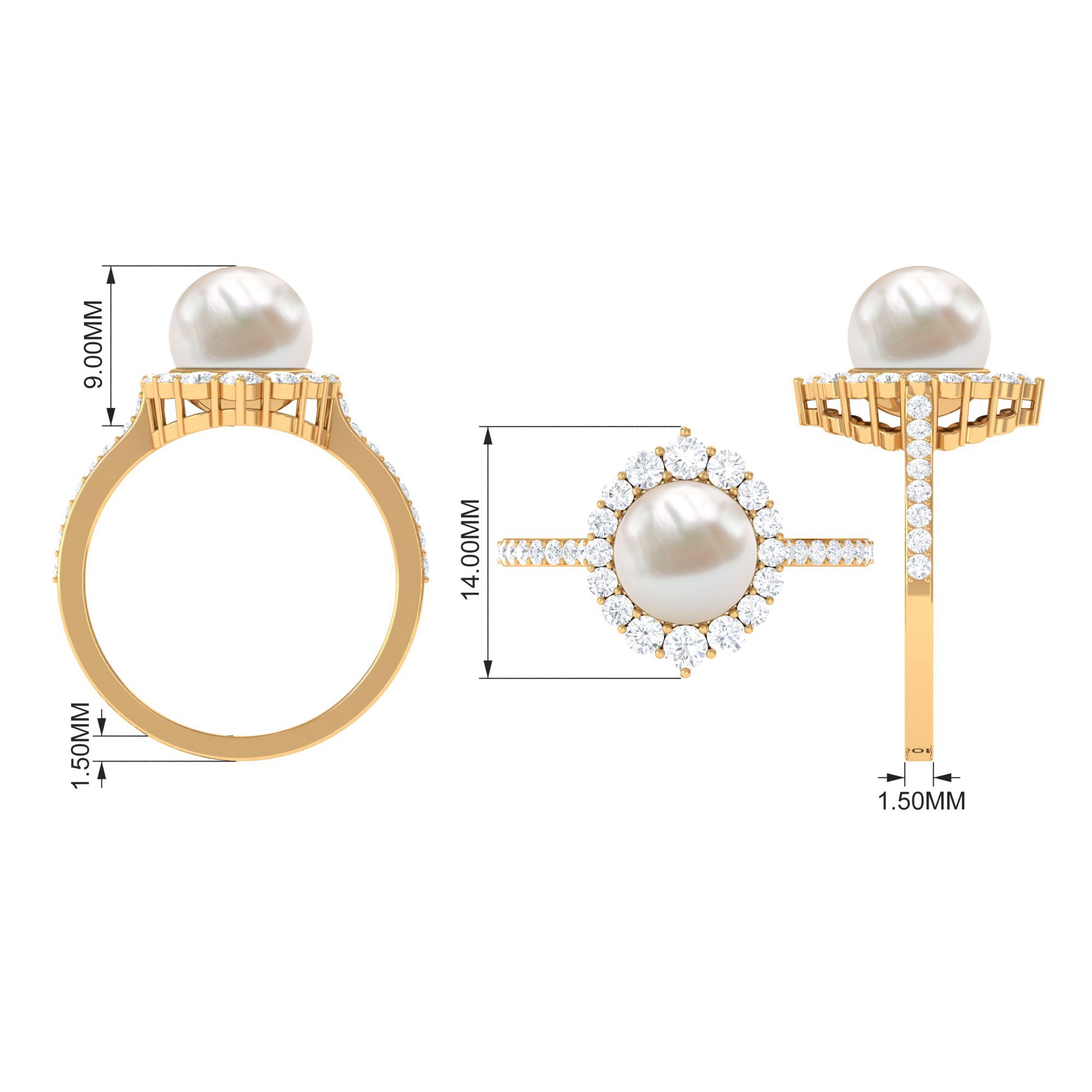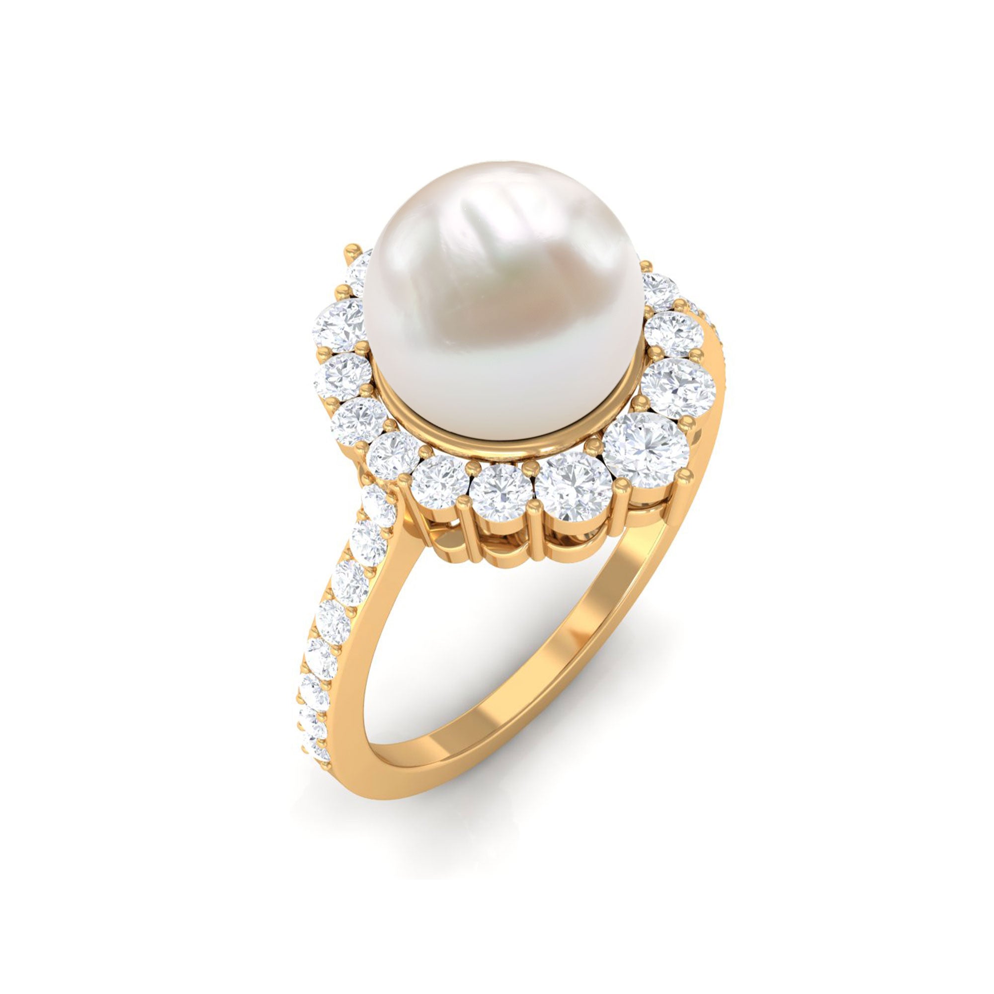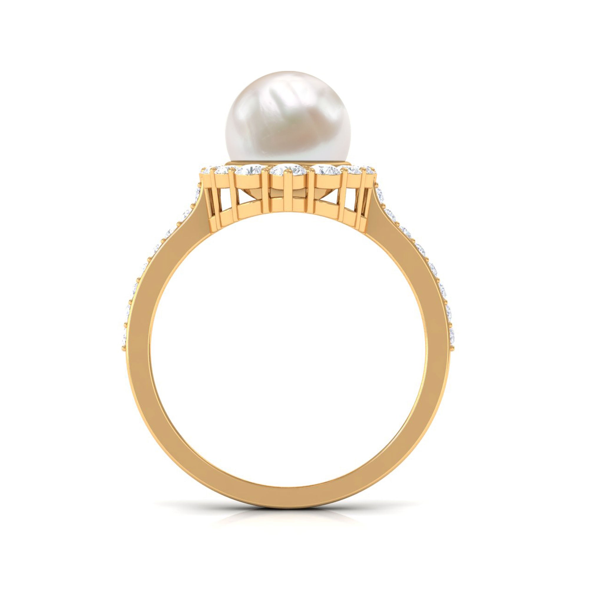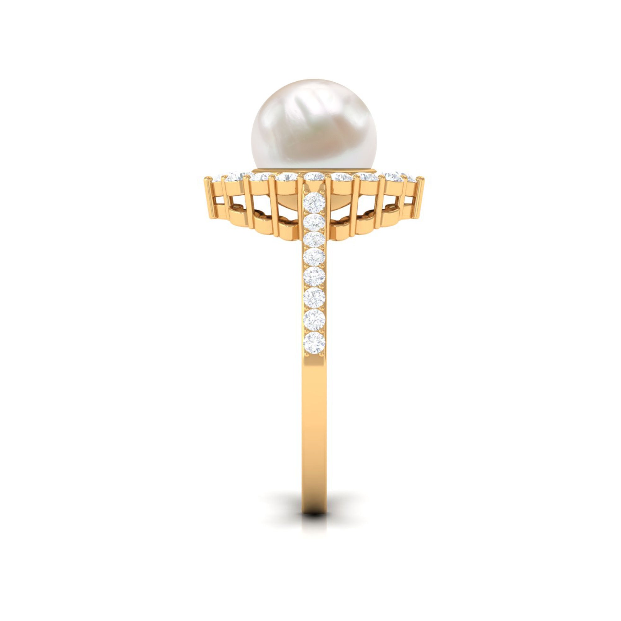 If youre easily captivated by classics, look no further than this Freshwater Pearl Halo Ring! Dripped in elegance, it features the Centerpiece of 8 MM Round Shape Freshwater Pearl, effortlessly secured by Bead Setting. For a scintillating touch, it has been adorned by shimmery Halo and side-stones of Round Shape Diamond. You could go from flaunting this Certified Pearl Ring everyday to saving it for special occasions and it wont fail to make a befitting statement.