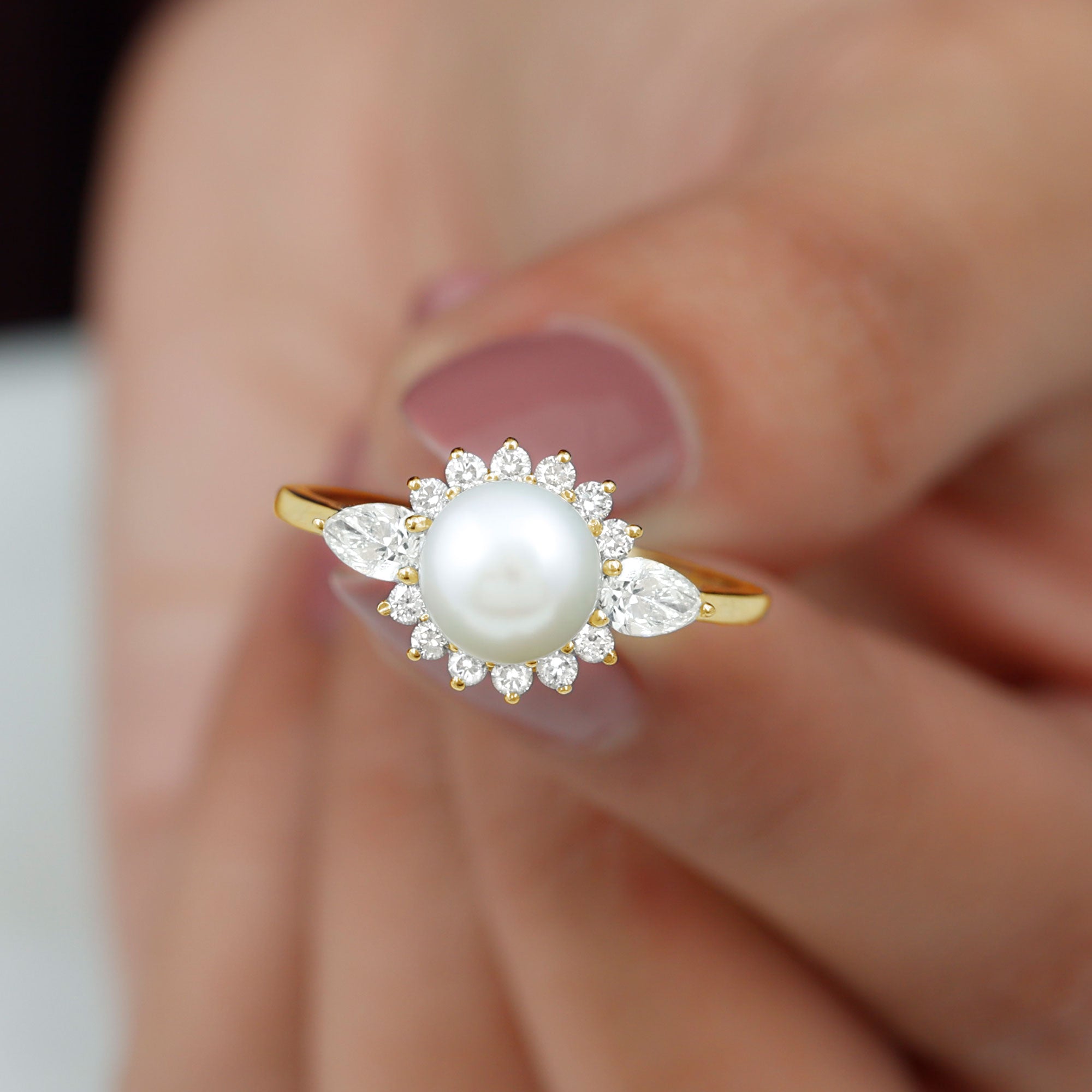 This Freshwater Pearl Halo Engagement Ring is a beautiful addition to any jewelry collection. Featuring a round-shape freshwater pearl as the centerpiece, surrounded by a halo of pear and Round Shape Diamond in a prong setting. The freshwater pearl displays AAA quality and is believed to bring faith, innocence, and personal integrity to the wearer. The durability and luster of this gem make it highly desirable.