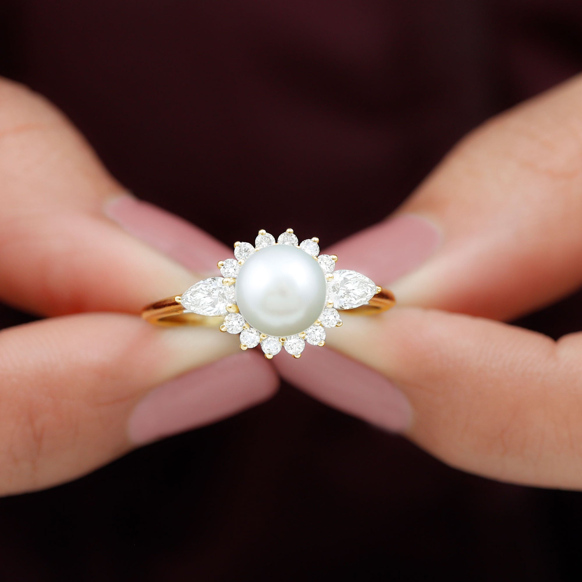 Classic Freshwater Pearl Halo Engagement Ring with Diamond