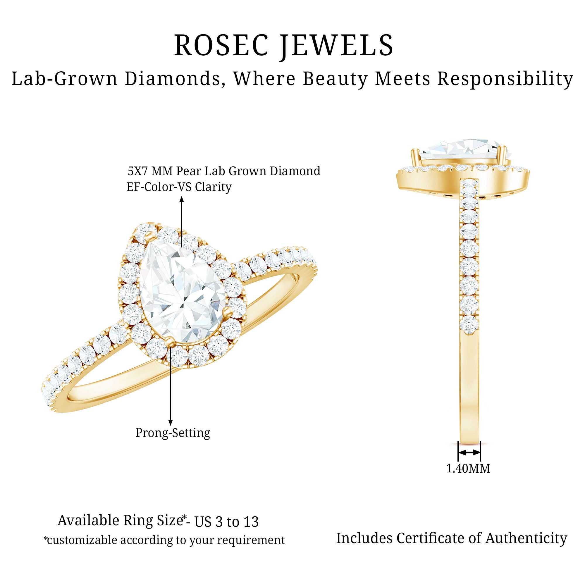 Illuminate yourself with the timeless beauty of this simple yet elegant Teardrop Engagement Ring adorned with a 5X7 MM Pear Shape Lab Grown Diamond gemstone set in 3 Prong Setting, surrounded by a sparkling round cut diamond Halo and side stones. This sparkling Lab Grown Diamond Ring will surely be a perfect option to wear on any special occasion and will give you a stunning look. This Pear Shaped Diamond Ring is designed to perfectly match your style, offering a variety of metal choices to suit your preferences. Additionally, it can be customized to fit your finger size ranging from US sizes 3 to 13, because every hand deserves a bit of sparkle like this. Whether you are planning a dream proposal or simply want a Diamond Halo Engagement Ring for her that expresses your love story, this piece has everything you need. It also includes a certificate of authenticity, ensuring you have complete peace of mind with your purchase. Celebrate every moment of your love story with this Timeless Engagement Ring.