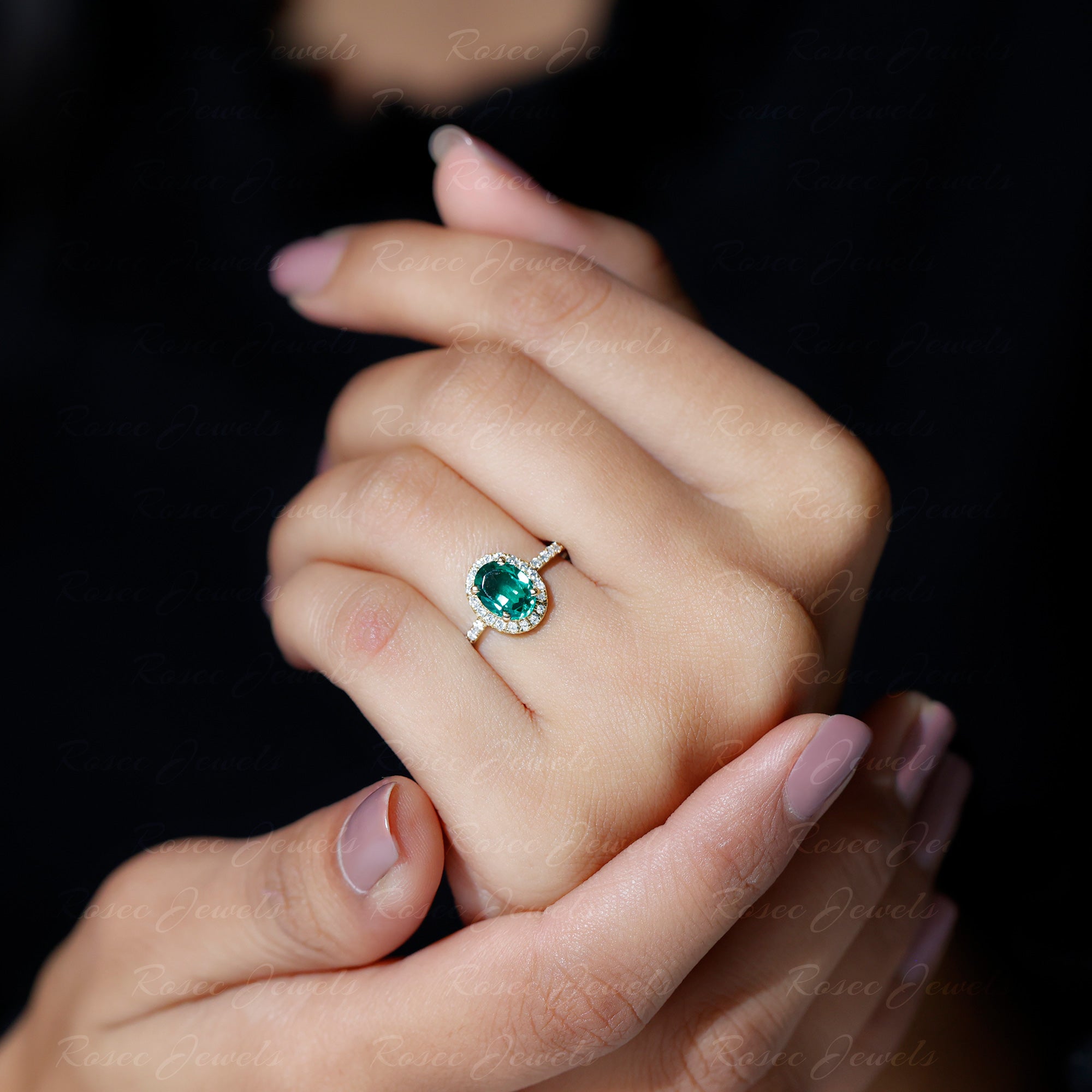 Dare to embrace simplicity with a touch of timeless elegance in this Oval Engagement Ring. At its center is a luminous 6X8 mm Oval Shape Lab Created Emerald set in Prong Setting, well known for its rich green hue, an elegant symbol of love, renewal, and lasting commitment. Surrounding the Lab Emerald is a delicate Diamond Halo that amplifies its brilliance, creating a subtle yet captivating sparkle that catches the light from every angle. What truly sets this Lab Grown Emerald Ring apart is the thoughtful design of Diamond side stones that gracefully adorn the slim band. They add just the right amount of shimmer, creating a harmonious balance between bold color and understated glamour. The slim band ensures a sleek, modern look that fits effortlessly, making this Emerald Diamond Engagement Ring perfect for everyday wear or special occasions. This Lab Created Emerald Ring for Engagement is about celebrating refined beauty and meaningful symbolism. Whether you are about classic style or seeking a forever piece that blends tradition with contemporary grace, this Emerald Halo Ring stands as a quiet yet powerful statement of enduring love.
