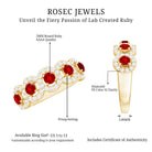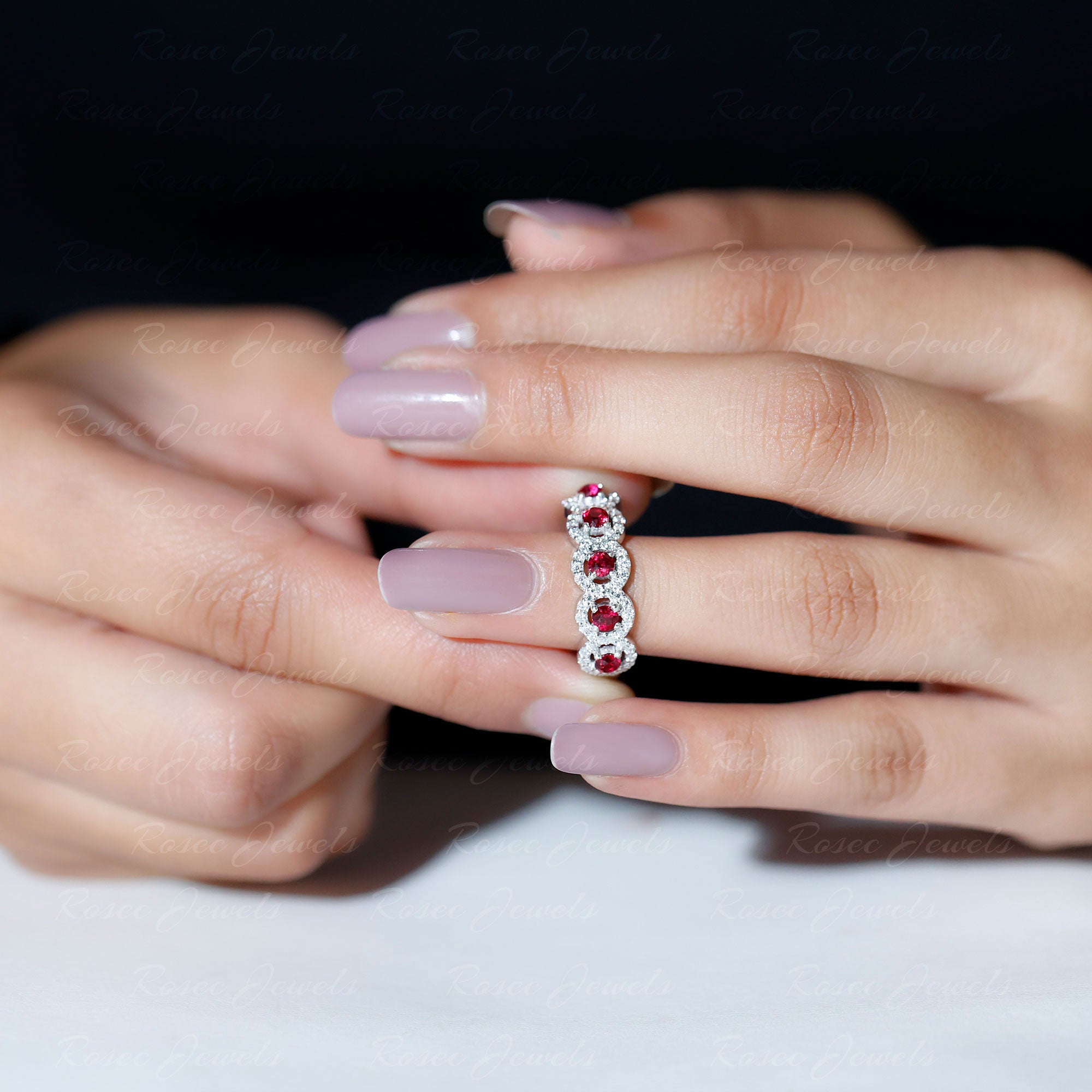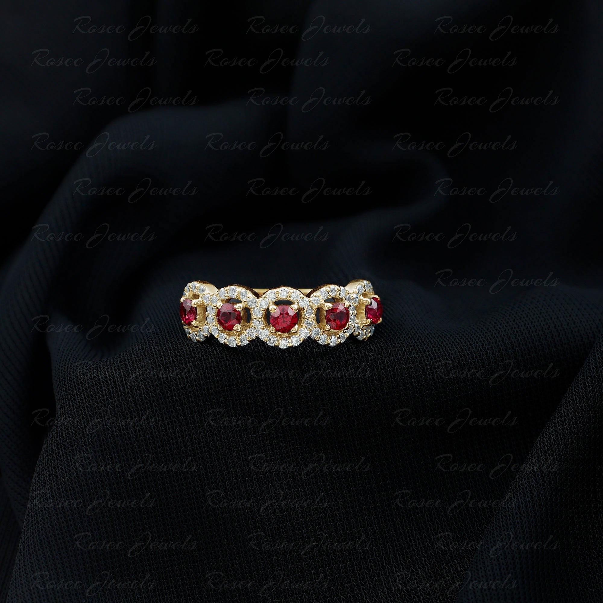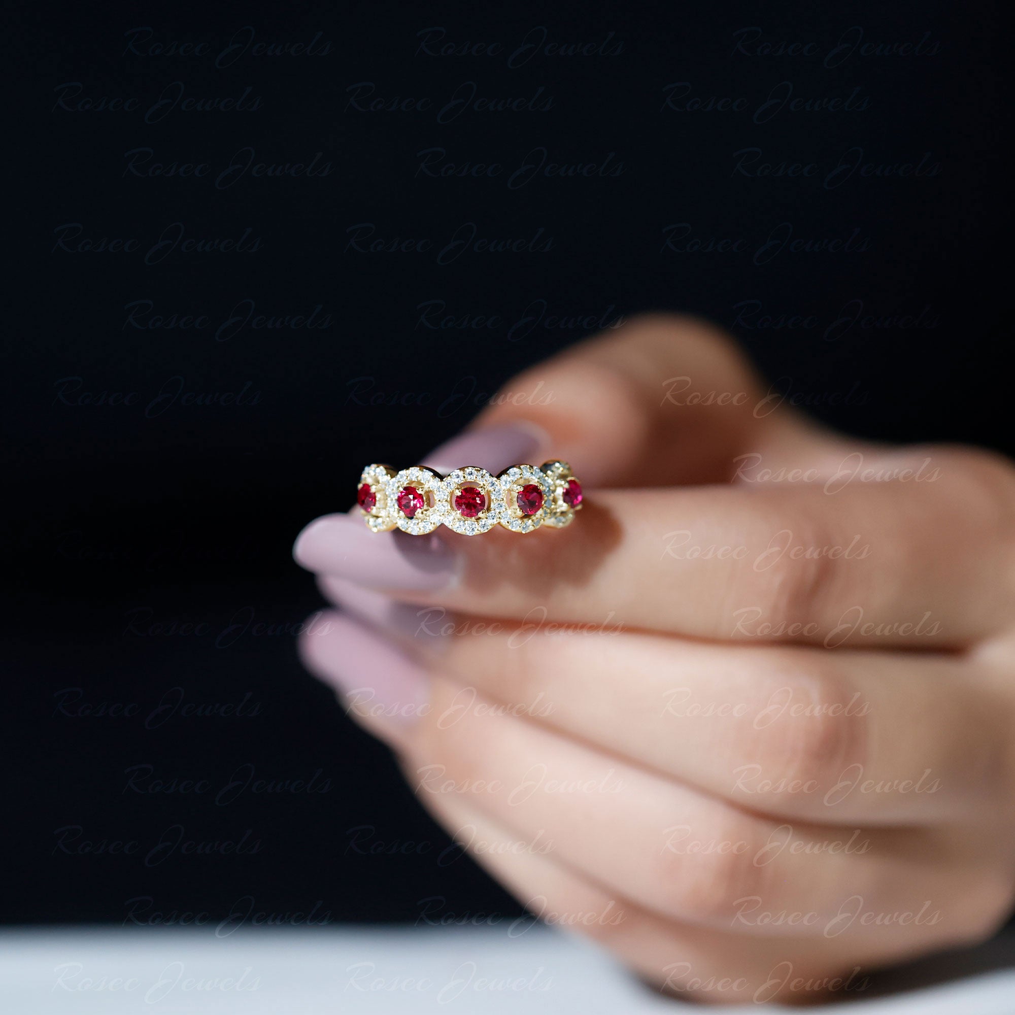 Mark your significant milestone with the sophistication of our Half Eternity Band Ring. This eternity ring boasts round-cut lab created ruby gems securely nestled in a prong setting, accentuated by a Diamond Halo, making it a captivating choice for your beloved. Meticulously crafted in a variety of metal options, it radiates a luxurious charm that contributes to its overall allure and elegance.