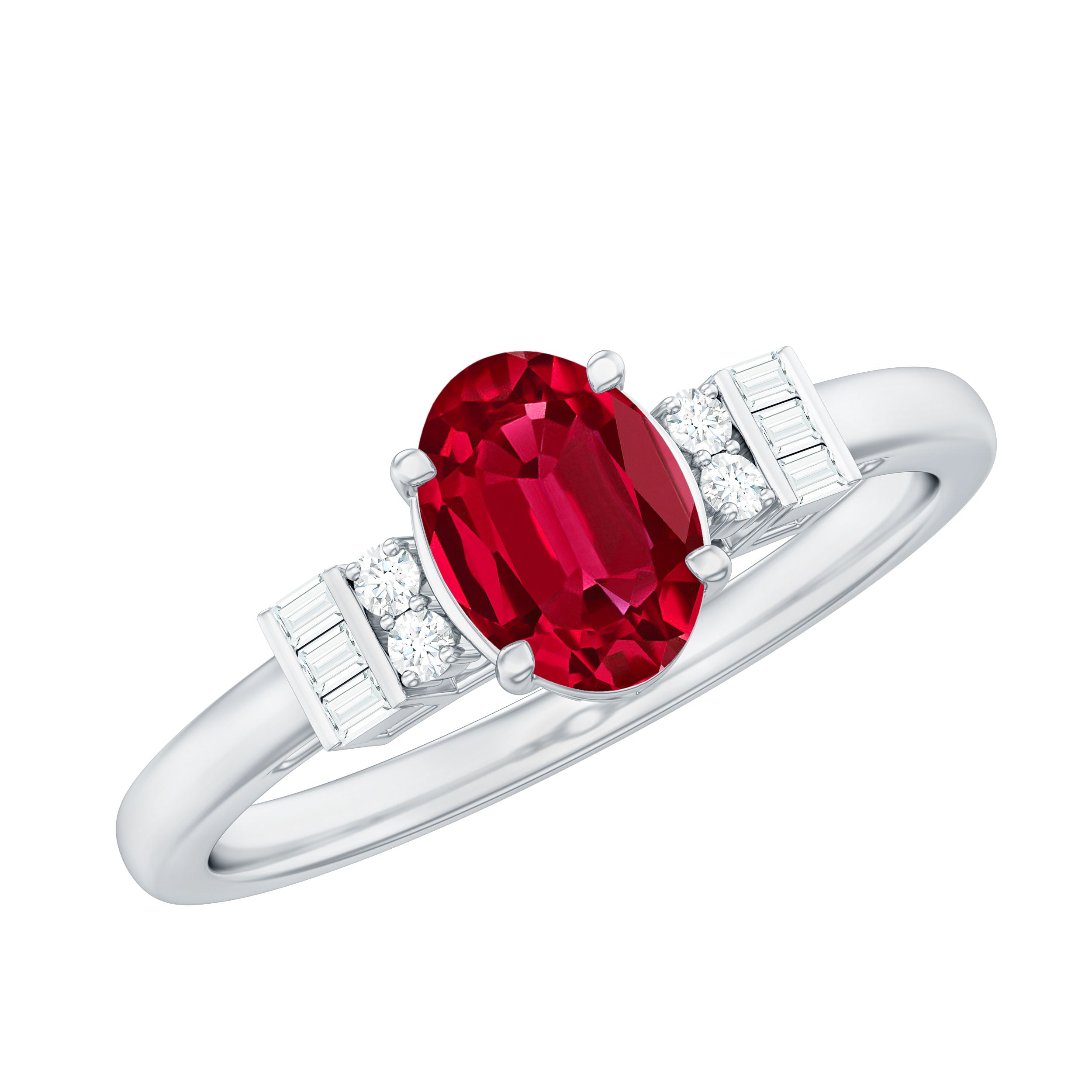 Surprise her with this Lab Grown Ruby Engagement Ring that speaks louder than words, elegant, vibrant, and full of meaning. The gorgeous design centers around a 6X8 MM oval cut lab created ruby. Its deep color instantly draws attention, making it a piece that feels both powerful and graceful at the same time. On each side of the ruby, baguette and round cut diamonds are carefully set, adding the right amount of sparkle and sophistication. The contrast between the AAAA quality lab grown ruby and HI color and SI clarity diamonds creates a breathtaking effect that is hard to miss. Every detail, from the smooth band to the perfectly aligned stones, reflects quality craftsmanship and thoughtful design. What makes this Ruby and Diamond Ring special is its perfect mix of classic charm and modern flair. Together, they create a balance that is elegant, ideal for women who love jewelry with personality and style. Whether it is for an engagement, an anniversary, or just because she deserves something beautiful, this Oval Cut Engagement Ring is a true showstopper. Comfortable for everyday wear yet dazzling enough for special occasions.