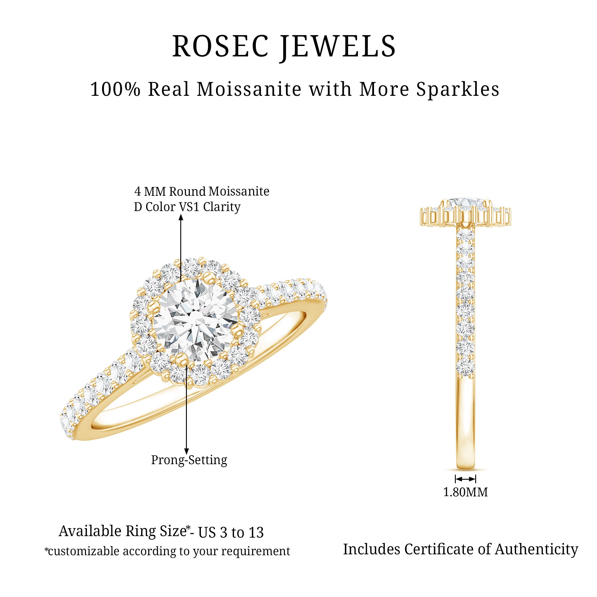 Significant moments deserve a touch of brilliance - this Moissanite Engagement Ring is here to make a statement with its remarkable shine. At the heart of this Circle Engagement Ring lies a 4 MM round cut moissanite, securely set in prongs and encircled by a breathtaking halo of delicate round cut stones. The band, adorned with moissanite, enhances the sparkle from every angle, perfectly merging simplicity with elegance. This timeless piece is designed to make your moment truly unforgettable. Dont miss out on this Moissanite Halo Ring and let your forever shine even more brightly. It embodies the enchanting allure of a Timeless Engagement Ring, crafted with expertise and offering a range of metal options to suit your taste. With sizes ranging from 3 to 13 based on US standards, we also include a complimentary ring sizer to ensure you find your ideal fit without any last-minute worries. Delivered in a signature jewelry box thats perfect for gifting, this Halo Engagement Ring guarantees that every occasion is special for your Girlfriend, Fiancee, Wife, or Mother.