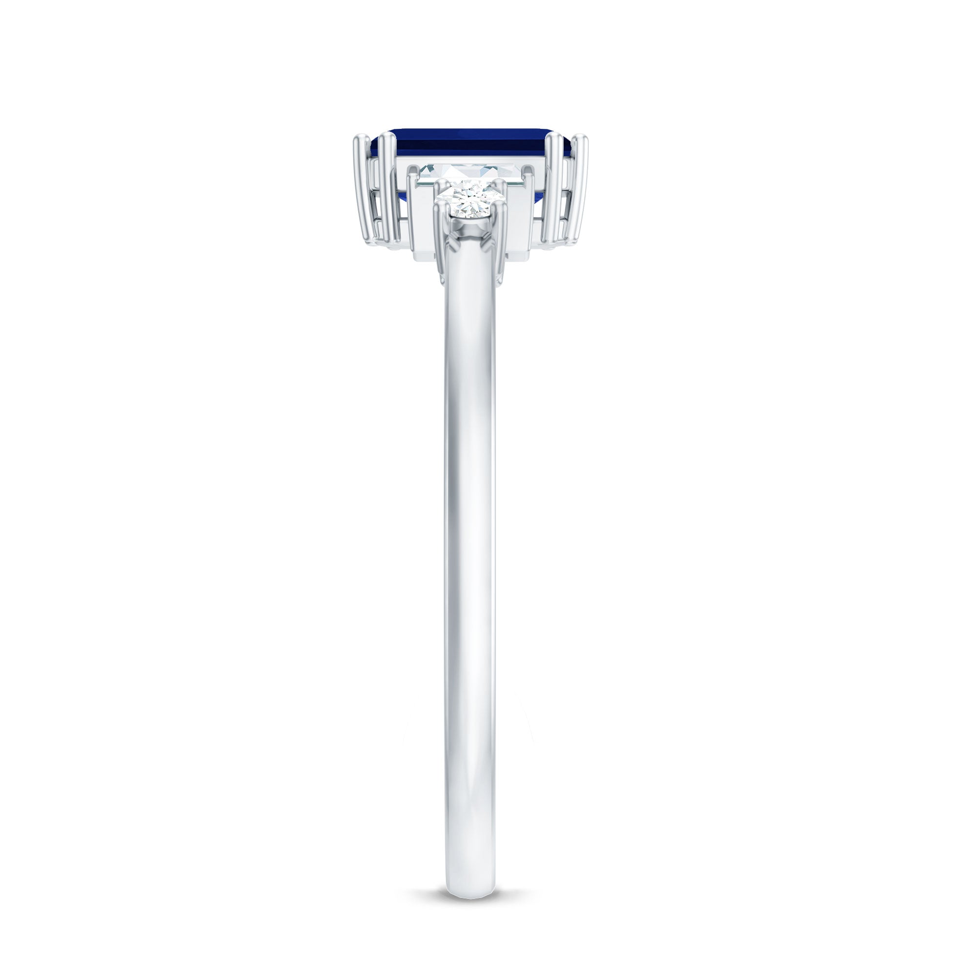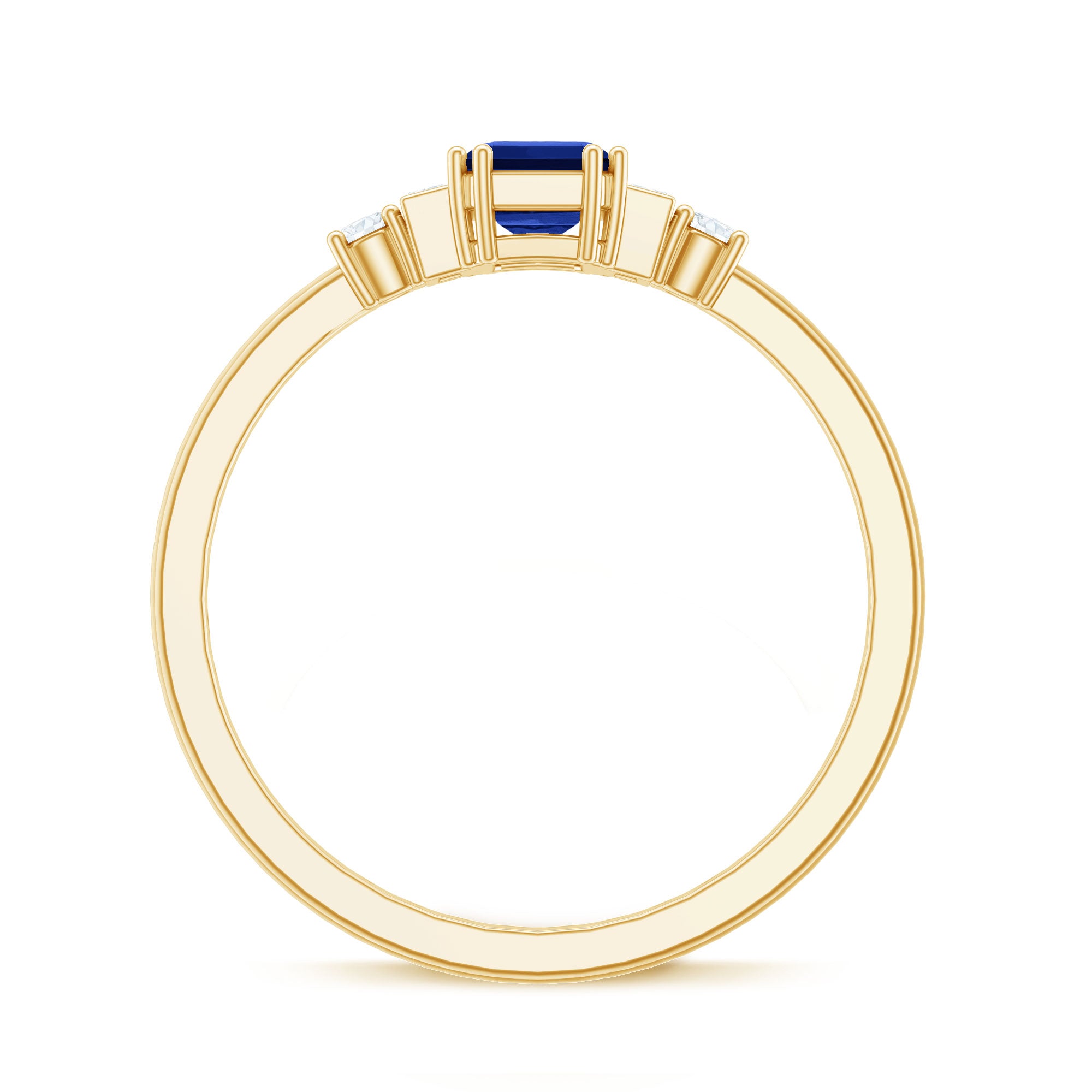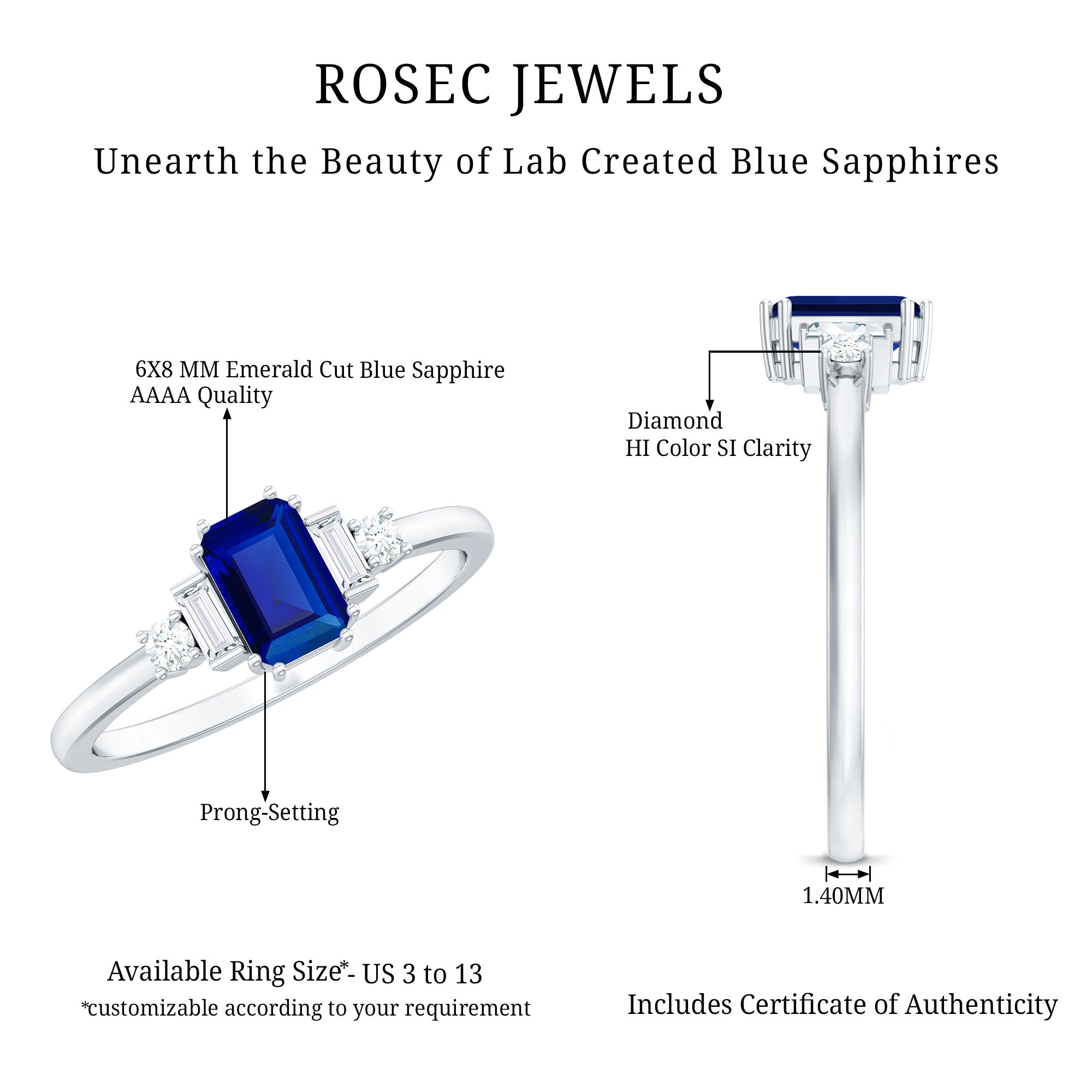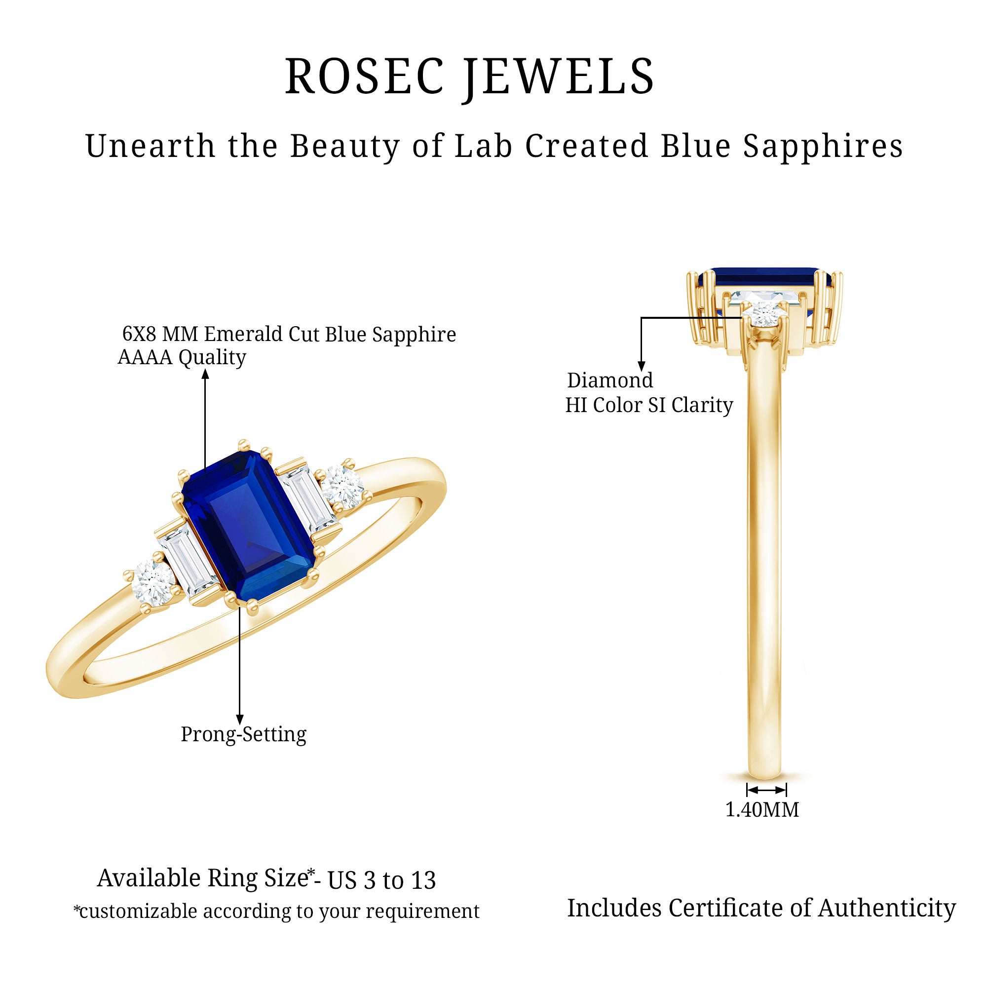 Elevate your style with this exquisite Minimal Ring, adorned with an Octagon Cut Created Blue Sapphire Solitaire in a secure Prong Setting and Diamond Side Stones. This Created Blue Sapphire Ring is an excellent choice for an Engagement Ring, if youre in the market for one.