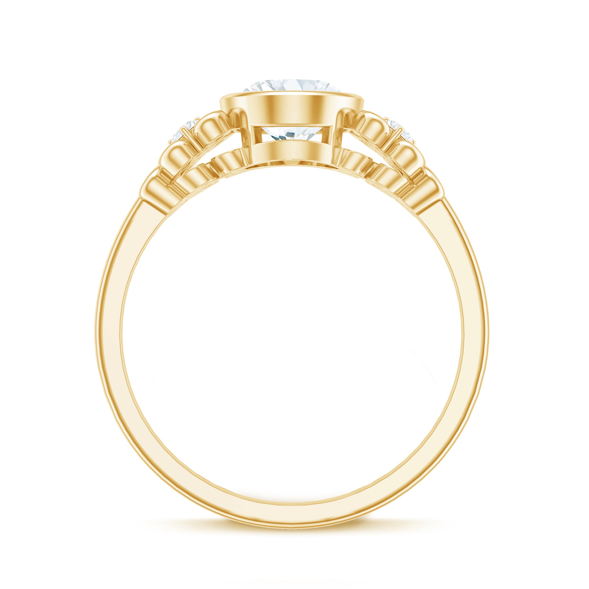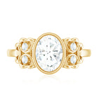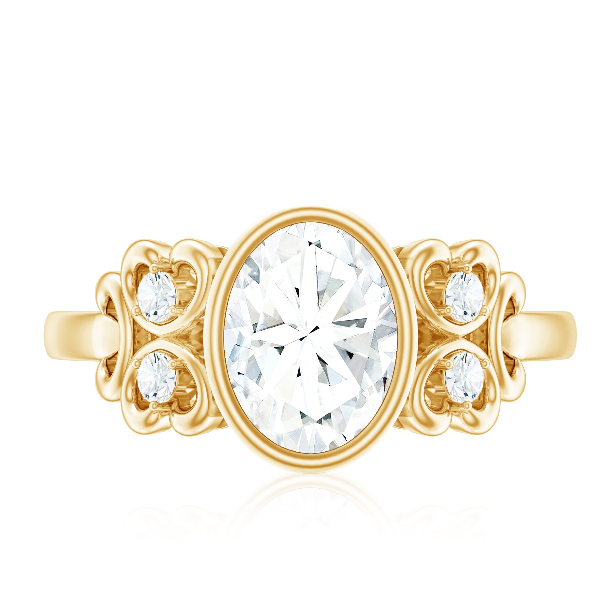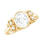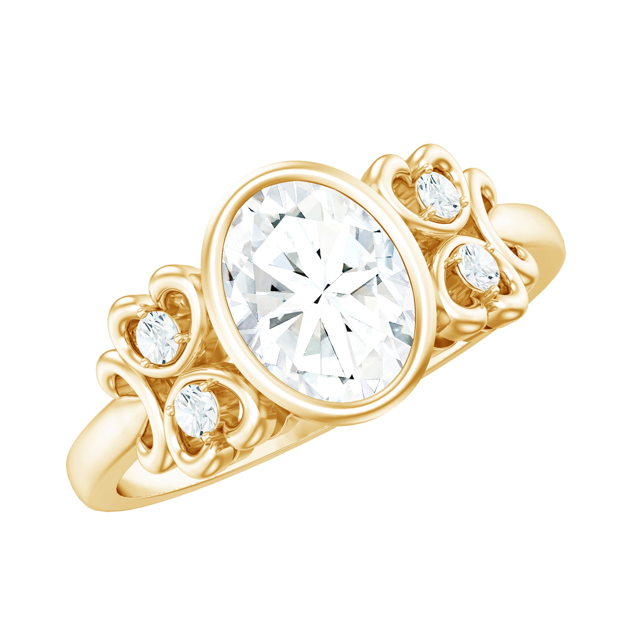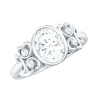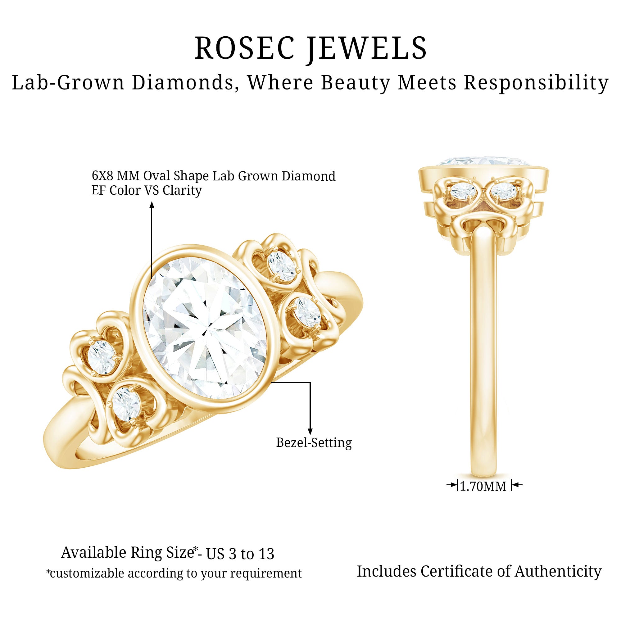 In this stunning Solitaire Engagement Ring, a magnificent Oval Shape Lab Grown Diamond takes center stage, elegantly cradled in a secure bezel setting. It is complemented by sparkling round Lab Grown Diamonds gracefully positioned on each side of the center stone. This Lab Grown Diamond Engagement Ring exudes an artistic and striking aesthetic, adding a touch of timeless beauty to the ring. It captures attention and admiration, making it the perfect choice to symbolize your love and commitment without the need for any enhancements.