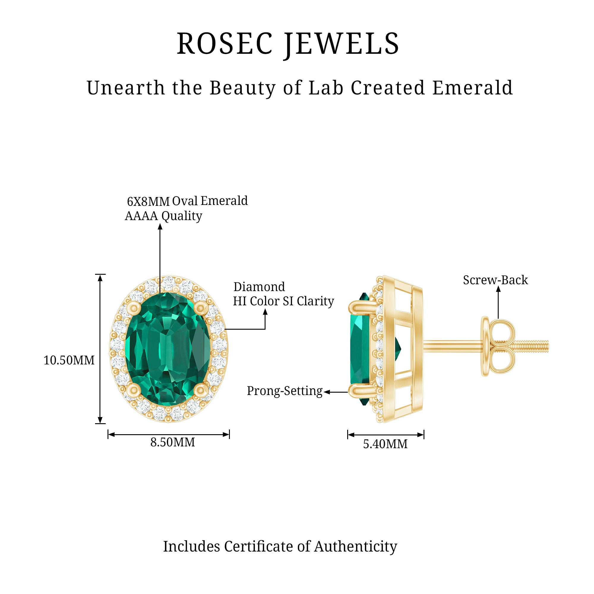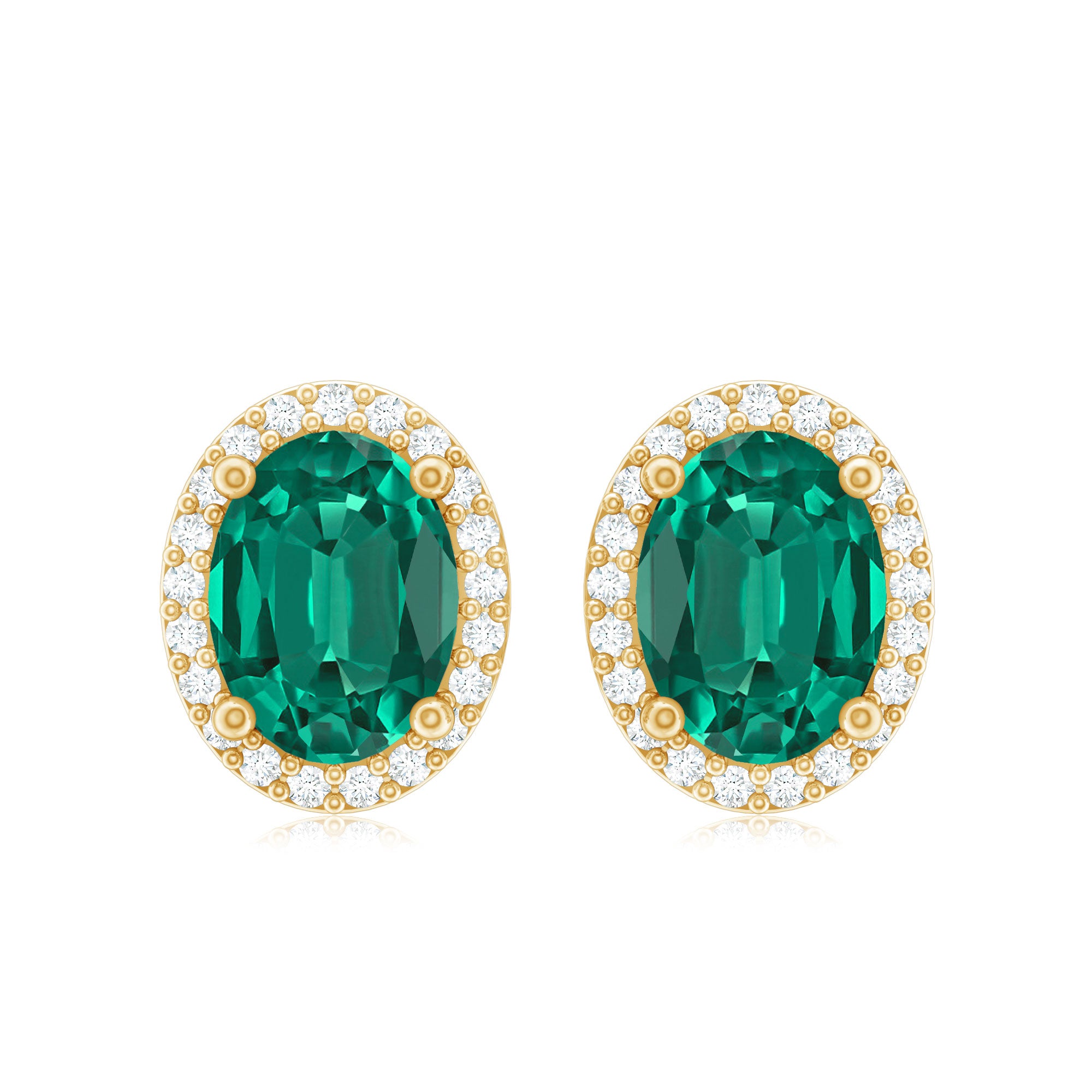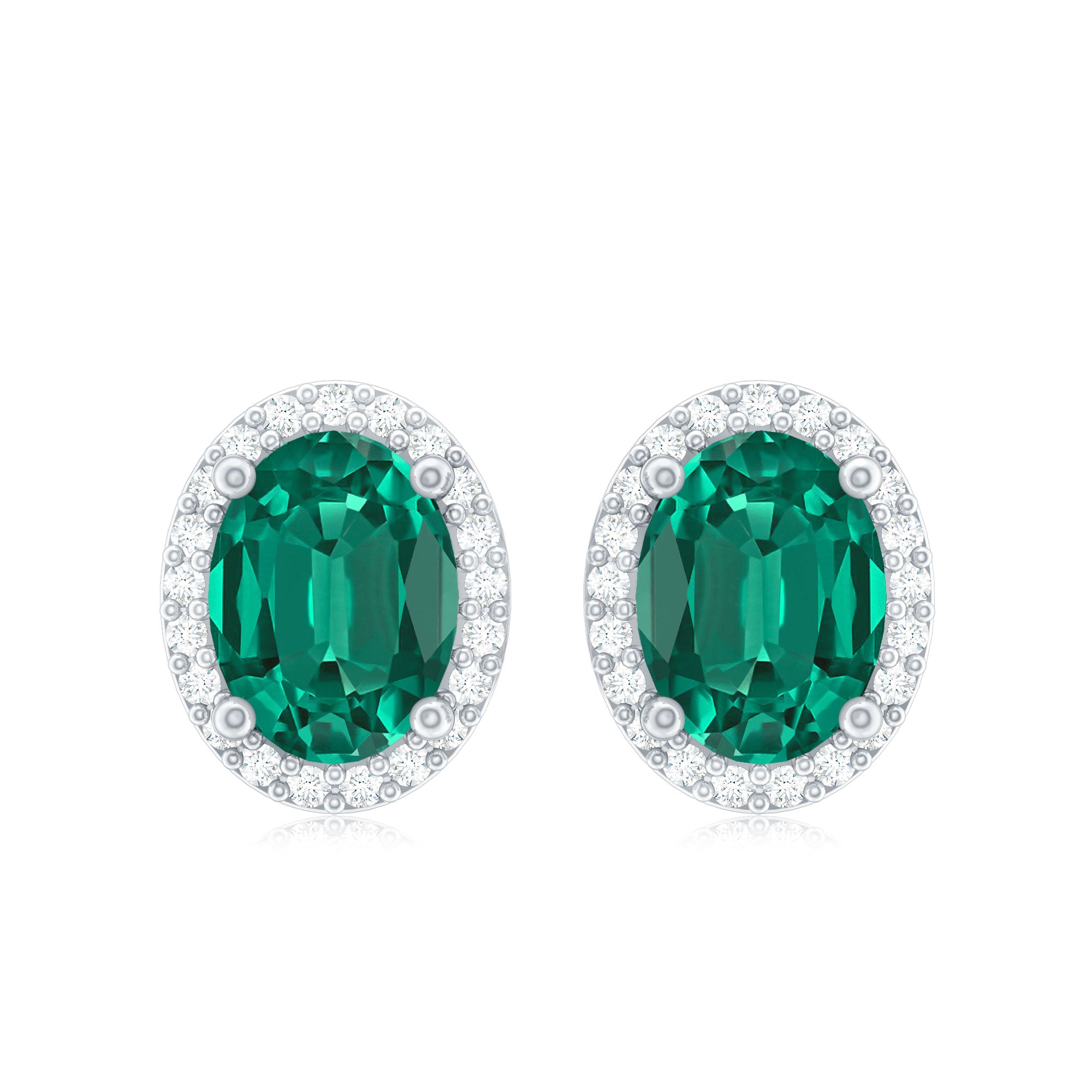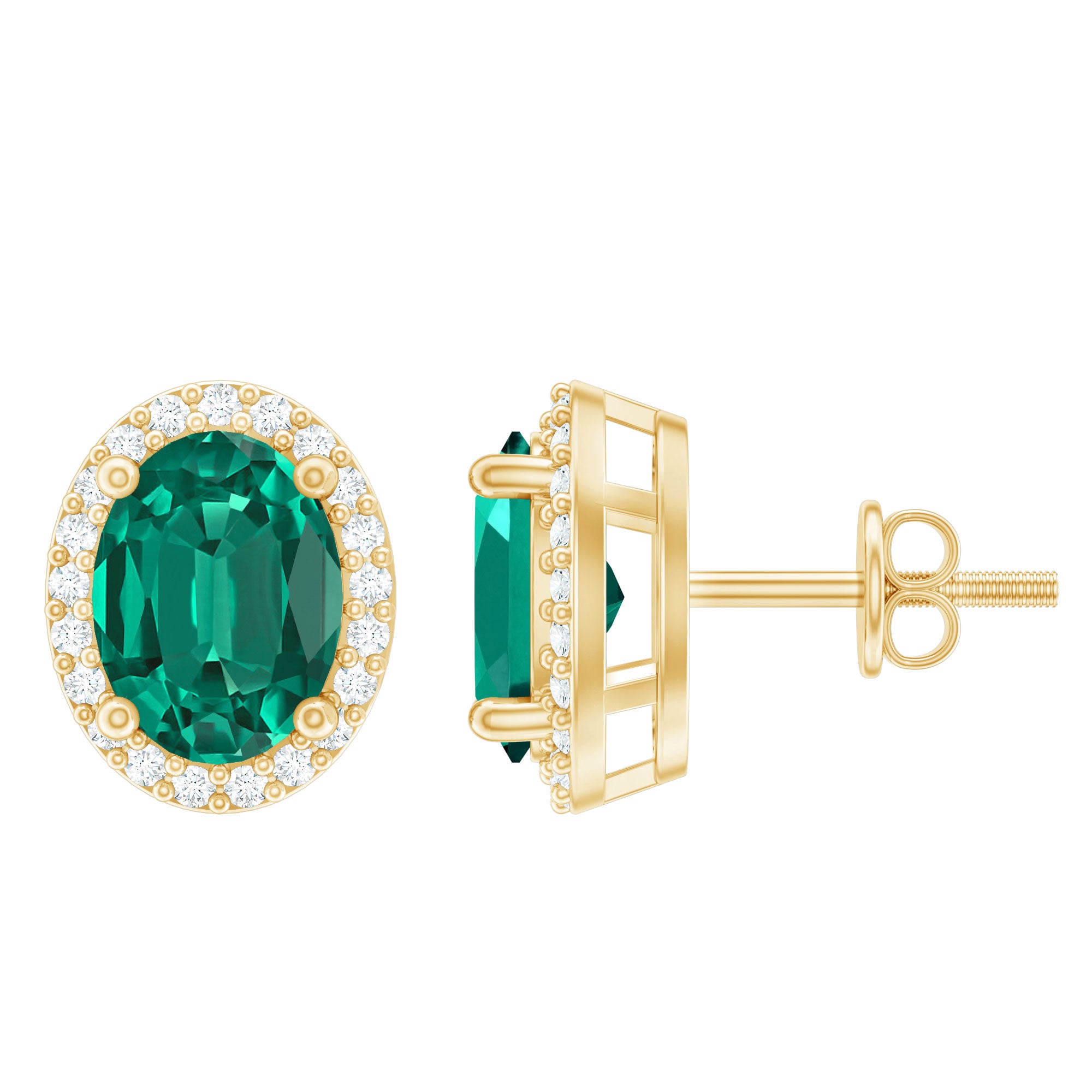 Adorn your ears with our Emerald Halo Stud Earrings, designed to elevate all your looks. Embellished with oval-shaped lab-created emerald exquisitely set in 4 prong setting with round diamonds around it, making these emerald earrings a stunning piece that deserves to be in your jewelry wardrobe. With the help of screw-back closures, you can easily put on and take them off without any hustle. Get this glamorous accessory for your party-wear looks and draw the eyes with its mesmerizing hue. Present these emerald studs to your beloved as they make a lovely birthday present for them.