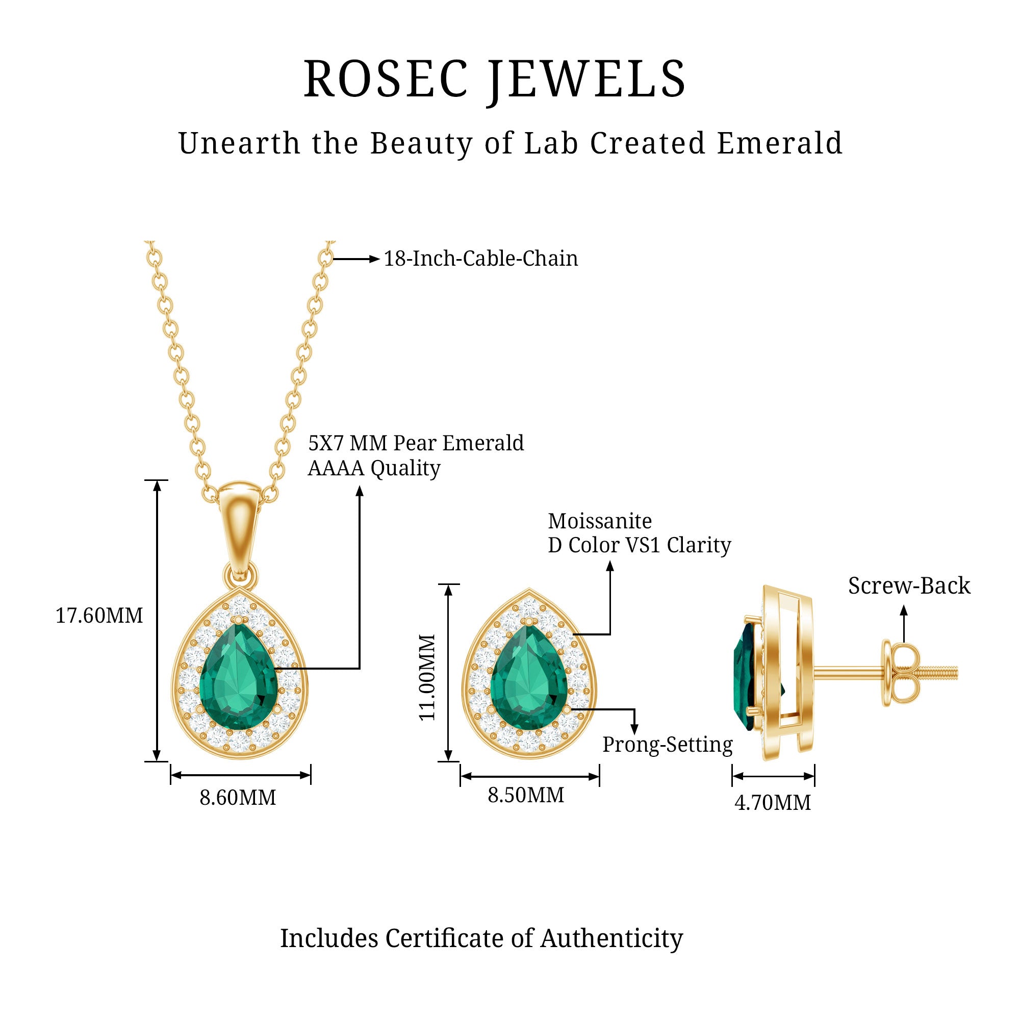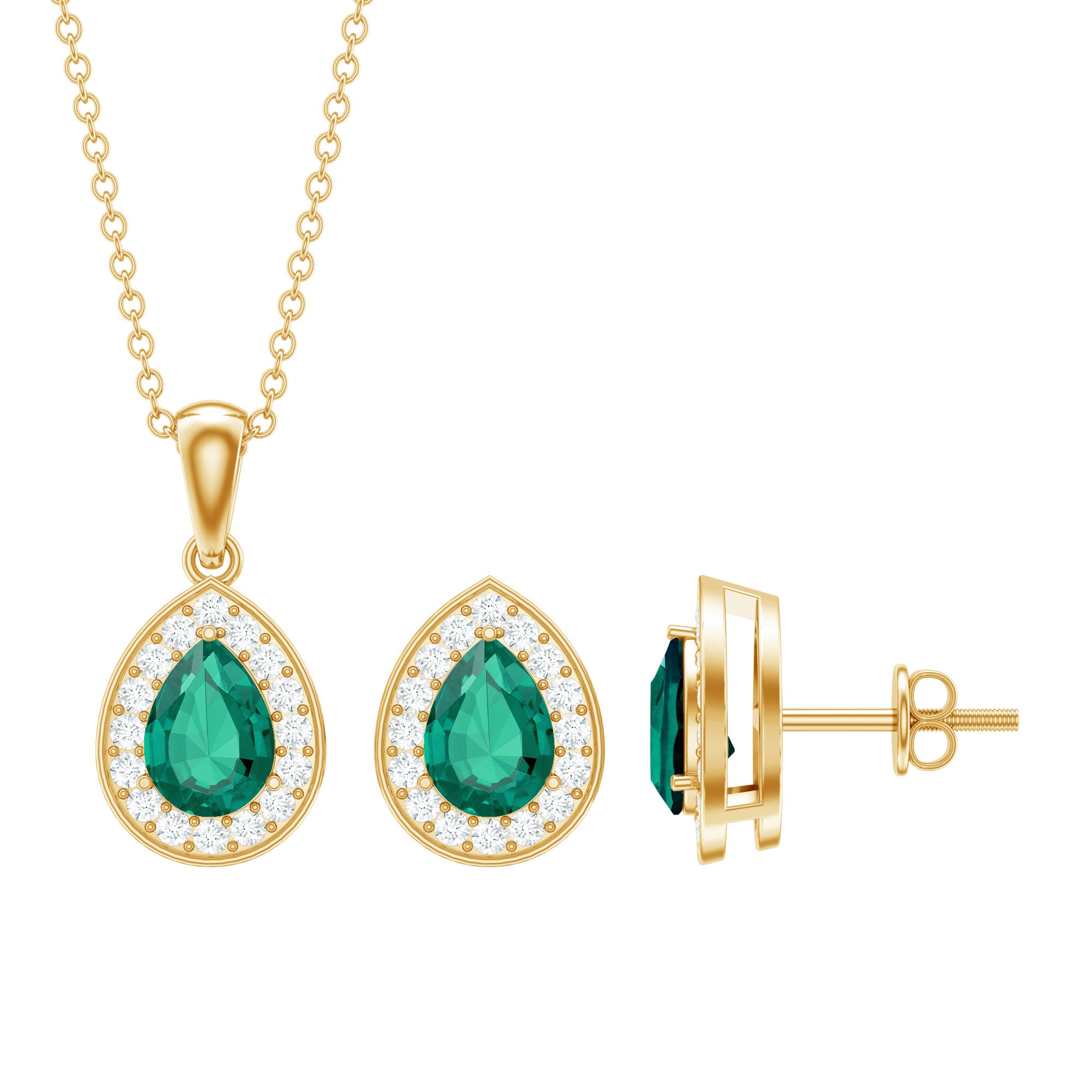 Step into the spotlight with our Teardrop Jewelry Set, a shimmering classic jewelry to make you shine bright like a star. The artfully crafted pendant and earrings are embellished with pear-shaped emerald surrounded by round moissanite stones, exuding endless sparkle. The deep green hue complimented by sparkling moissanite makes this jewelry a must-have in your collection. Elevate your style and make head turns when you wear this lab created emerald jewelry set, a unique, attractive, and sparkly piece only made for you.