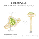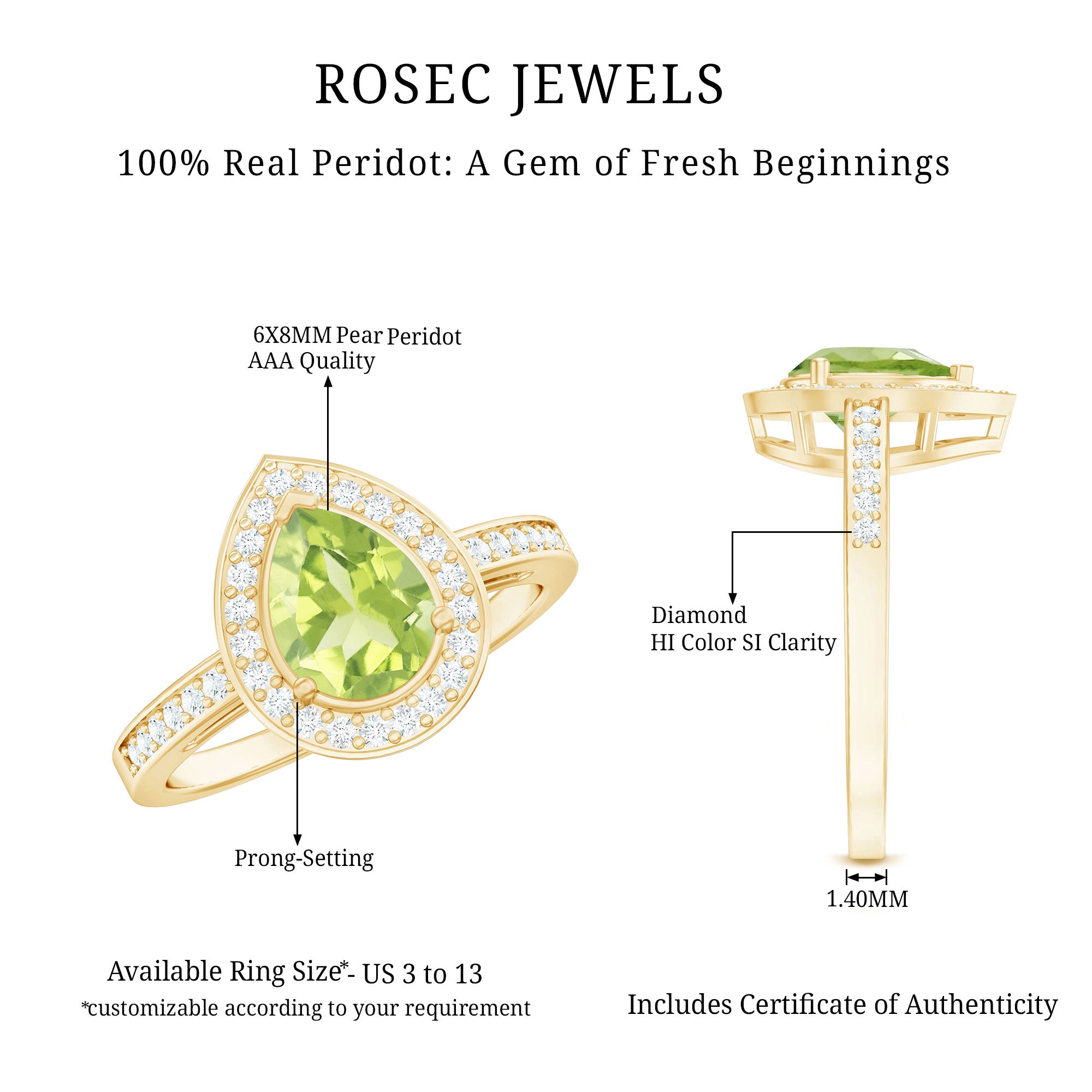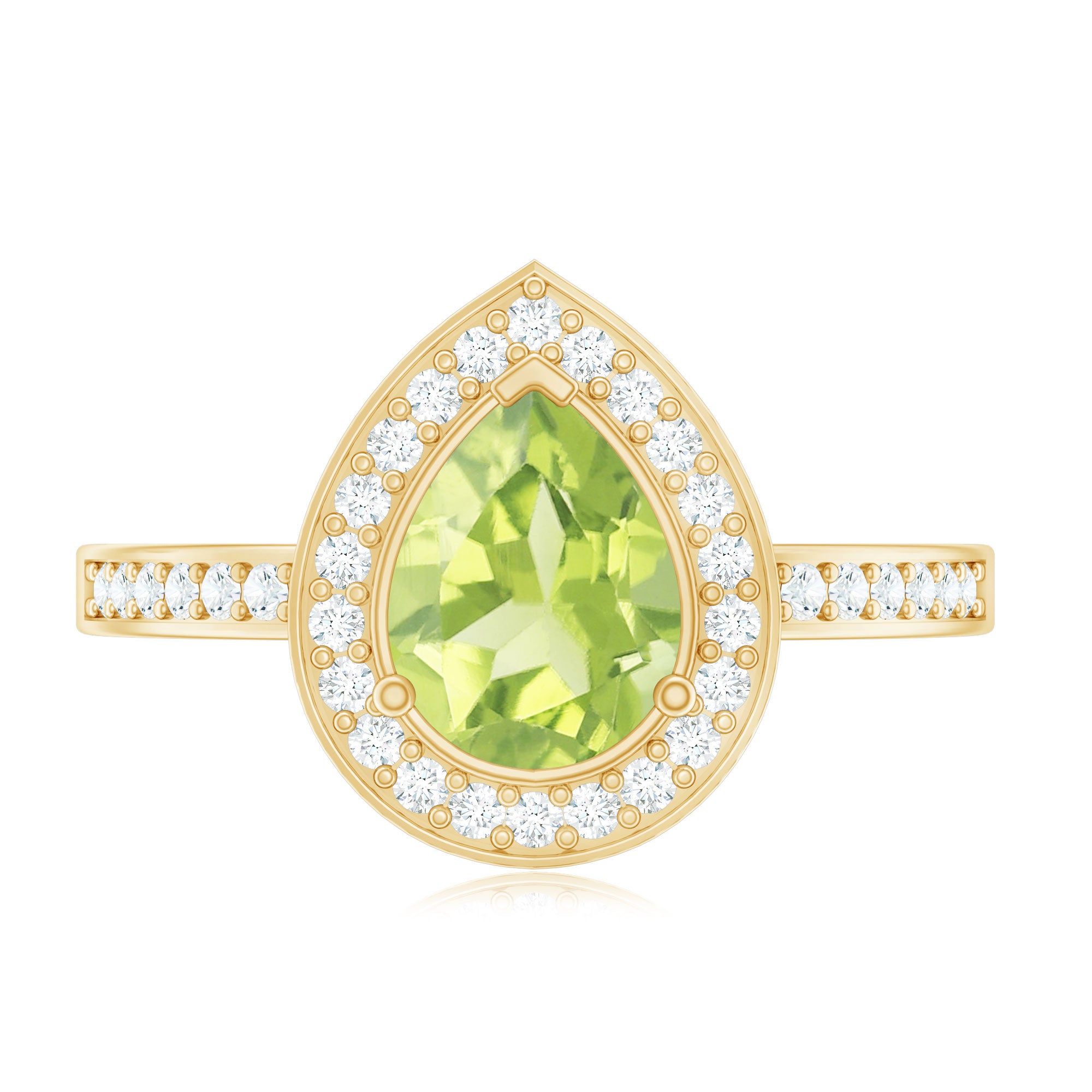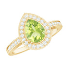 Get this alluring Peridot Engagement Ring adorned with Pear Cut Peridot in Prong Setting and more dainty Round Shape Diamonds studded as Halo and on the shank. The Peridot Ring will make her look elegant when paired with special attires. Declare your feelings for your partner by getting this Halo Ring and she will find reasons to wear it again and again.