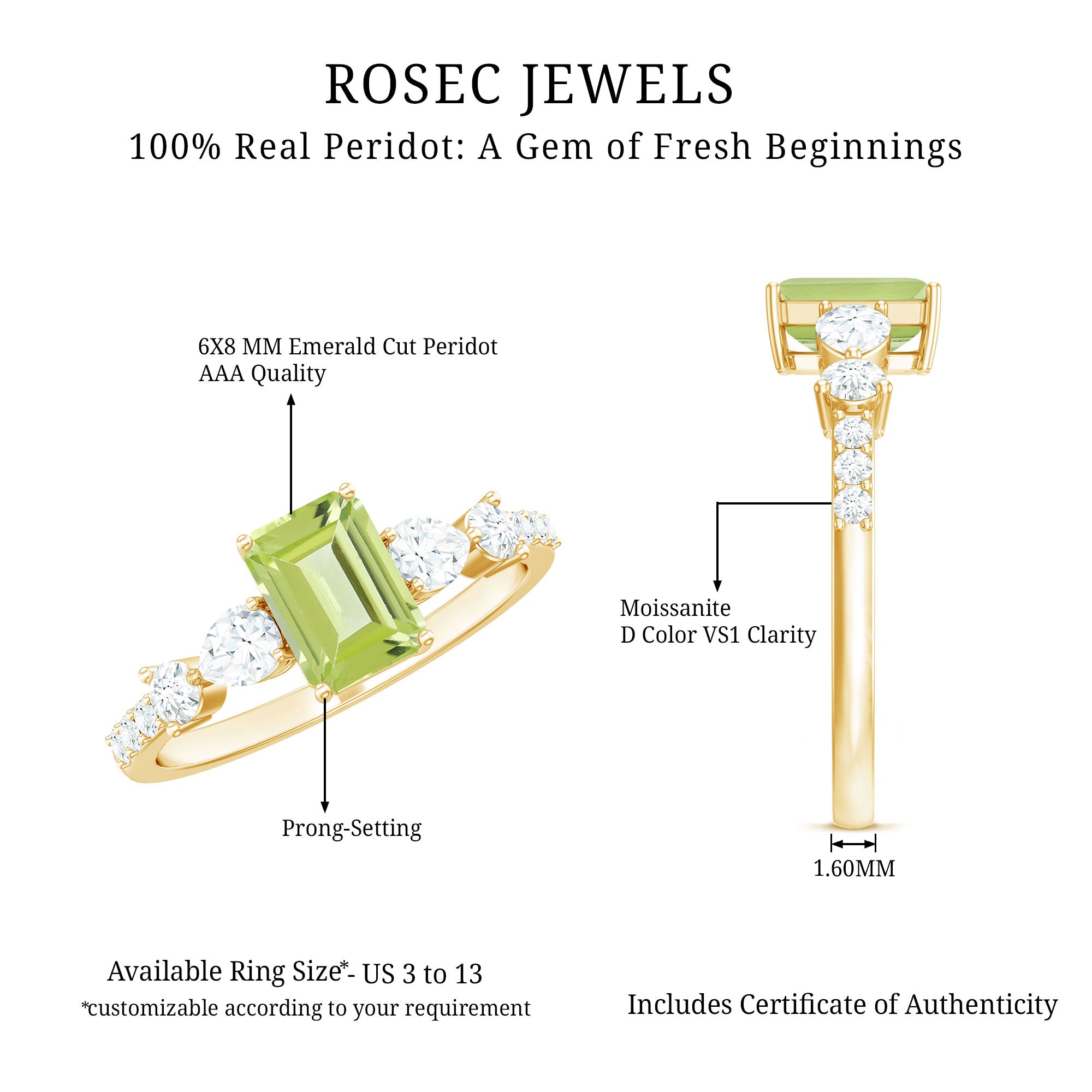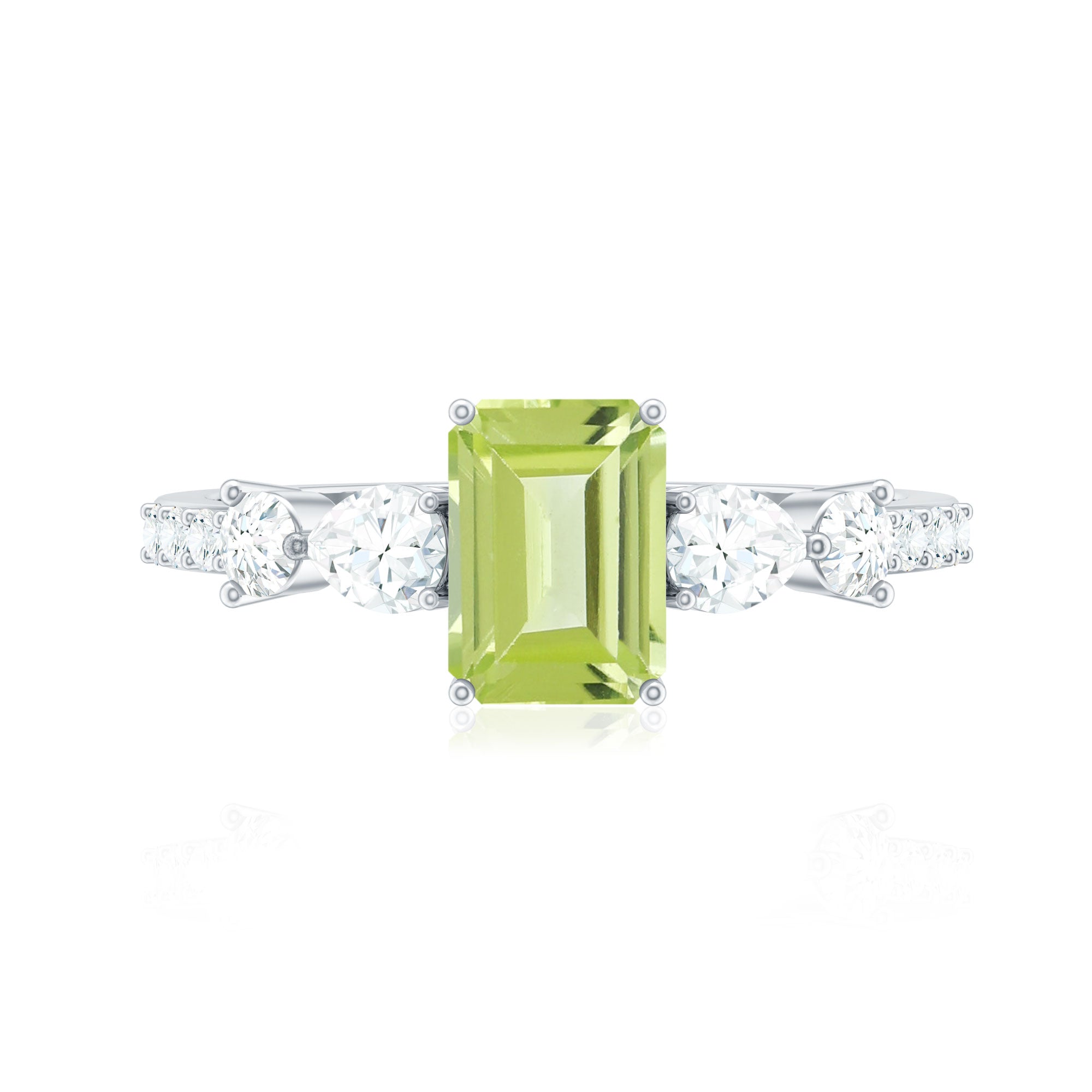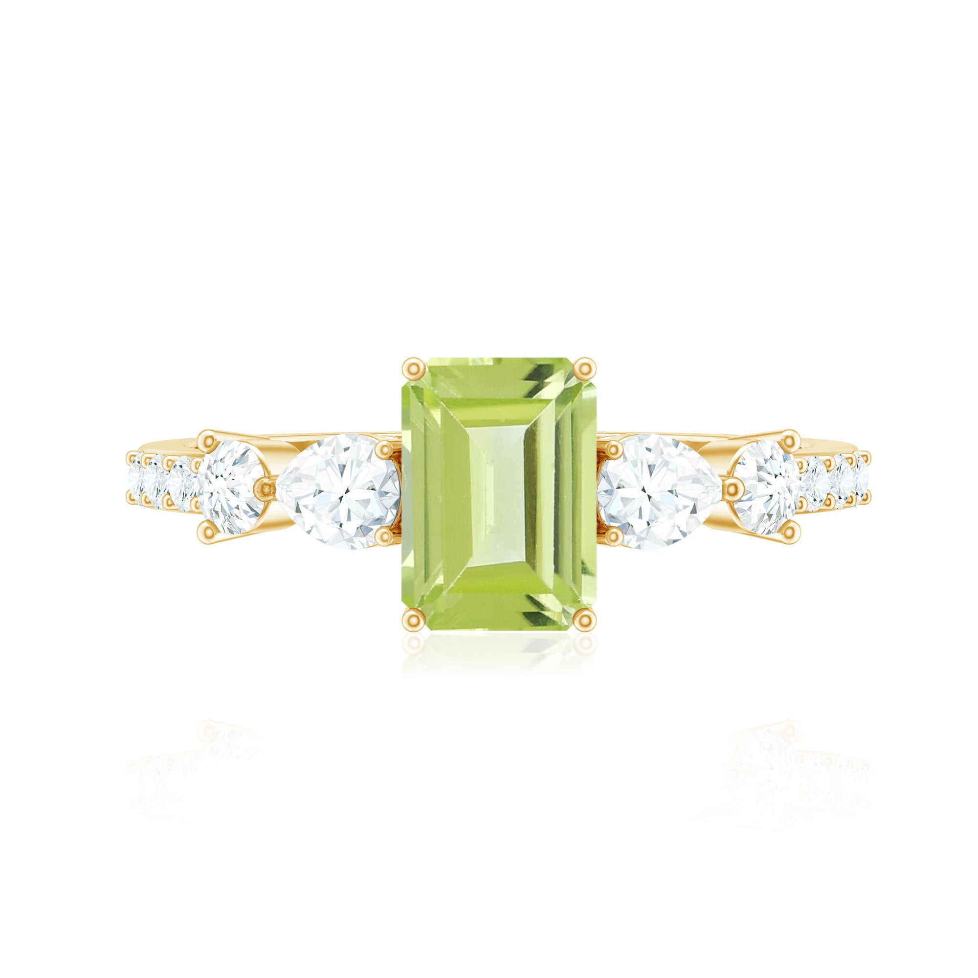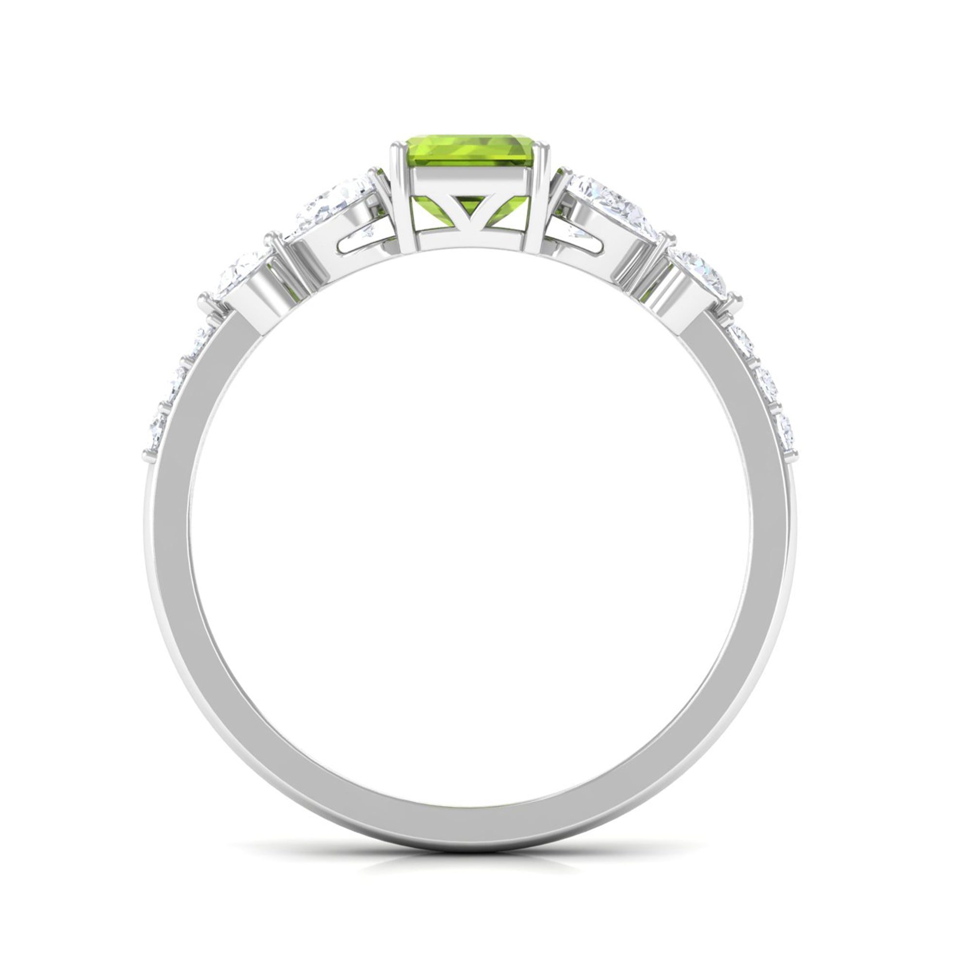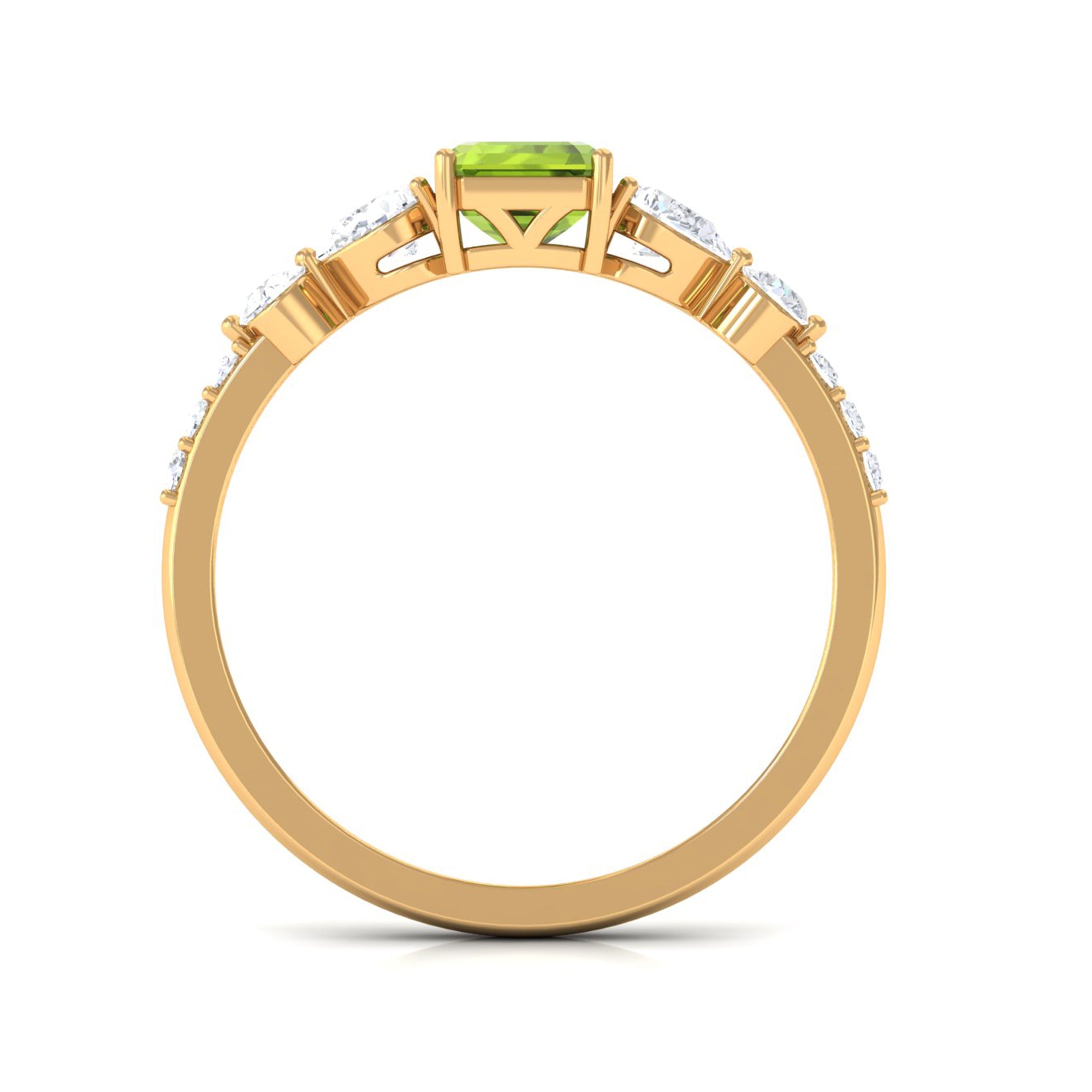 Put a stylish spin on your look by wearing this awesome Solitaire Ring embellished with Octagon Cut Peridot in Prong Setting with Round and Pear Cut Moissanite Side Stones. Crafted with Gold, this Peridot Ring will bring more shine and allure to your look. This Peridot Stone Ring will make you look out from the crowd.