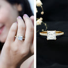 Celebrate the one of a kind love that you two share with a Moissanite Solitaire Ring. Weighing a whopping 3 CT, it highlights the Center Stone of 8 MM Princess Cut Moissanite that is held tightly by Peg head Setting. Lending this Moissanite Engagement Ring more character are the side-stones of Round Cut Moissanite in Double Prong Setting. Grab this Square Engagement Ring which is a perfect blend of timeless and elegant style. Your lady will be astonished by the remarkable shine of D-VS1 quality Moissanites embedded in the ring. Mark the special day memorable forever with this Princess Cut Engagement Ring precisely crafted by Rosec Jewels.